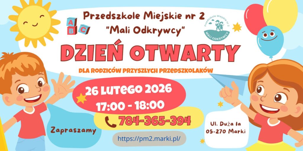 serdecznie zapraszamy Państwa na Dzień Otwarty dla Rodziców w związku z nadchodzącą rekrutacją do przedszkoli na rok szkolny 2026/2027. Spotkanie z Rodzicami odbędzie się dnia 26.02.2026 r. o godzinie 17 i będzie trwało do godziny 18.