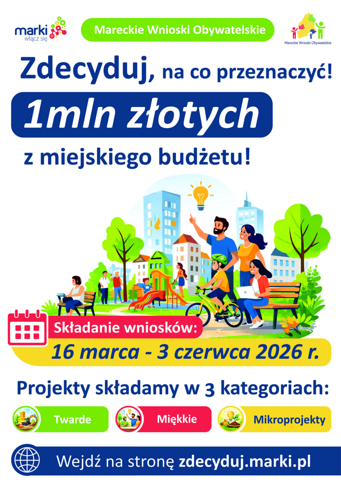 | „Aktywność mieszkańców Marek ma znaczenie! Co roku mieszkańcy decydują o tym, jak wydatkować część budżetu miejskiego. To Wy zgłaszacie projekty, głosujecie na nie i wybieracie te najlepsze, które następnie przechodzą do realizacji. W tym roku czekamy na Wasze pomysły od 16 marca do 3 czerwca do 16:00. Utrzymujemy zwiększoną kwotę 1 000 000 zł. na zadania w ramach MWO. 650 tys. zł przeznaczymy na projekty twarde (inwestycyjne), na projekty miękkie (np. koncerty, warsztaty, szkolenia) 250 tys. zł., zaś na kategorię mikroprojektów pulę 100 000 zł. To możliwość dla lokalnych inicjatyw, które wcześniej mogłyby mieć problem z rywalizowaniem z większymi projektami. Maksymalna kwota na mikroprojekt to 25 tys. zł, co oznacza, że co najmniej cztery takie projekty trafią do realizacji w 2027 roku. Na mieście w wielu miejscach znajdziecie charakterystyczne tabliczki, które informują o inwestycji ze środków pochodzących z budżetu obywatelskiego. Może to będzie inspiracją do składania projektów w tegorocznej edycji MWO? Wszystkie niezbędne do wypełnienia druki, żeby poprawnie złożyć wnioski znajdują się na stronie www.zdecyduj.marki.pl. Wypełnione dokumenty należy złożyć na kancelarię Urzędu Miasta. Zachęcam do składania pomysłów do realizacji w ramach MWO w 2027 roku. Jacek Orych, Burmistrz Miasta Marki” |