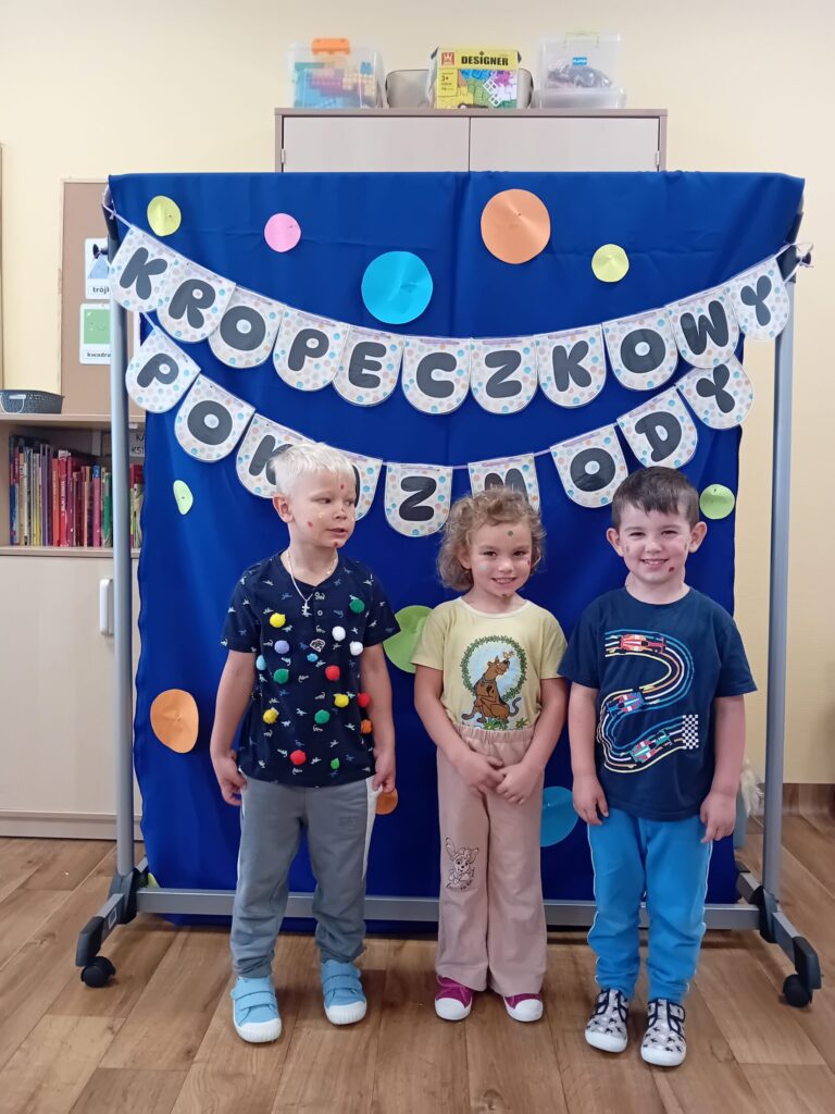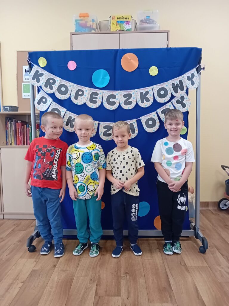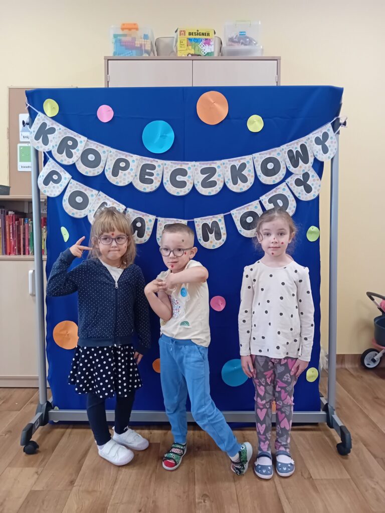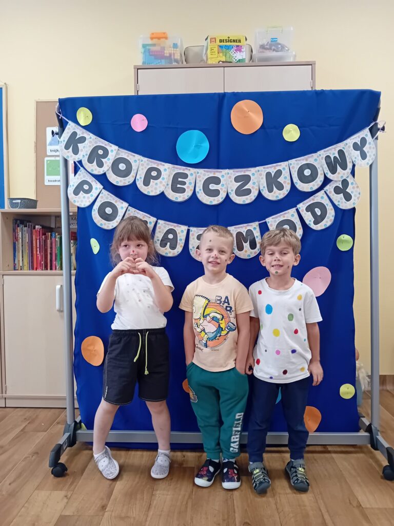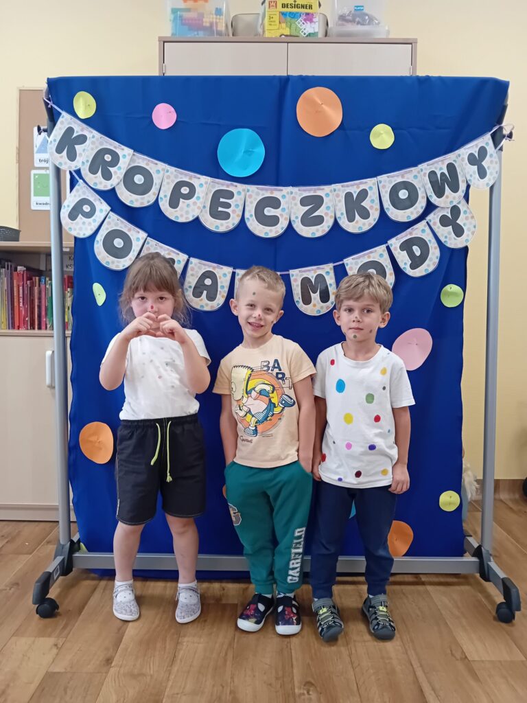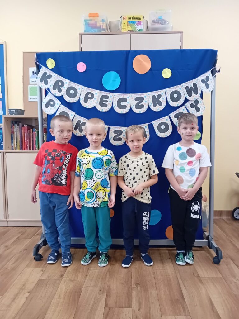 Galeria zdjęć przedstawia dzieci biorące udział w dniu kropki. Dzieci tańczyły do muzyki, segregowały je wg kolorów oraz wykonały pracę plastyczną, pt. „Osobista kropeczka”