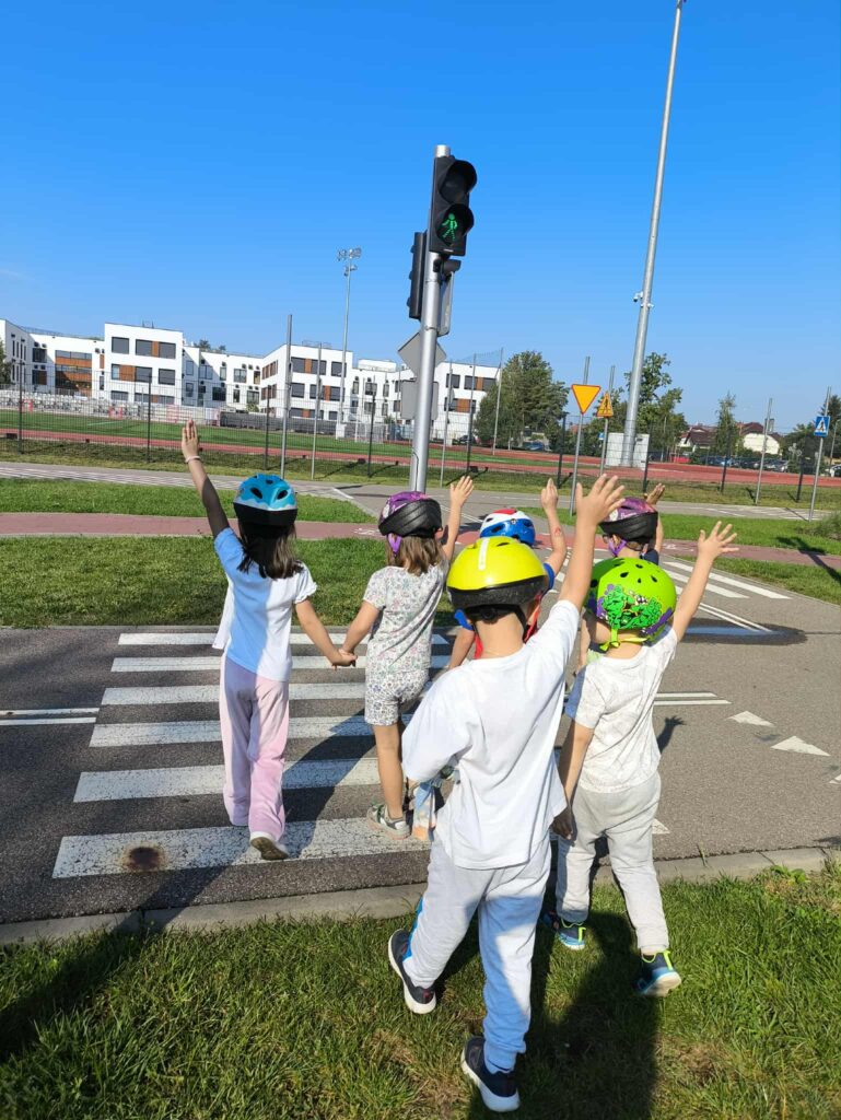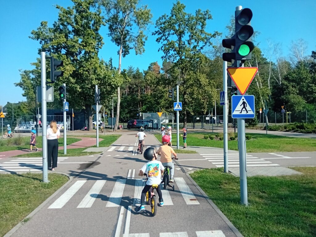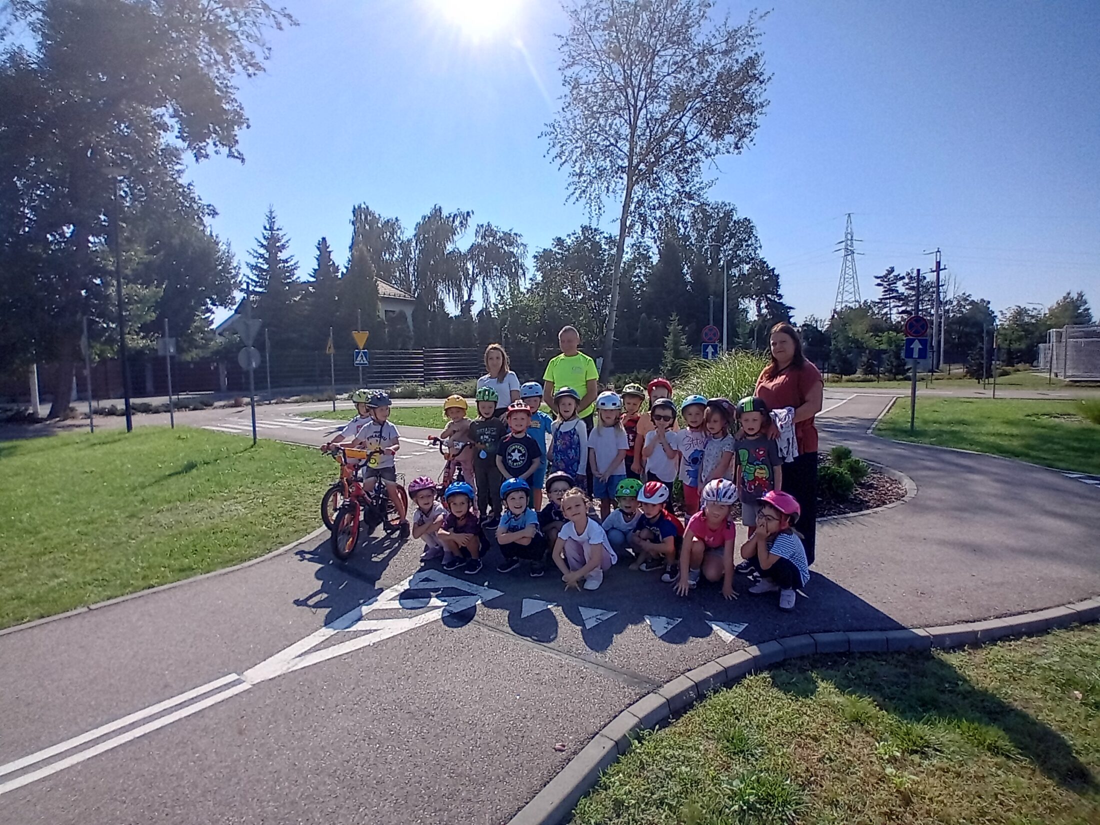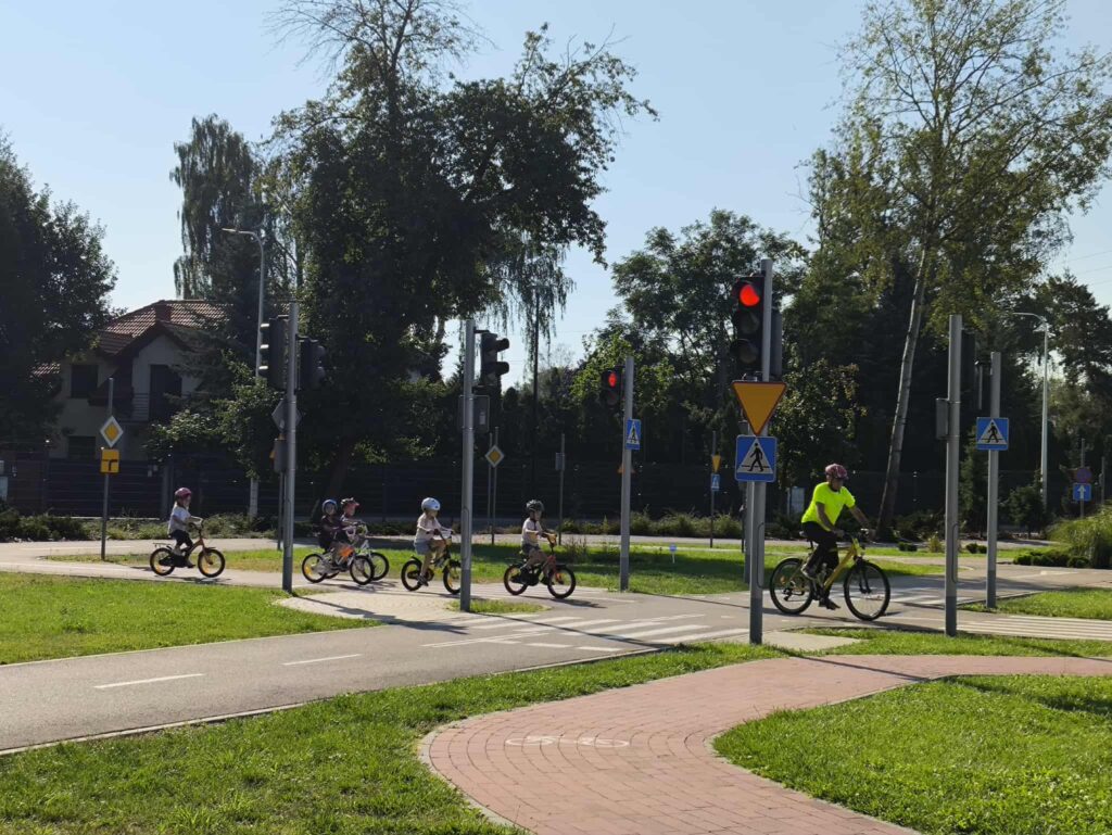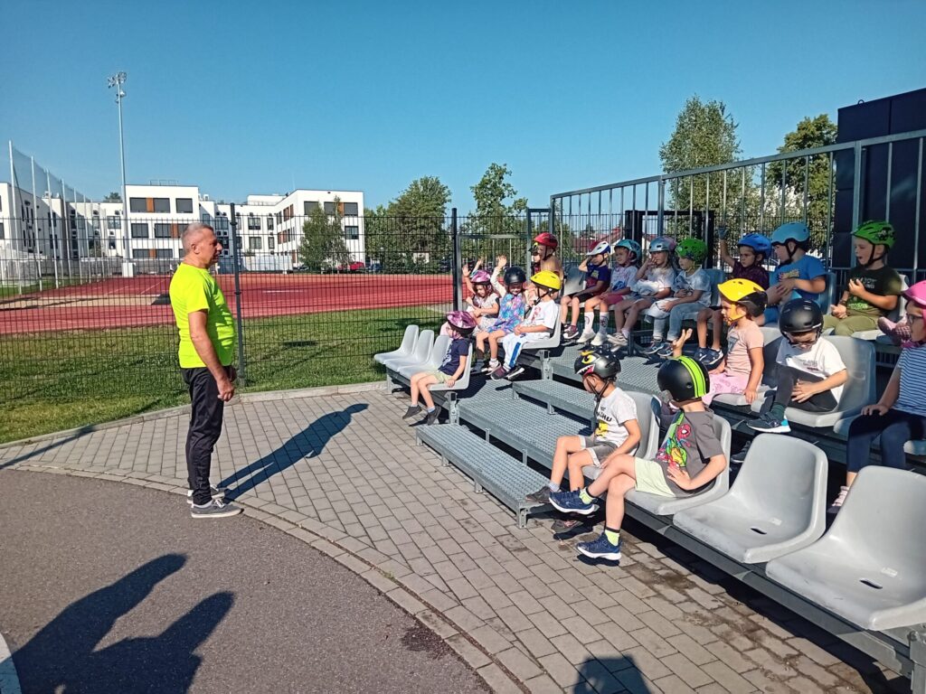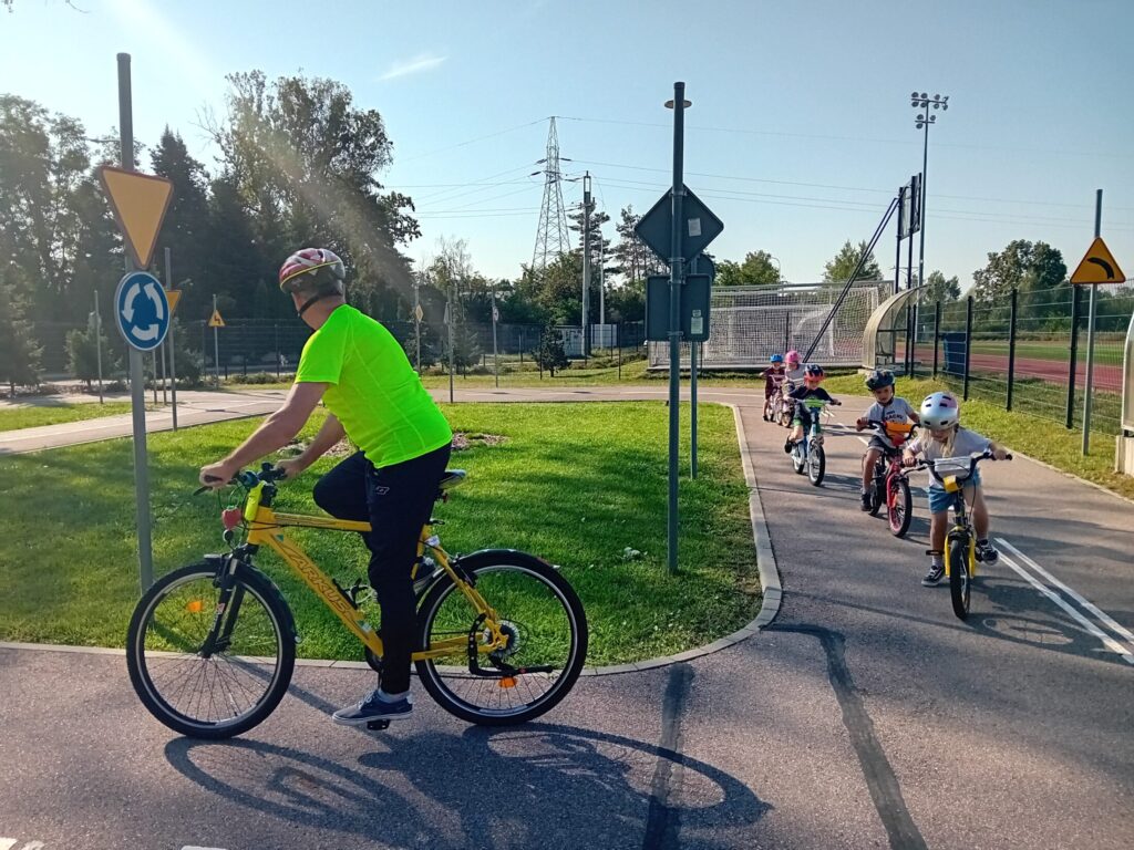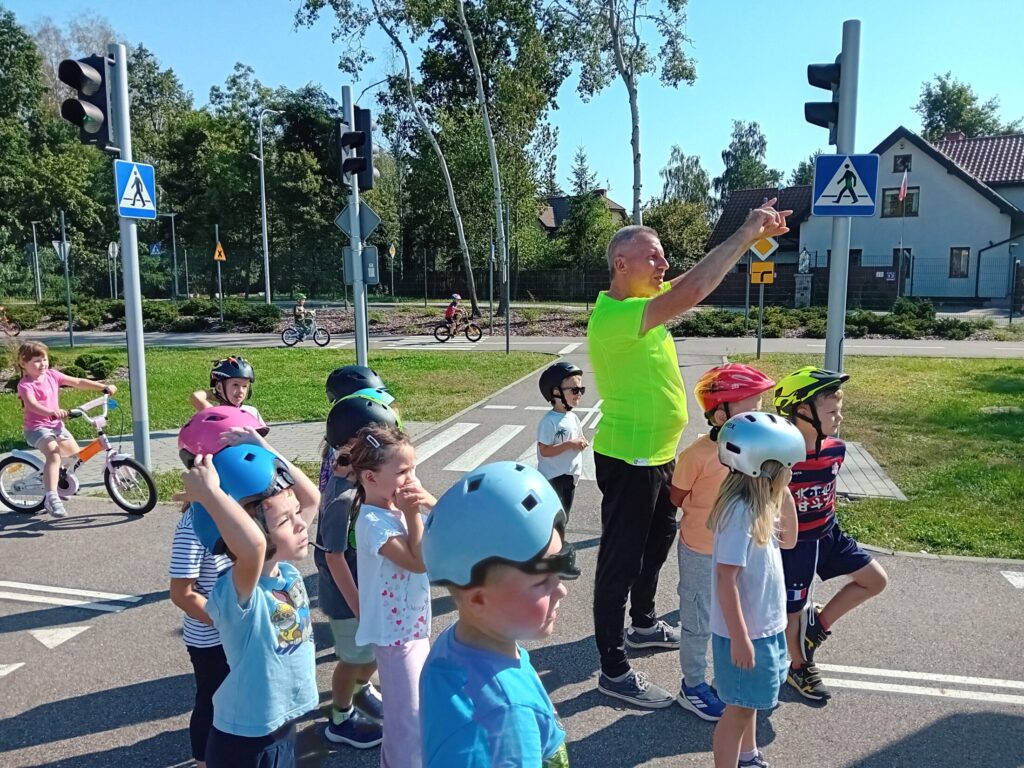 Galeria zdjęć przedstawia dzieci podczas uczestniczenia w warsztatch edukacyjnych z bezpiecznej jazdy na rowerze prowadzonych przez pana Pawła.