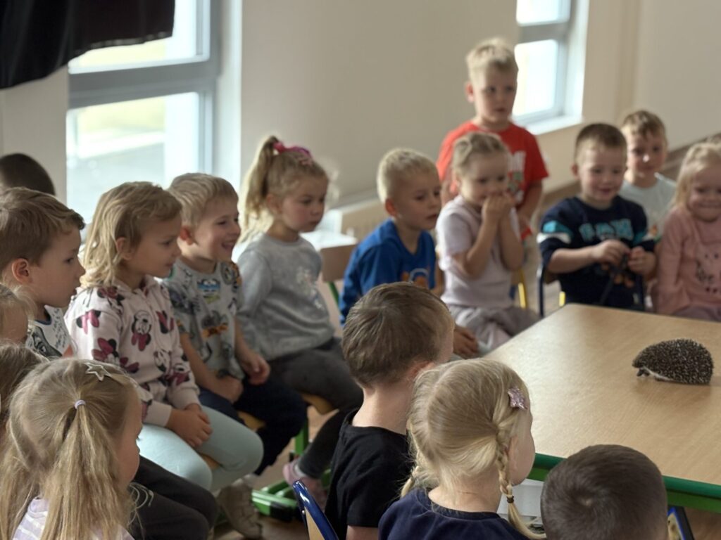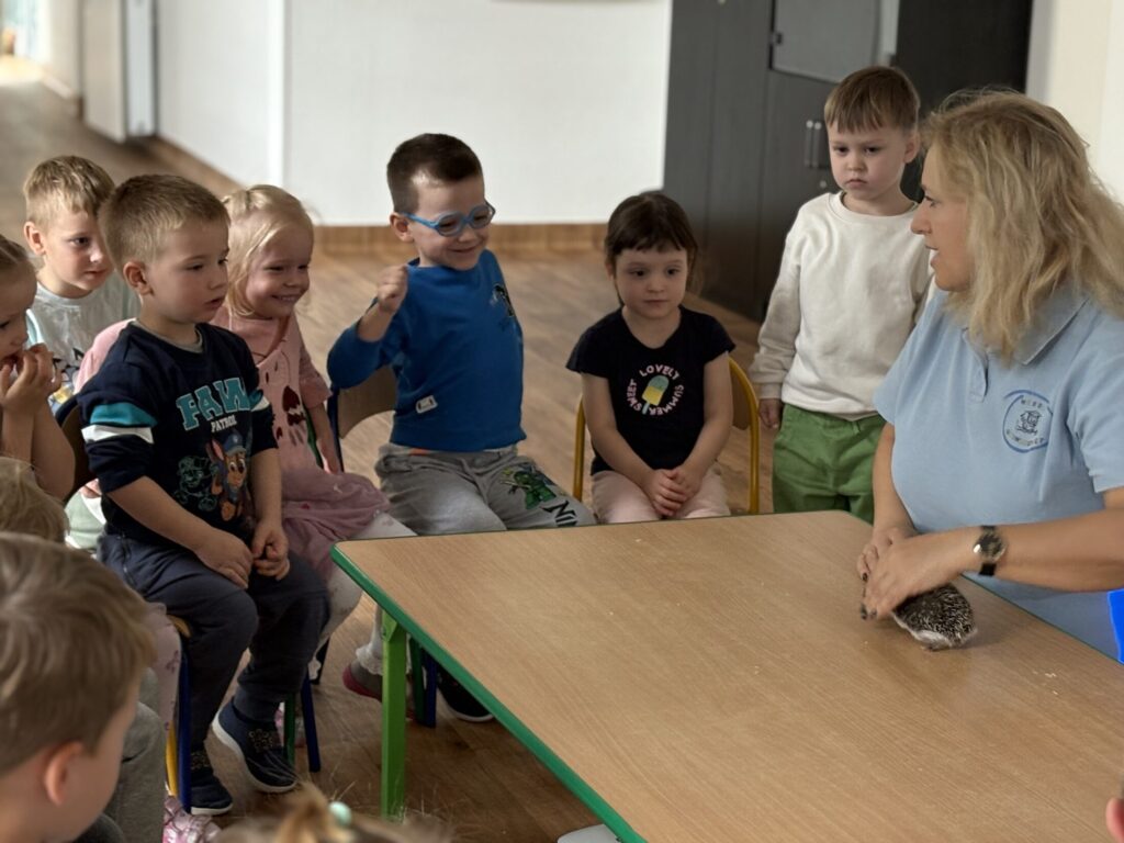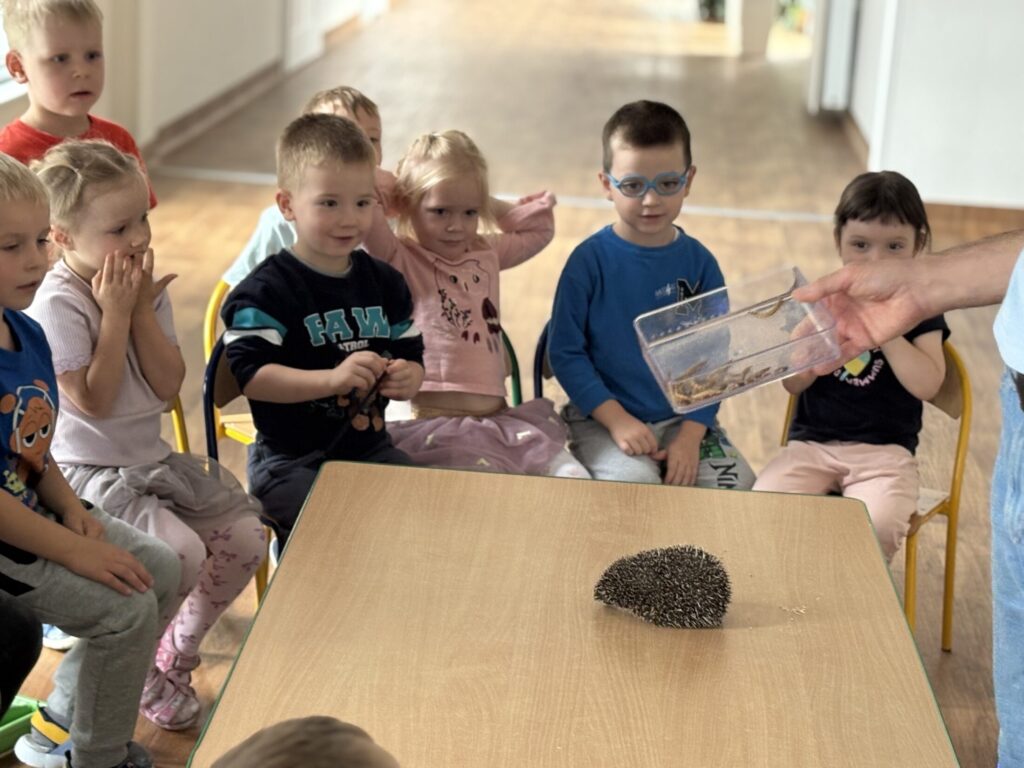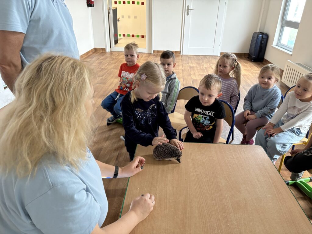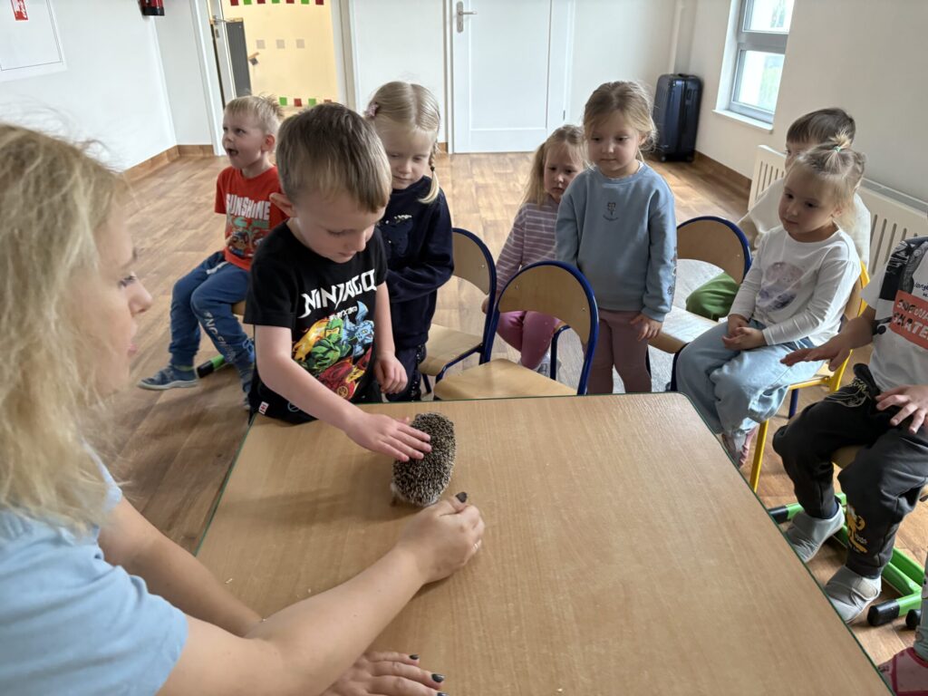 Dzieci wzięły udział w warsztatach „Kto śpi zimą, a kto nie” prowadzonych przez „Wesoły Uniwersytet”. Dowiedziały się jak do zimy przygotowują się jeż, wiewiórka, niedźwiedź i świstak, a także miały okazję pogłaskać jeża.