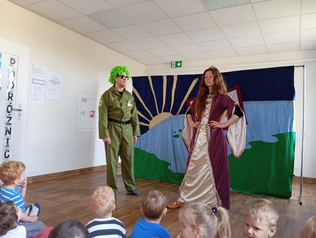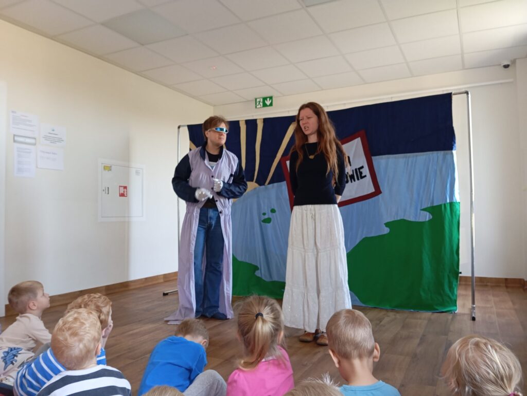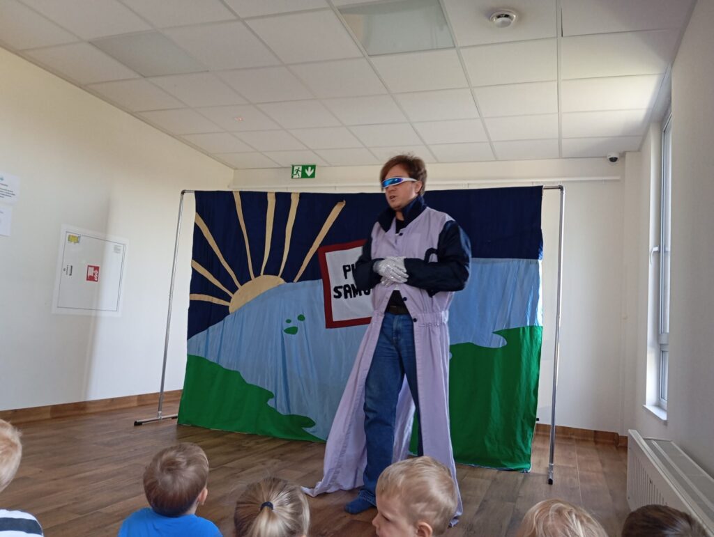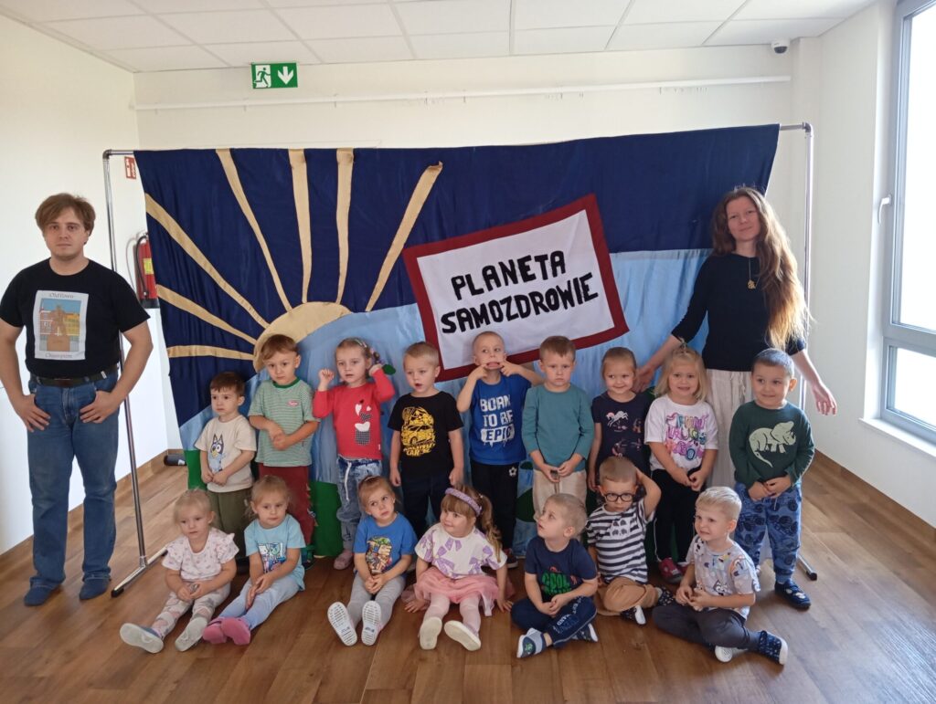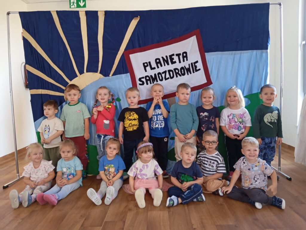 Teatrzyk „Planeta Samozdrowie” 9 października 2025 przez przedszkole Galeria przedstawia dzieci podczas oglądania spektaklu.