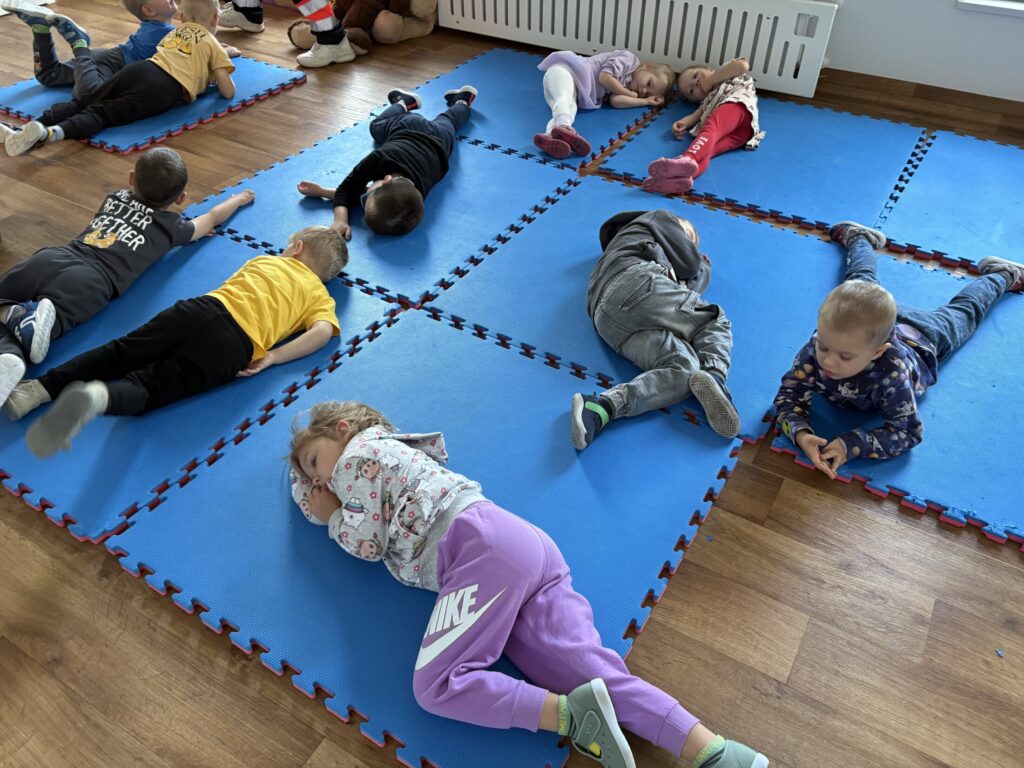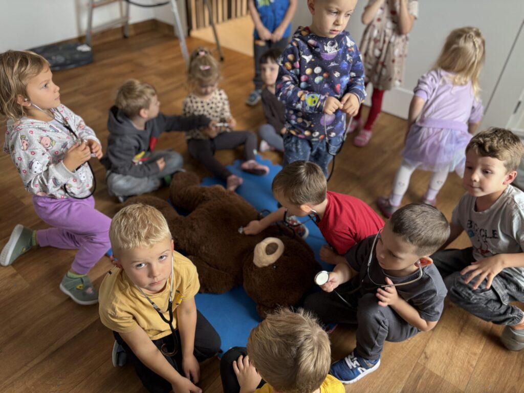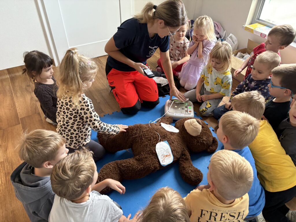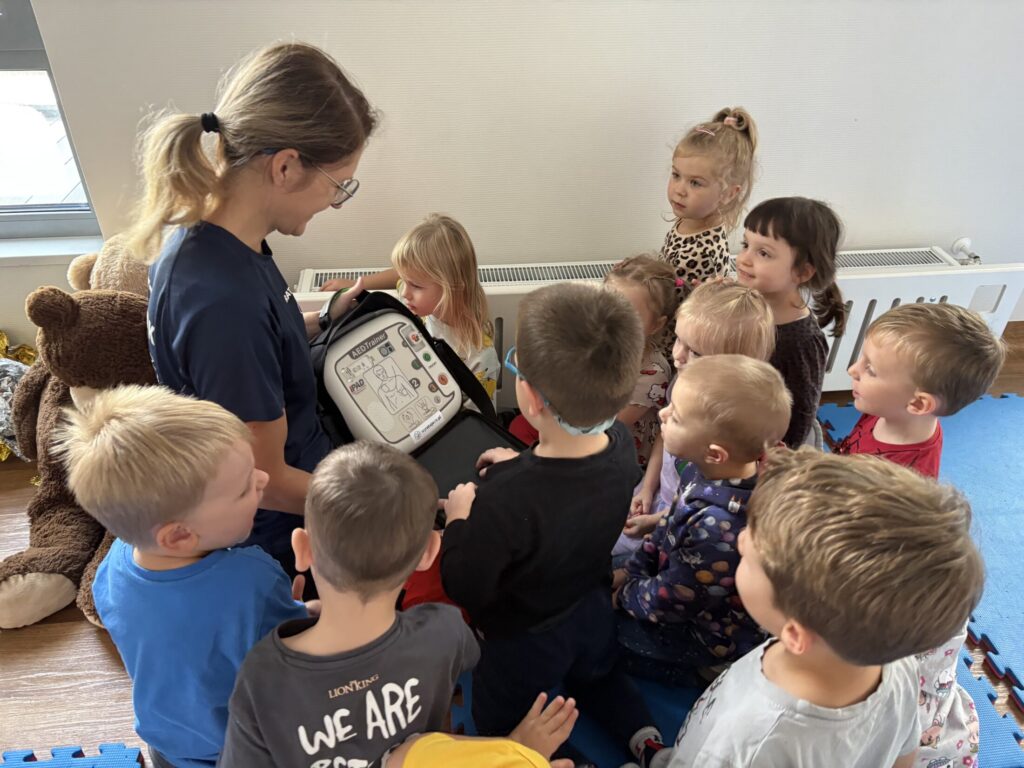 Na zajęciach przedszkolaki dowiedziały się do czego służy defibrylator, jak wygląda pozycja boczna ustalona oraz miały okazję posłuchać bicia serca.