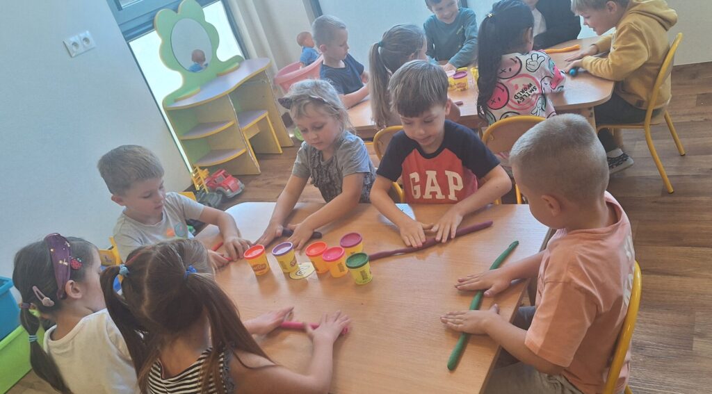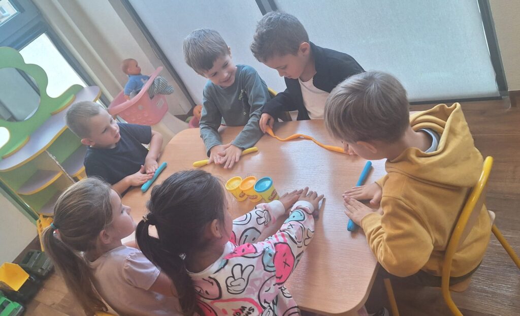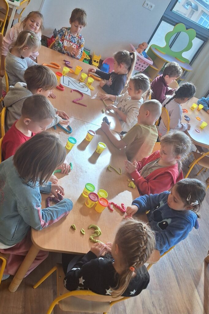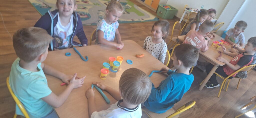 Galeria zdjęć przedstawia przedszkolaki podczas zabawy z ciastoliną. To doskonały sposób na rozwijanie motoryki małej, koordynacji, ćwiczenia mięśni dłoni i palców oraz kreatywności.