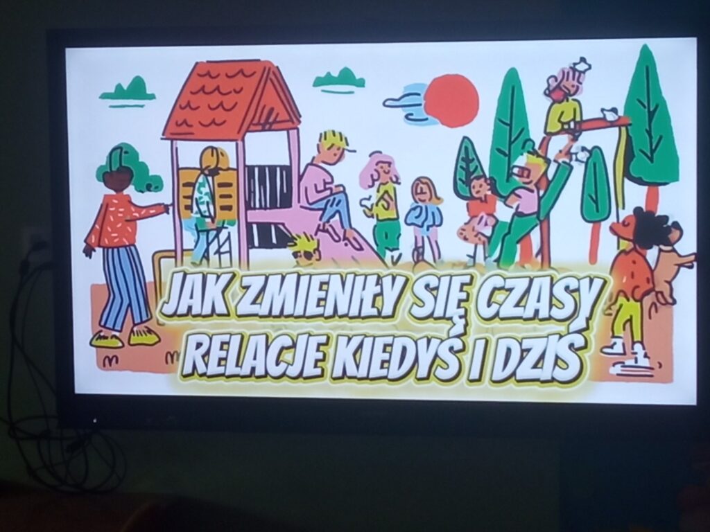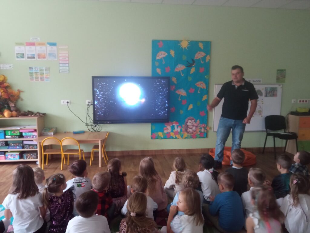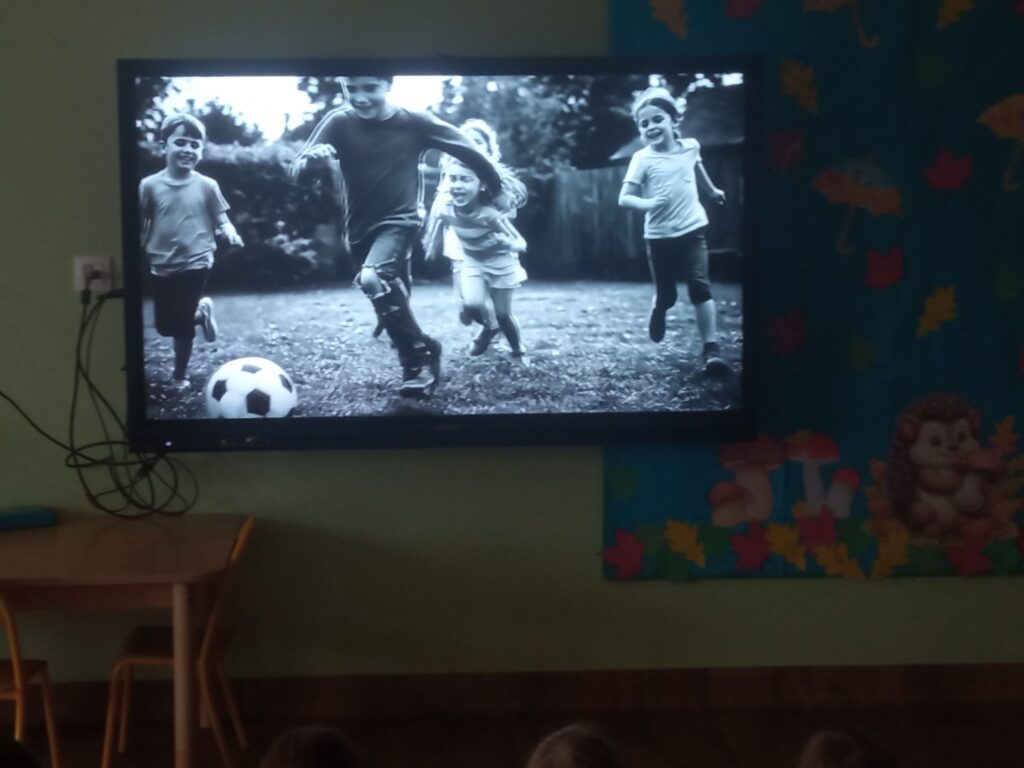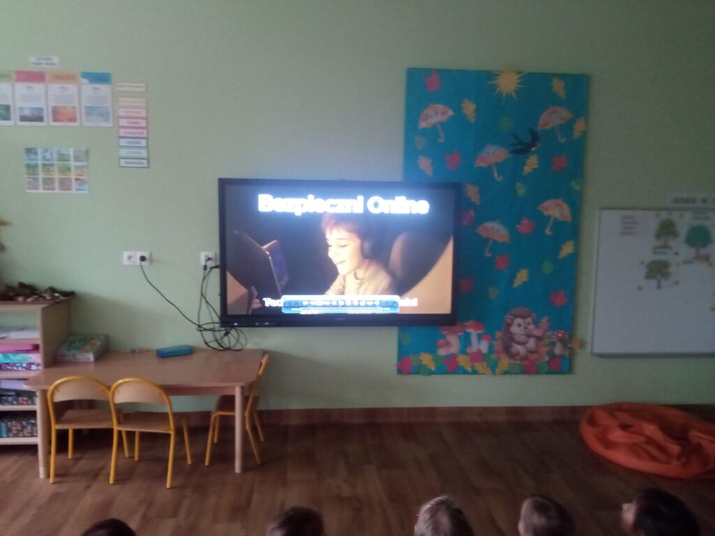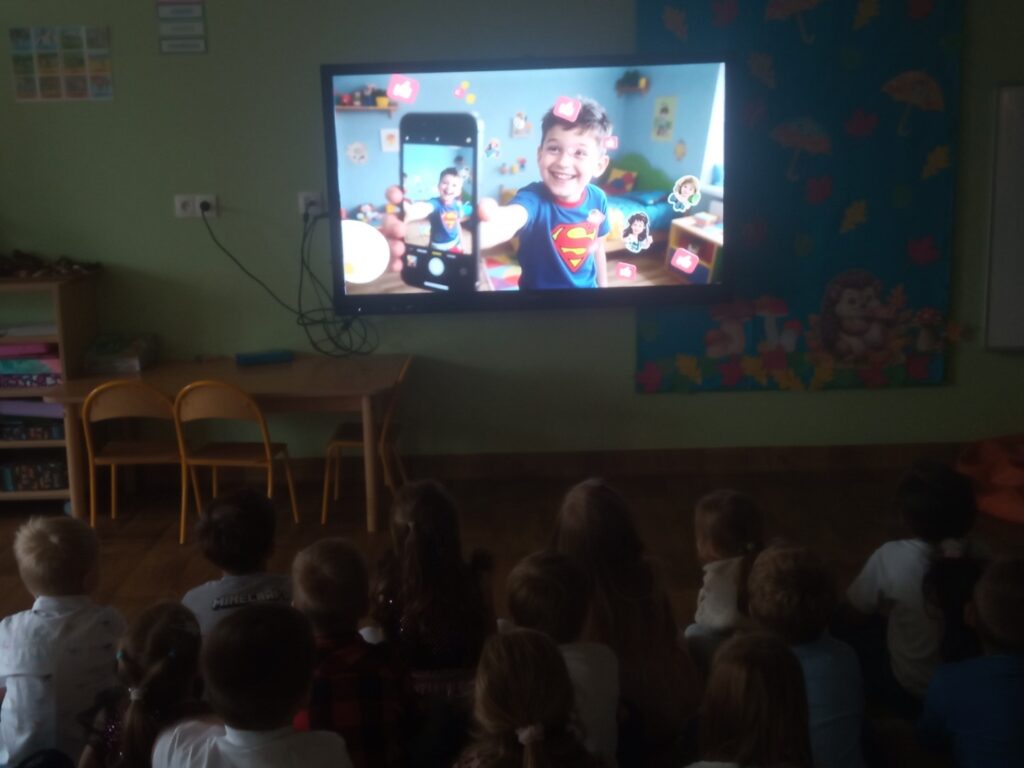 Galeria zdjęć przedstawia dzieci podczas oglądania filmu edukacyjnego.