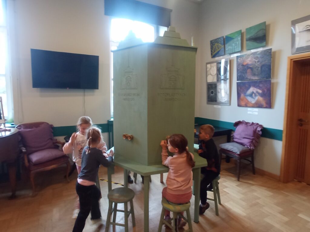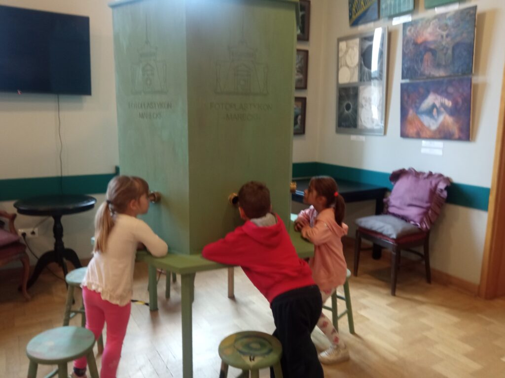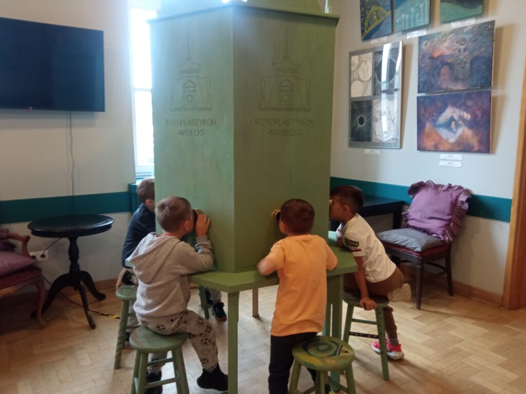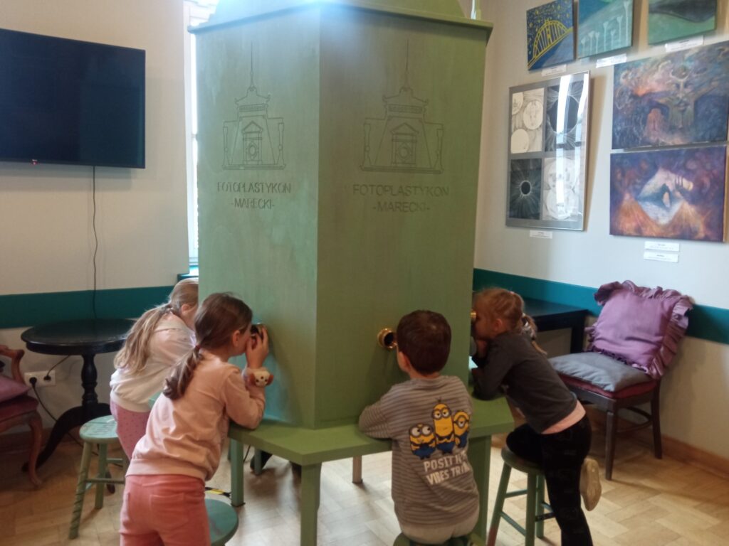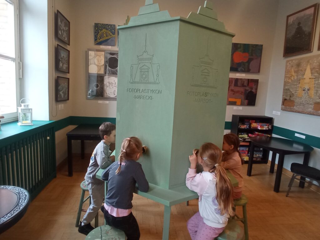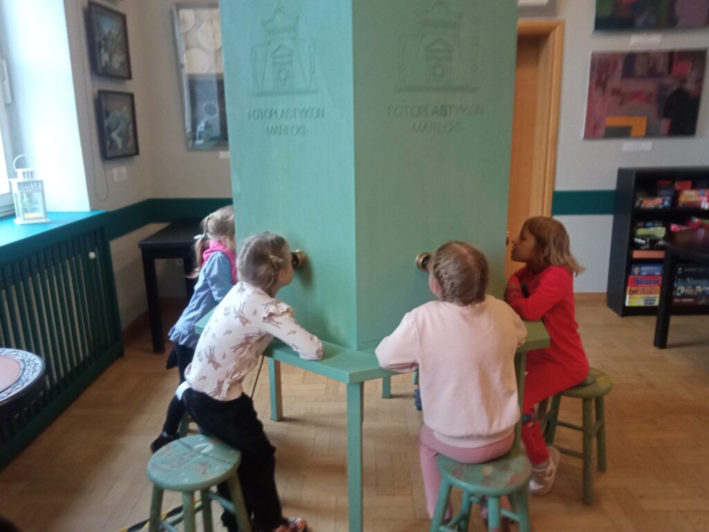 Fotoplastikon 22 października 2025 przez przedszkole Zdjęcia przedstawiają dzieci podczas oglądania zdjęć w mareckim fotoplastikonie w MOK- u.
