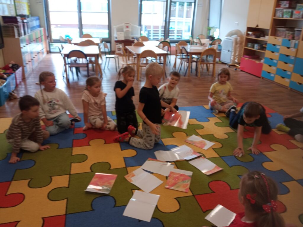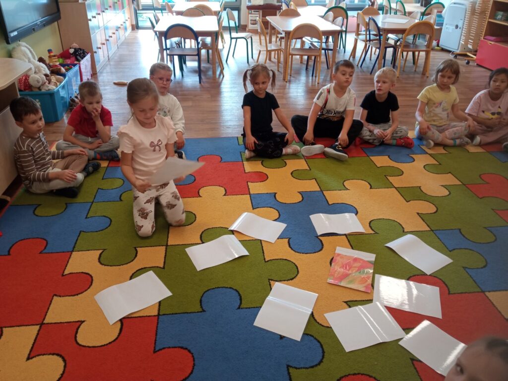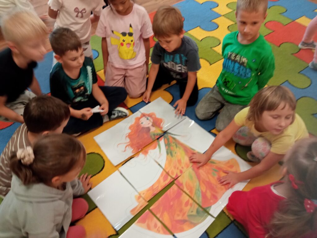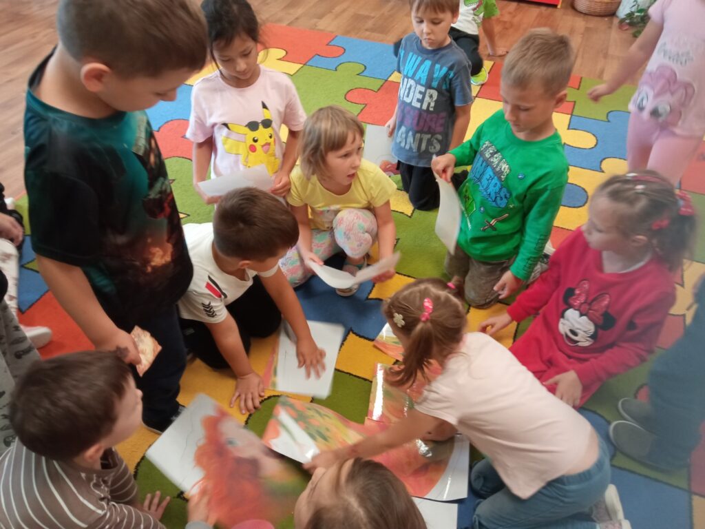 Dzieci po wspólnym ułożeniu z puzzli portretu jesieni wykonały własny portret tej pory roku.