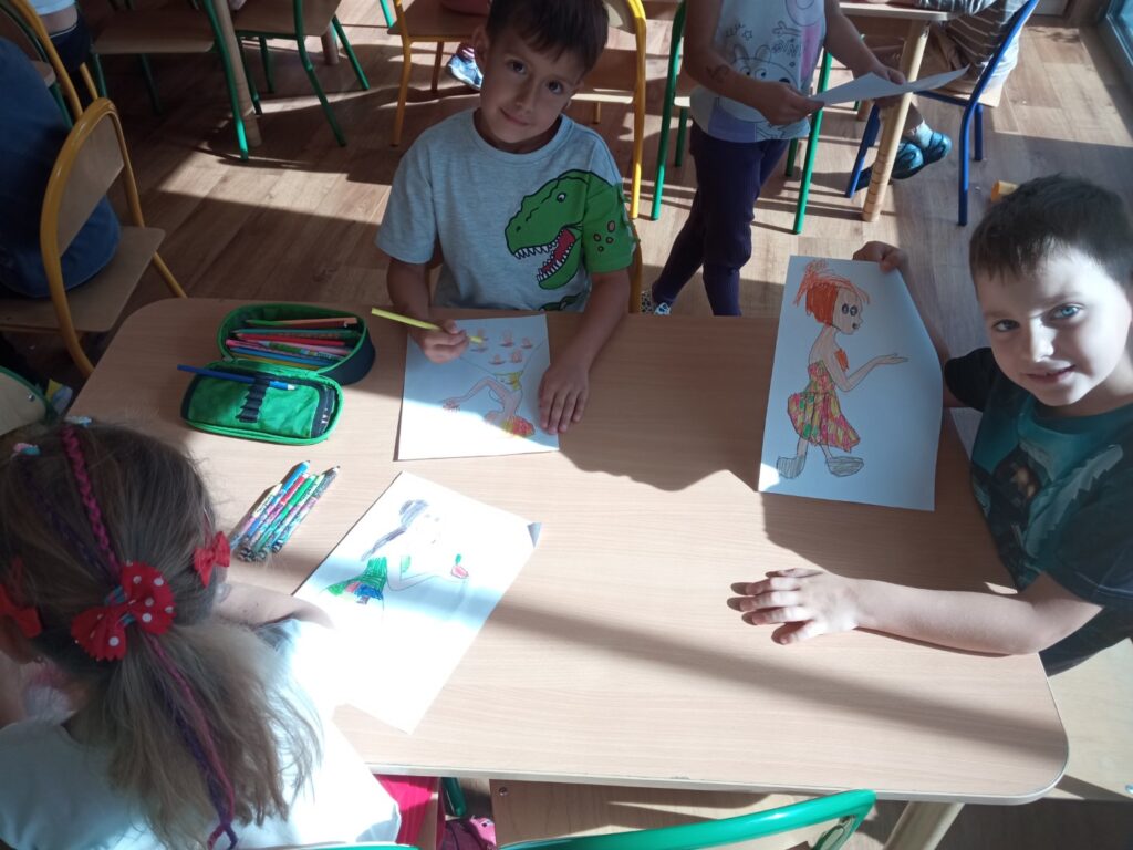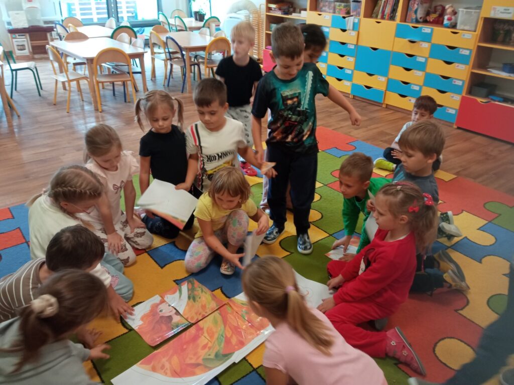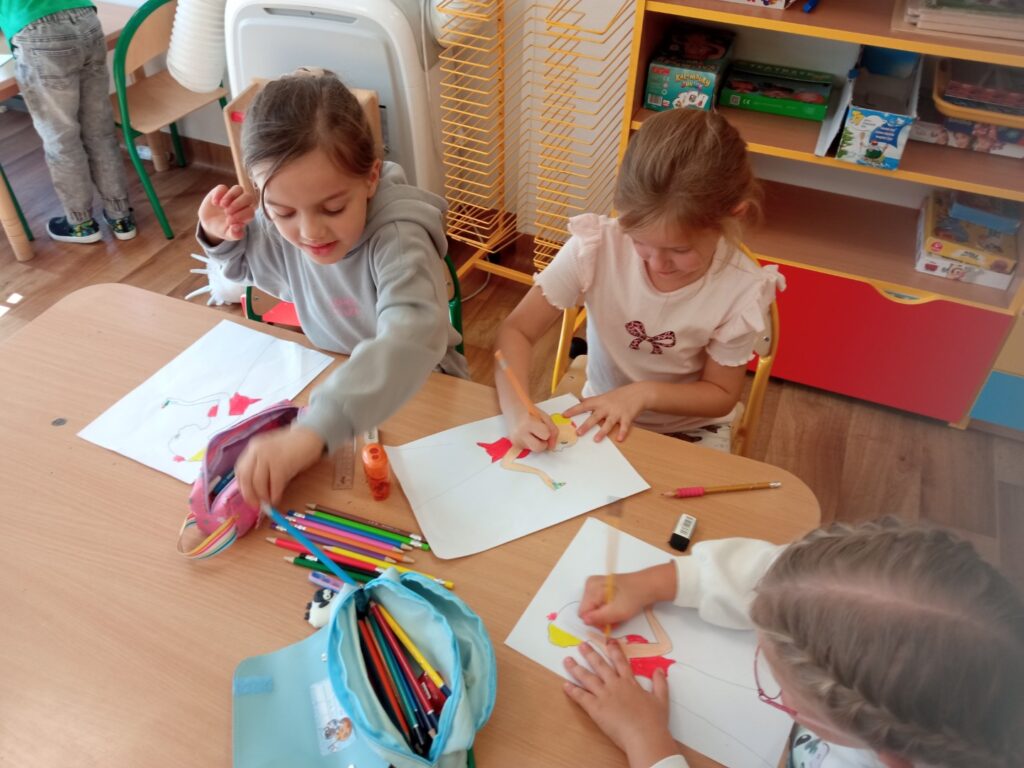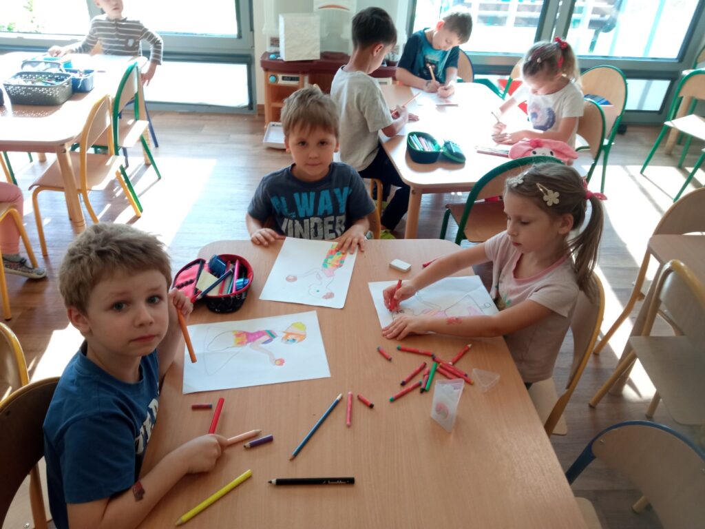 Dzieci po wspólnym ułożeniu z puzzli portretu jesieni wykonały własny portret tej pory roku.