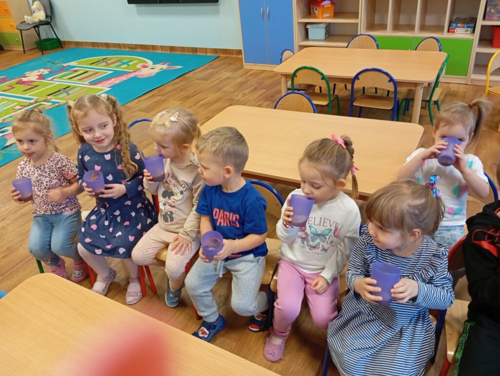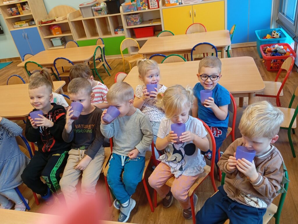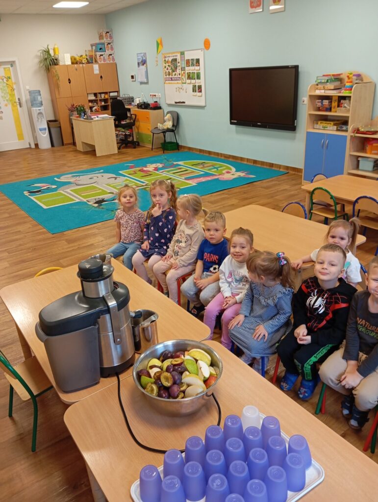 Pyszny i zdrowy sok owocowy 23 października 2025 przez przedszkole Zdjecia przedstawiają dzieci podczas przygotowywania i smakowania soku owocowego.