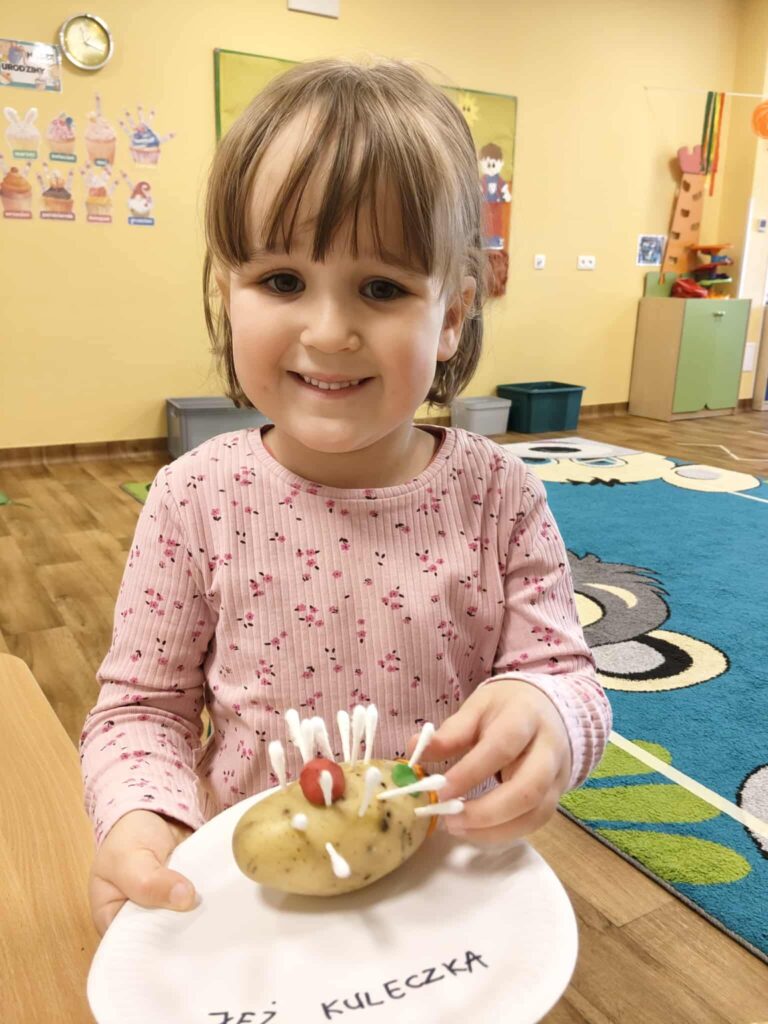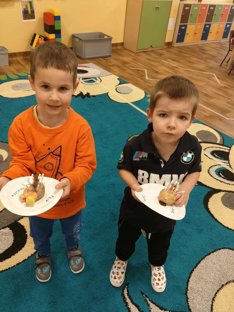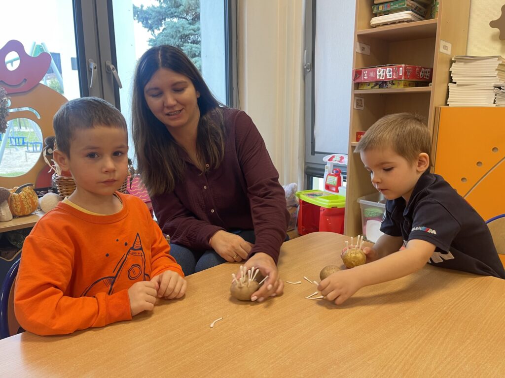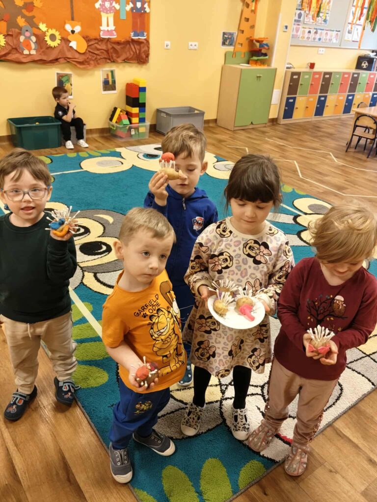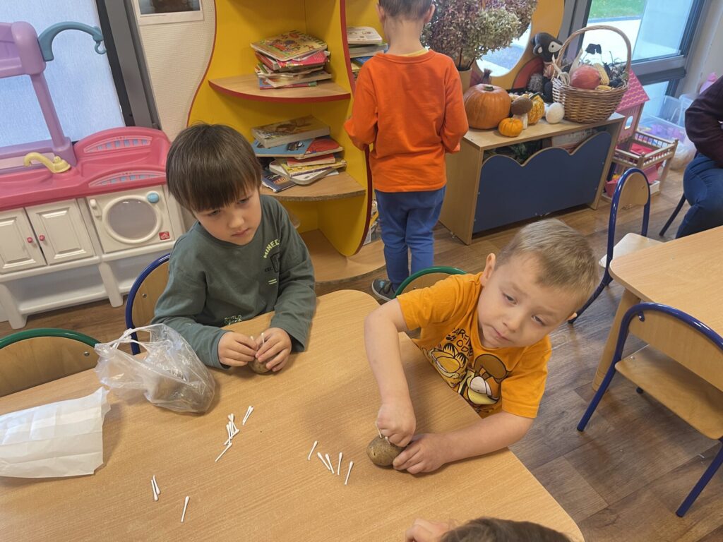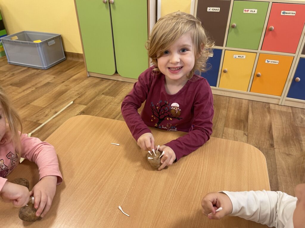 Idzie jeż… 28 października 2025 przez przedszkole Galeria zdjęć przedstawia dzieci podczas zajęć, na których stworzyły ziemniaczane jeżyki 🙂