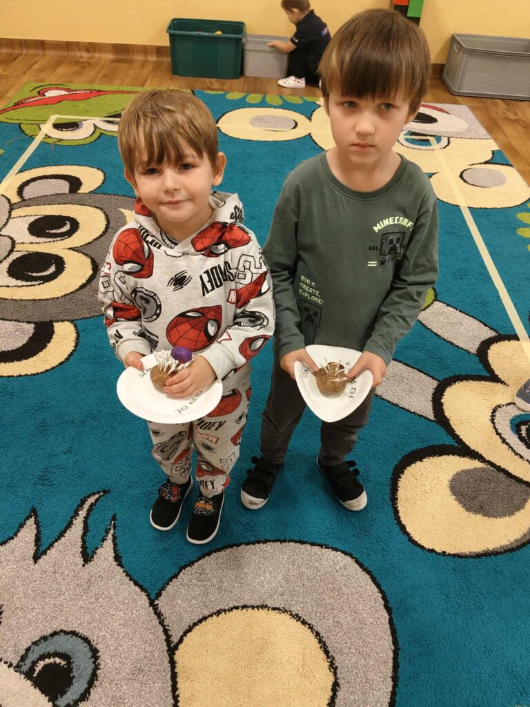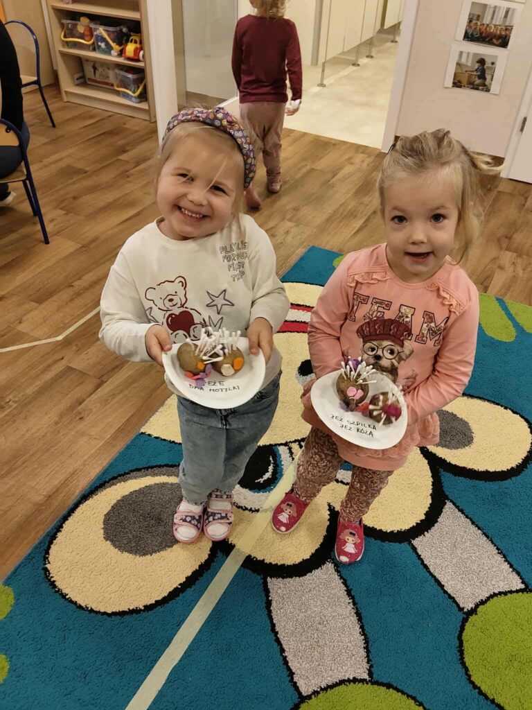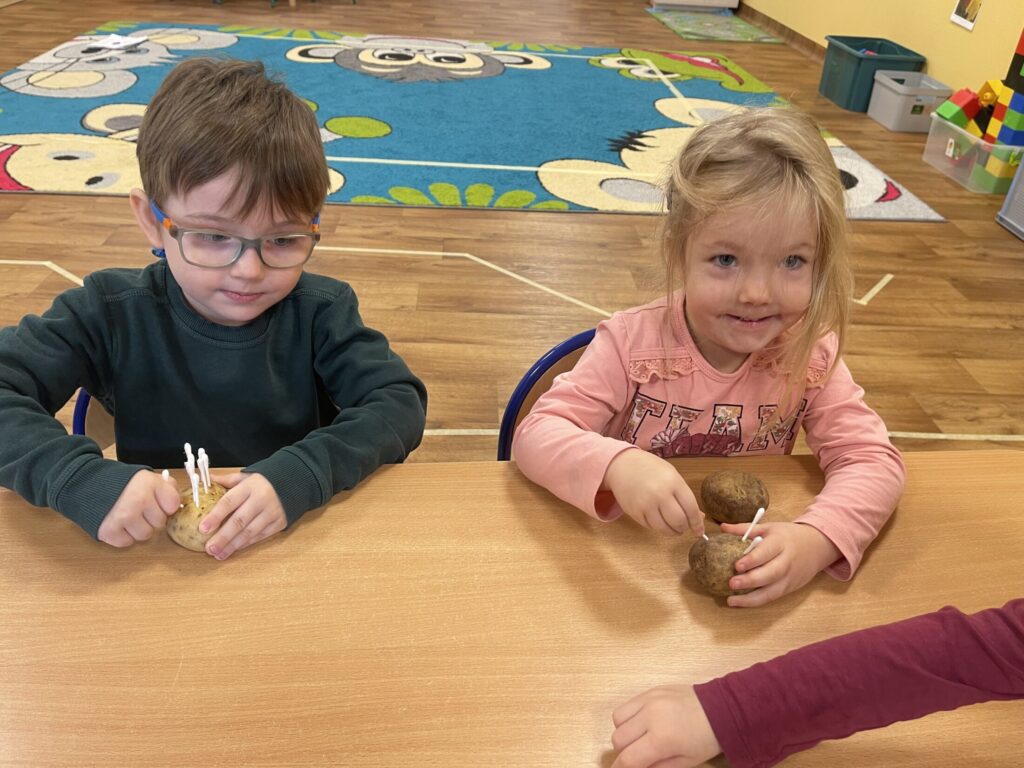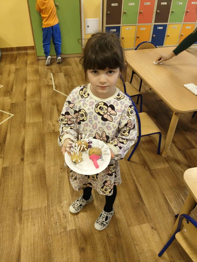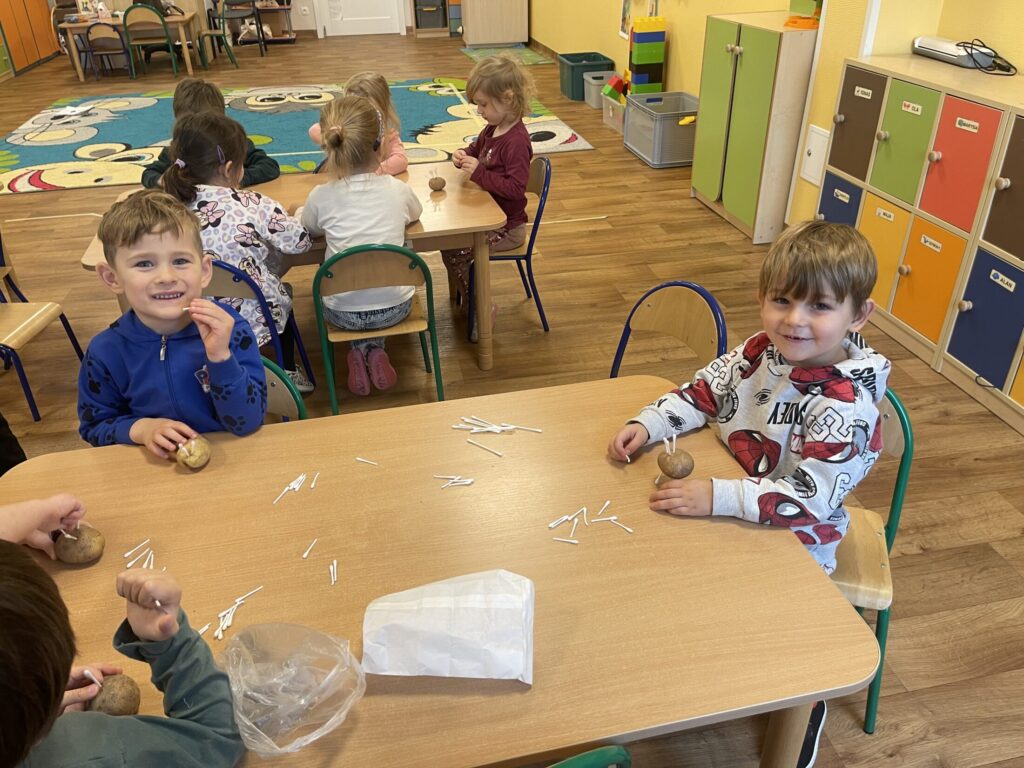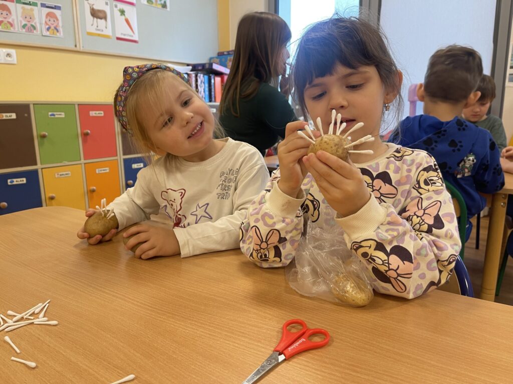 Idzie jeż… 28 października 2025 przez przedszkole Galeria zdjęć przedstawia dzieci podczas zajęć, na których stworzyły ziemniaczane jeżyki 🙂