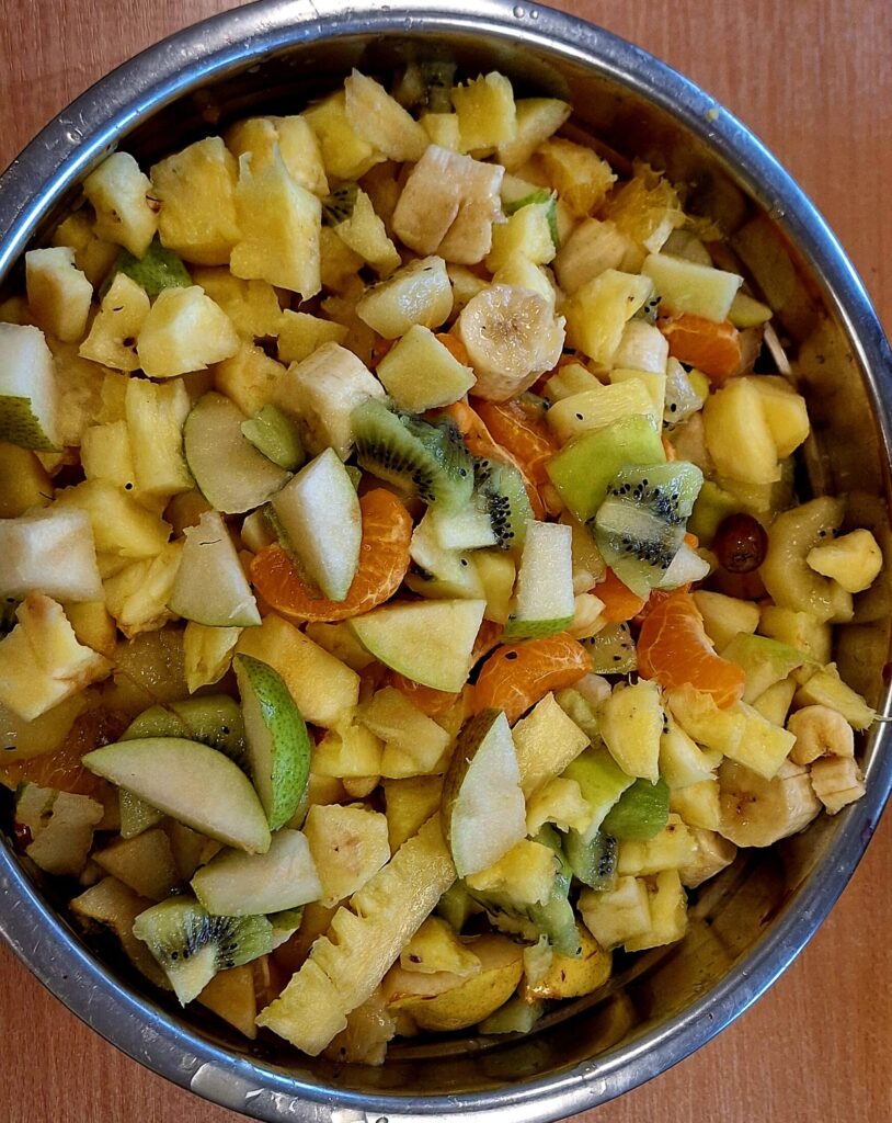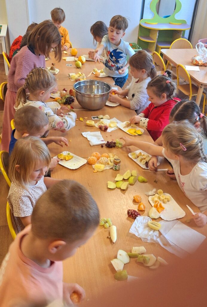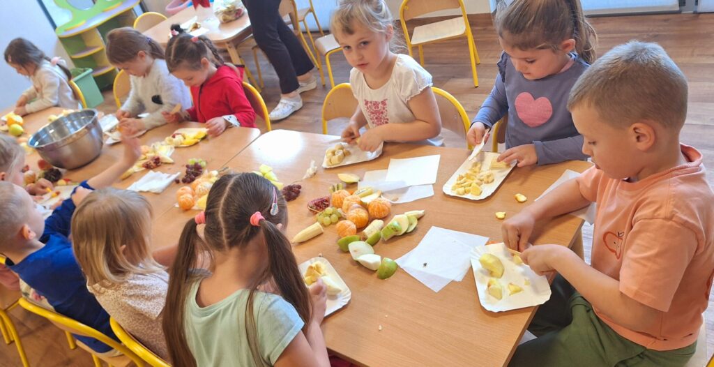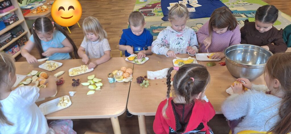 Galeria zdjęć przedstawia dzieci samodzielnie przygotowujące pyszną, kolorową i witaminową sałatkę owocową. Przed przystąpieniem do pracy przedszkolaki dokładnie umyły ręce, pamiętając o zasadach higieny. Na koniec degustacja sałatki owocowej była bardzo przyjemna.
