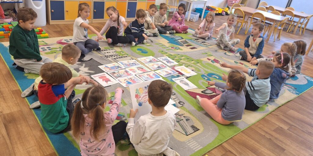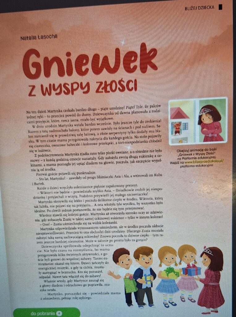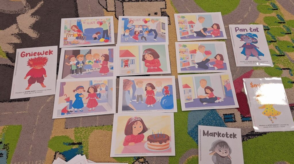 W ramach realizacji projektu ,,Czuciaki z Krainy Emocji” przedszkolaki poznały kolejną emocję- złość, której bohaterem był Gniewek z Wyspy Złości. Dzieci poznały bajkę przedstawiającą przygody Gniewka i dowiedziały się, że złość to uczucie, które czasem pojawia się u każdego, ale można wyrażać ją w bezpieczny sposób.