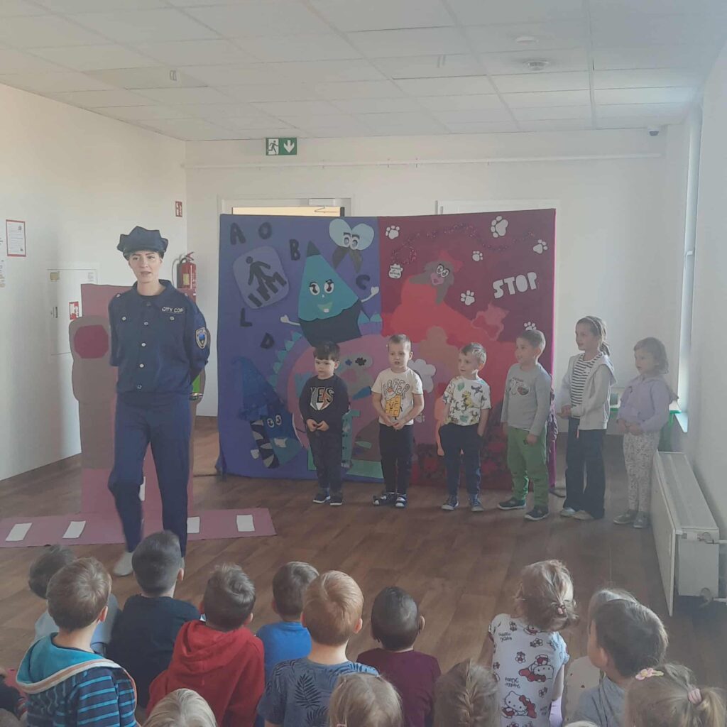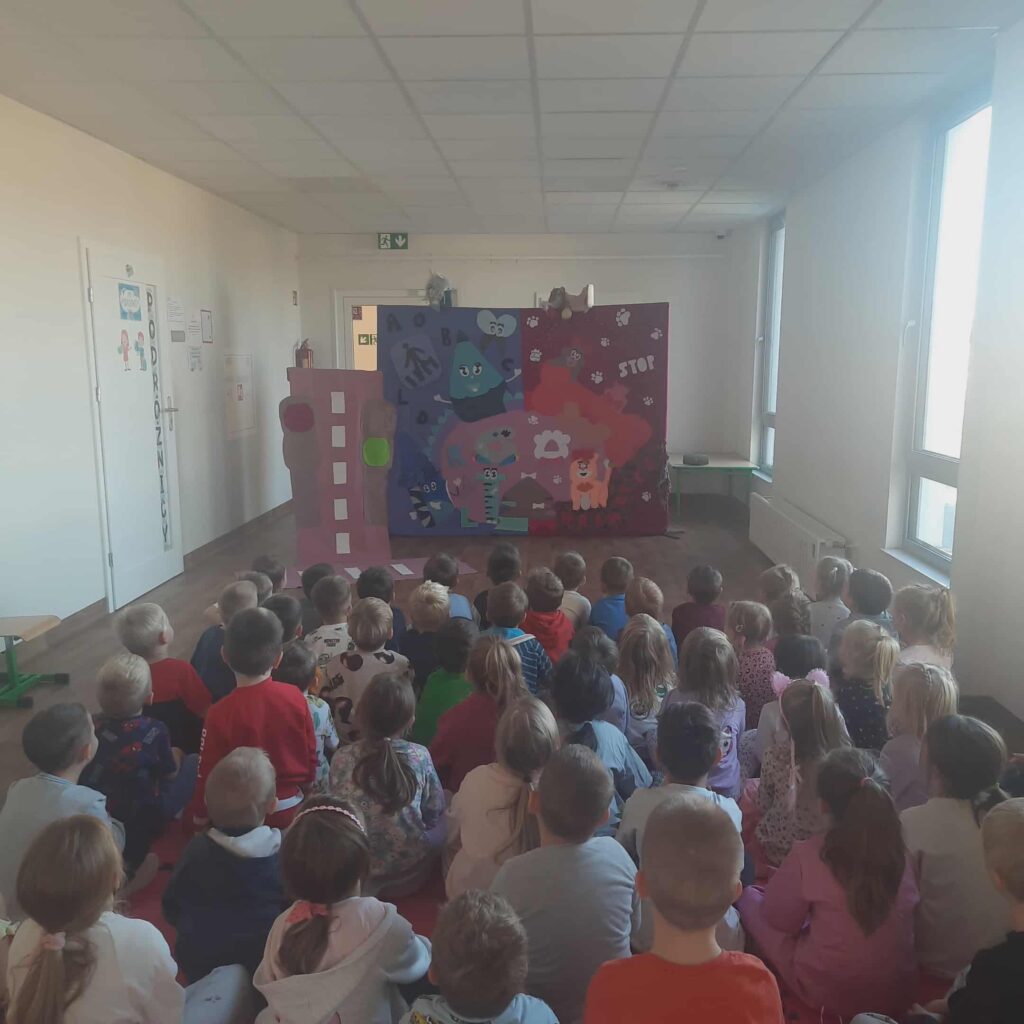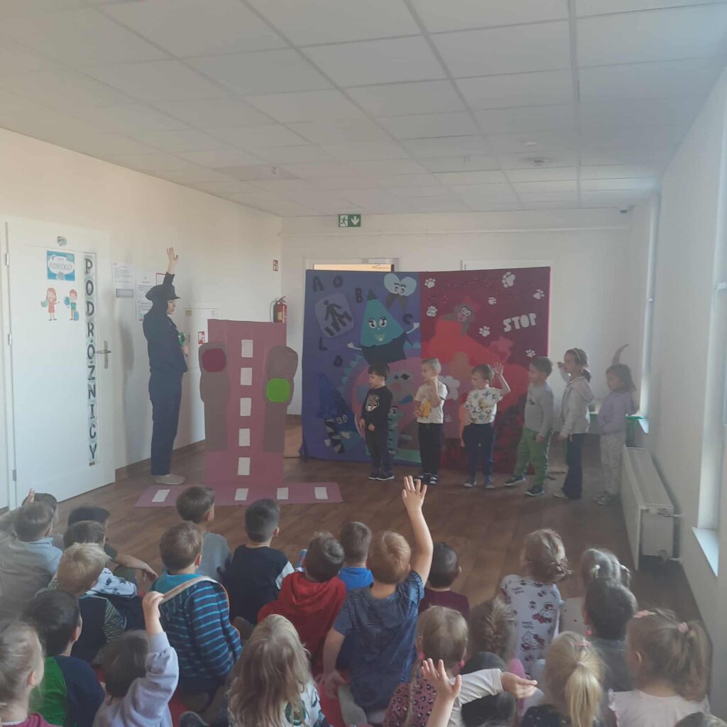 „Bezpieczna bajeczka, czyli podróż do przedszkolnego miasteczka”-teatrzyk 12 listopada 2025 przez przedszkole Galeria zdjęć przedstawia dzieci uczestniczące w teatrzyku.
