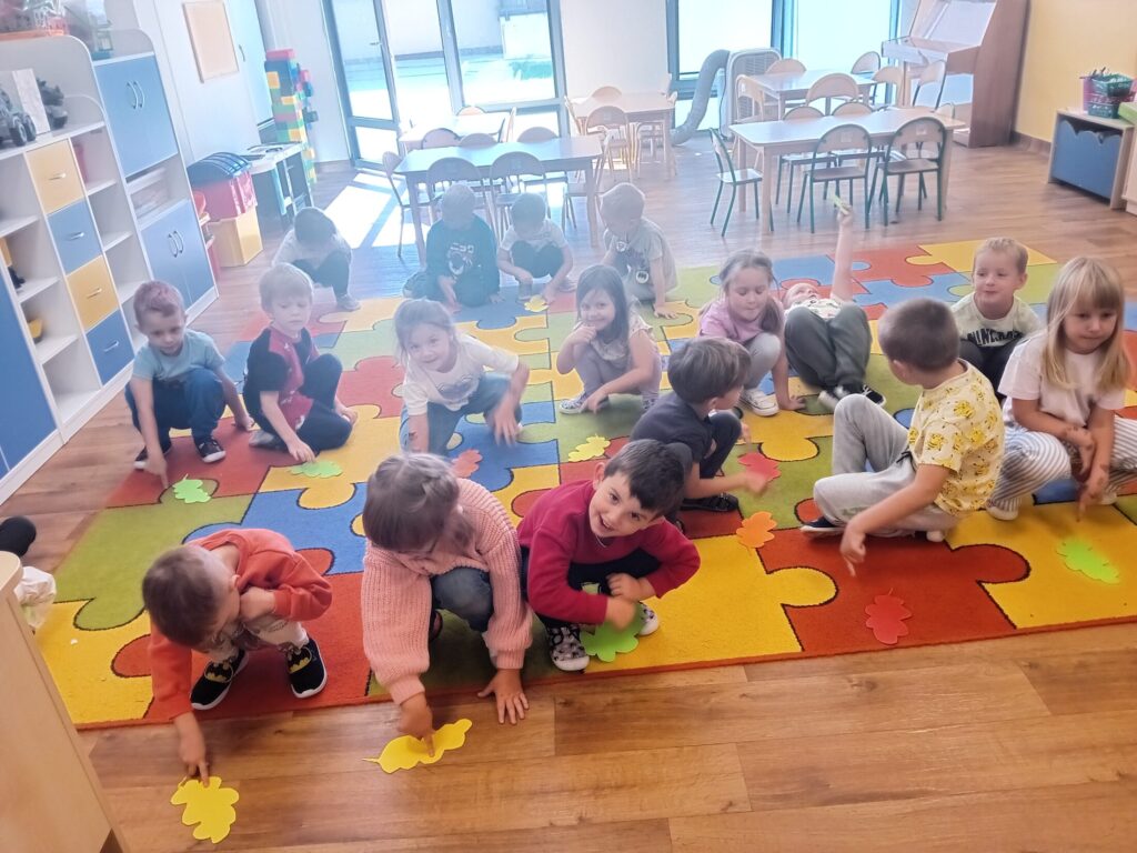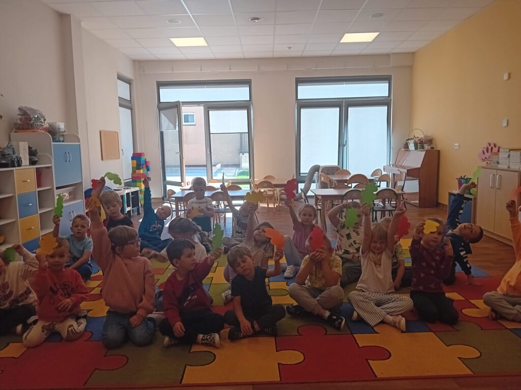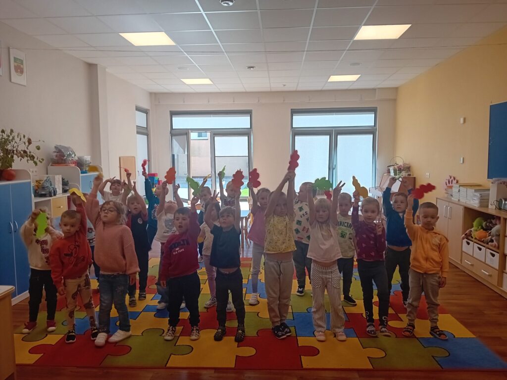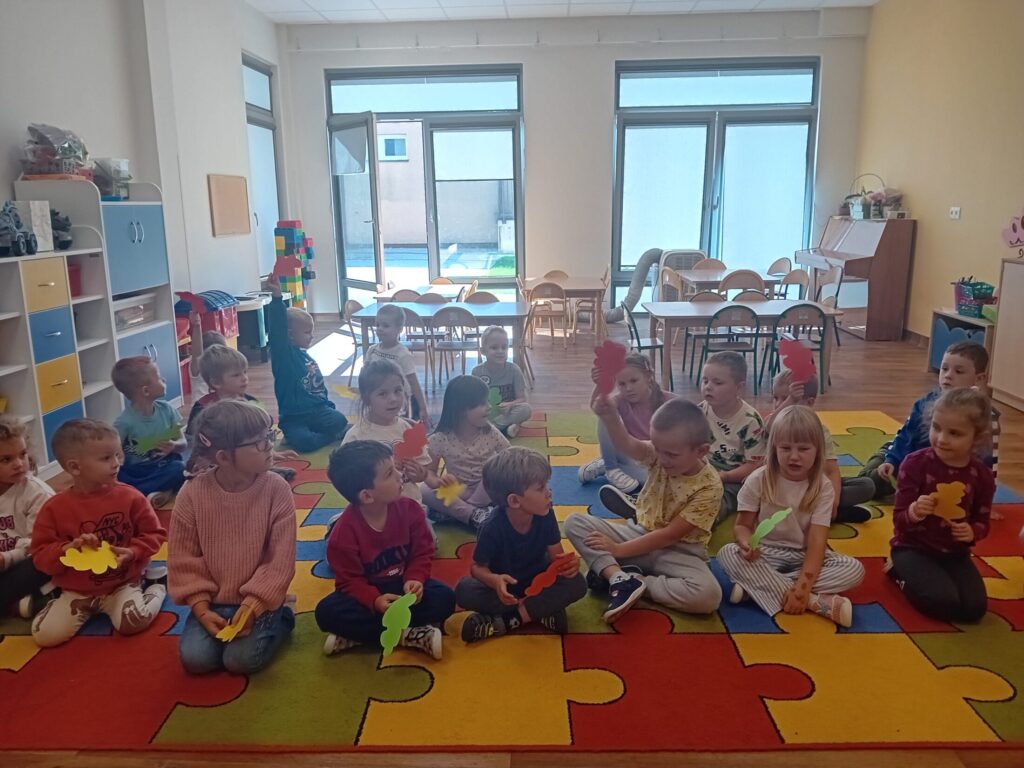 Galeria zdjęć przedstawia dzieci podczas zajęć z programu Dwujęzyczny przedszkolak, na których przedszkolaki utrwaliły kolory w j.angielskim, bawiły się w zabawy muzyczno ruchowe do piosenki oraz wykonały pracę plastyczną pt ,,The colorful leaves”- Kolorowe liście.