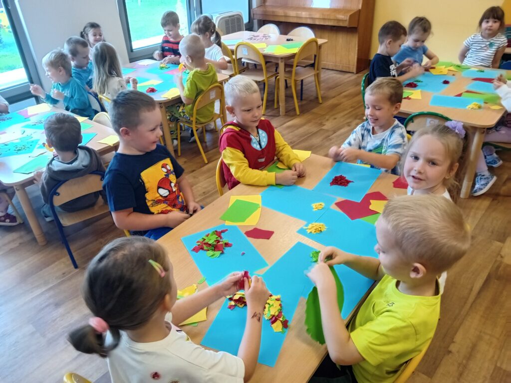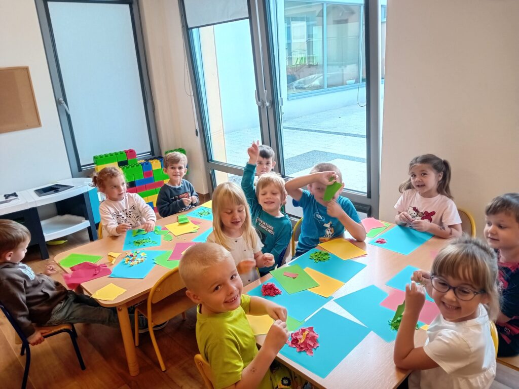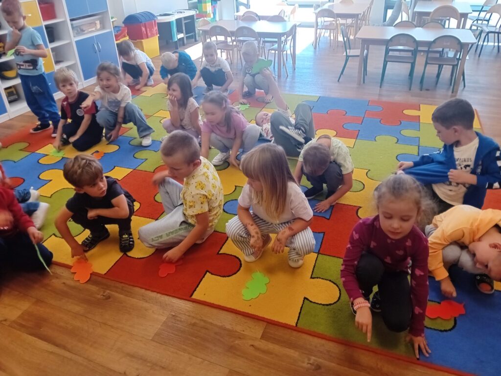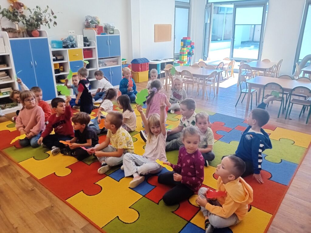 Galeria zdjęć przedstawia dzieci podczas zajęć z programu Dwujęzyczny przedszkolak, na których przedszkolaki utrwaliły kolory w j.angielskim, bawiły się w zabawy muzyczno ruchowe do piosenki oraz wykonały pracę plastyczną pt ,,The colorful leaves”- Kolorowe liście.