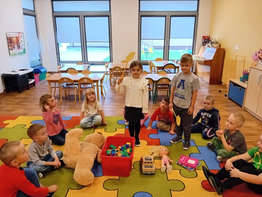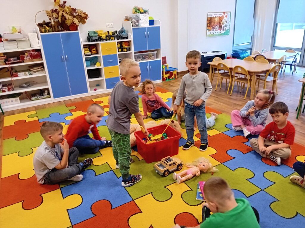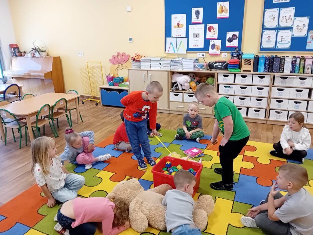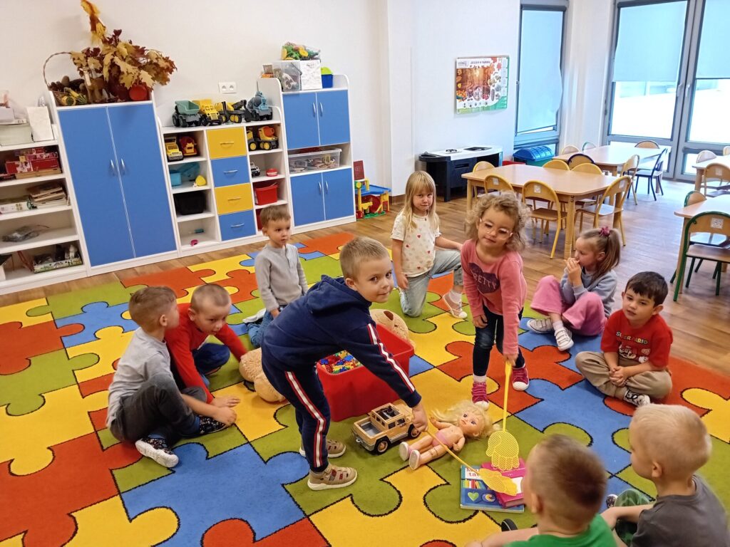 Galeria zdjęć przedstawia dzieci podczas zajęć w ramach programu ” Dwujęzyczny przedszkolak”. Dzieci zapoznały się ze słownictwem określającym zabawki i rzeczy znajdujące się w sali przedszkolnej: dolls, blocks, car, books, teddy bear.