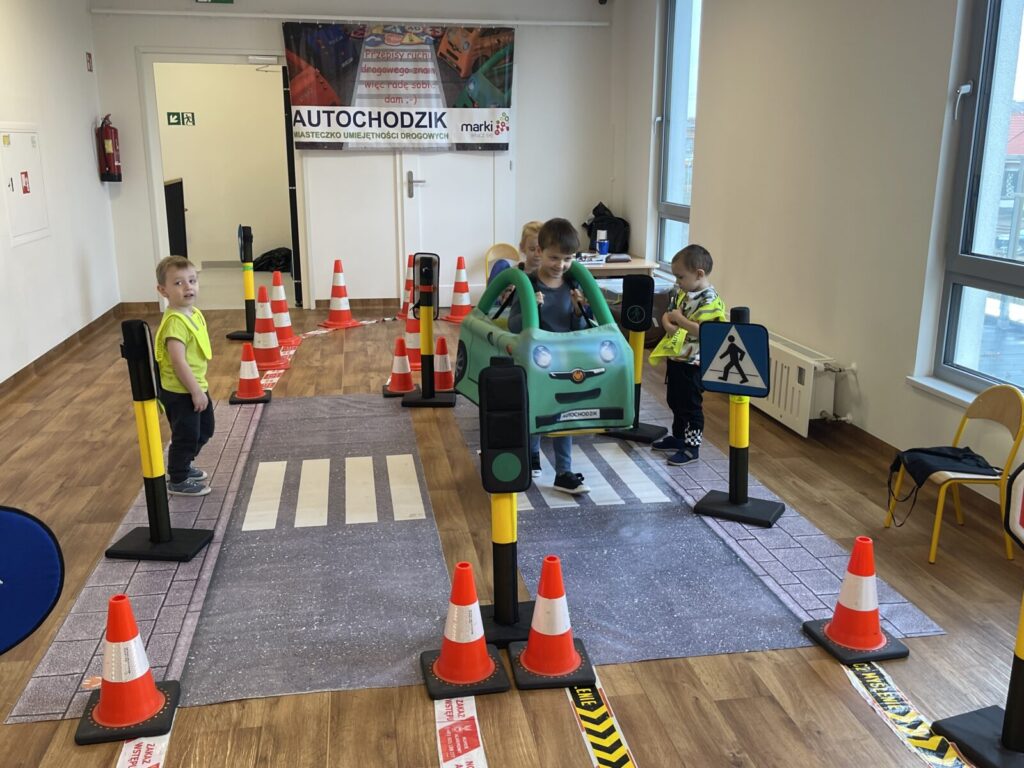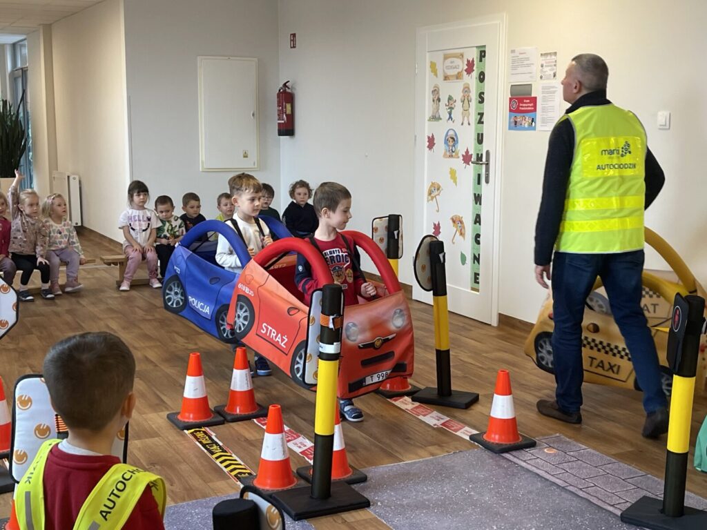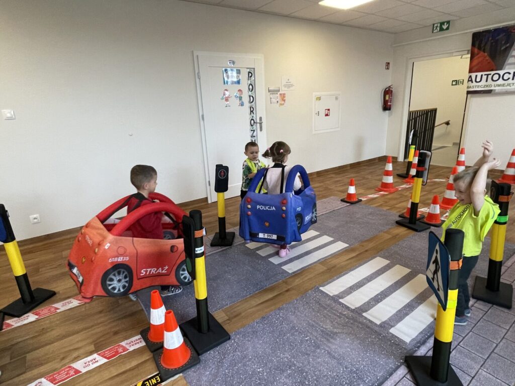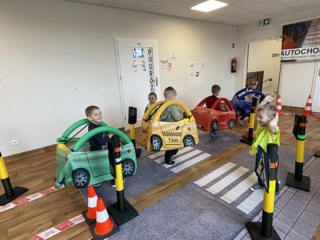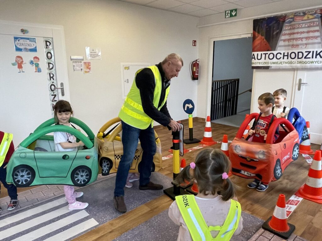 Autochodzik 19 listopada 2025 przez przedszkole Galeria zdjęć przedstawia dzieci podczas zajęć edukacyjnych na temat bezpieczeństwa na drodze.