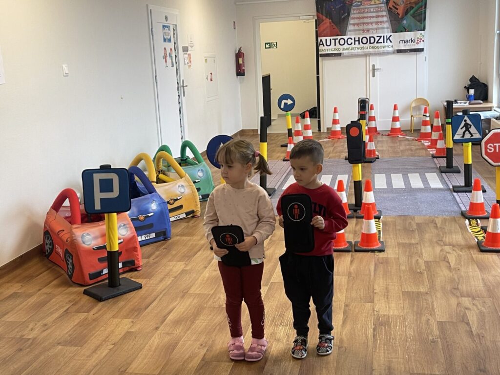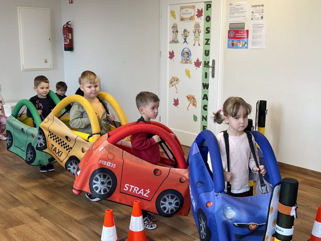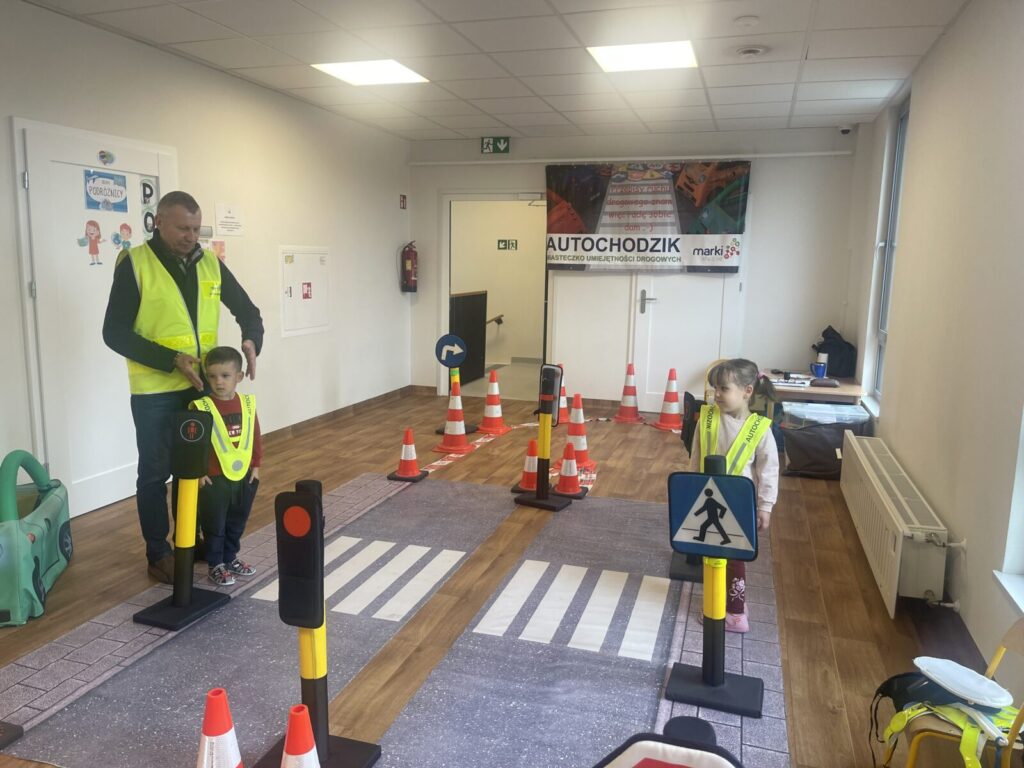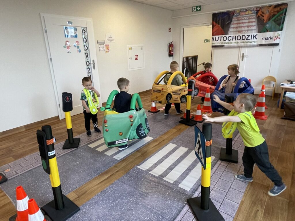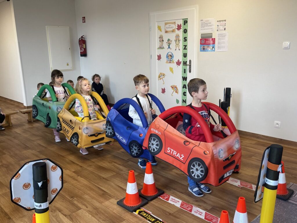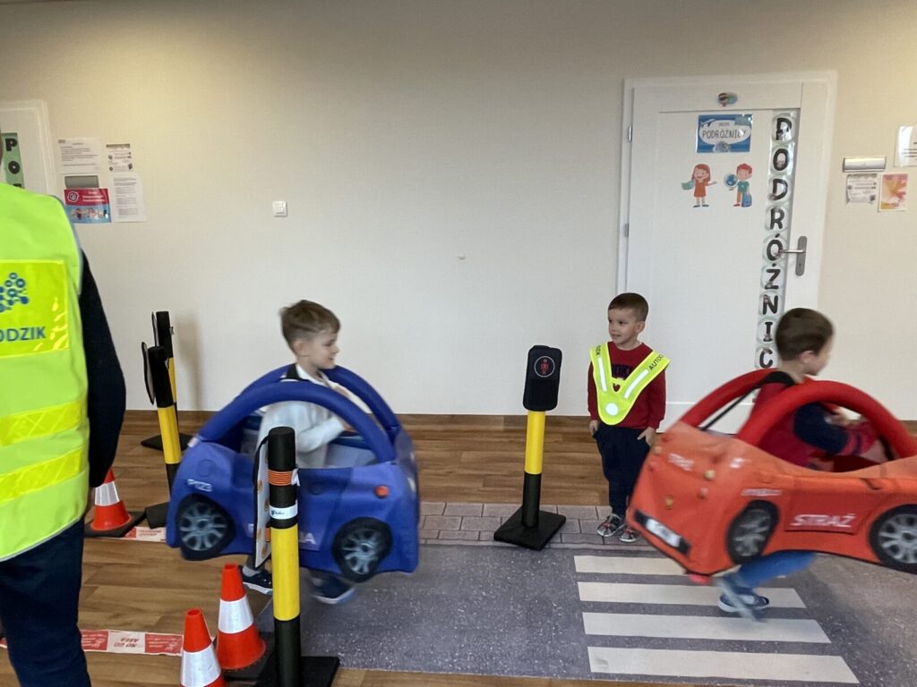 Autochodzik 19 listopada 2025 przez przedszkole Galeria zdjęć przedstawia dzieci podczas zajęć edukacyjnych na temat bezpieczeństwa na drodze.