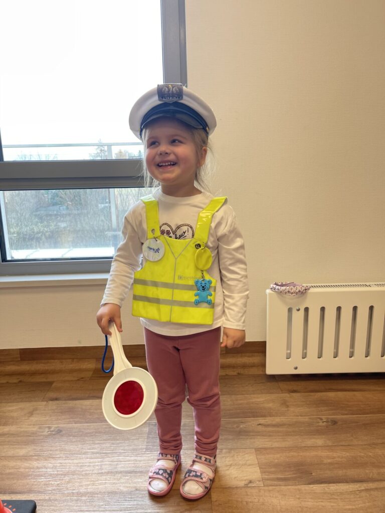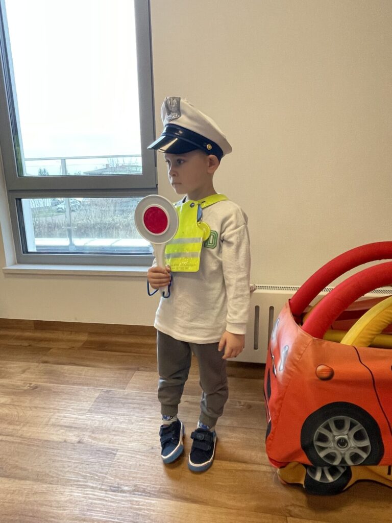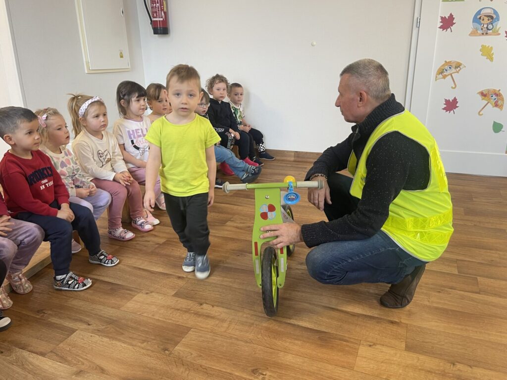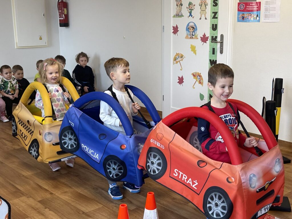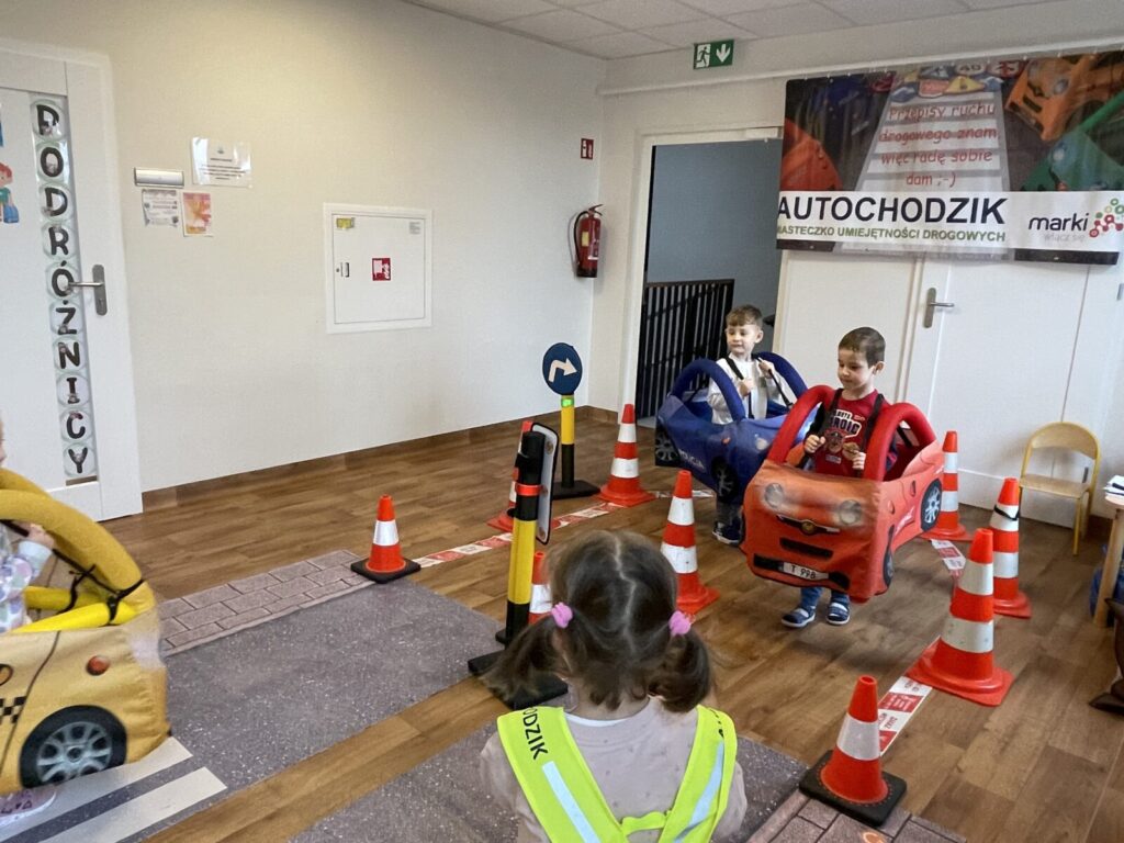 Autochodzik 19 listopada 2025 przez przedszkole Galeria zdjęć przedstawia dzieci podczas zajęć edukacyjnych na temat bezpieczeństwa na drodze.