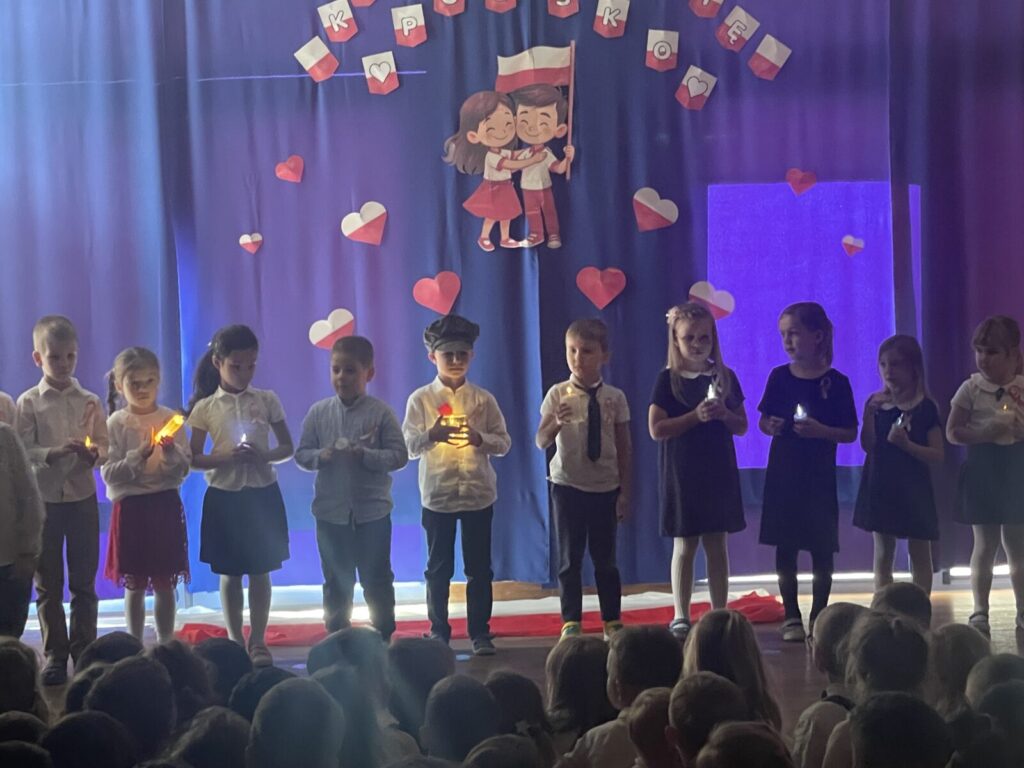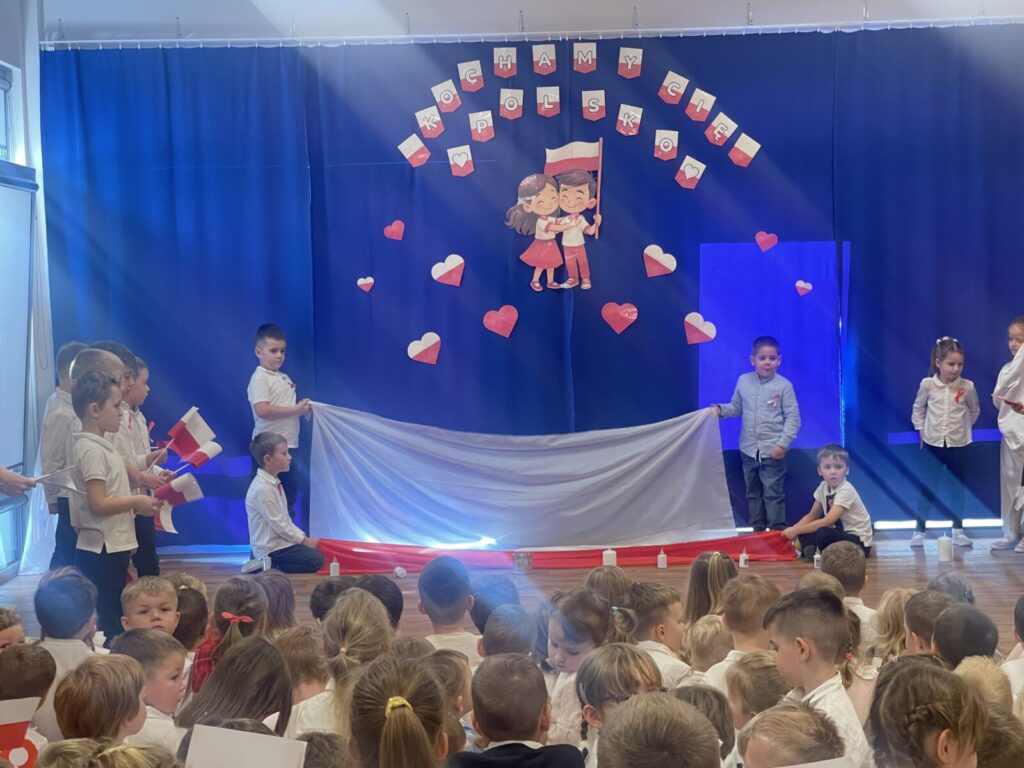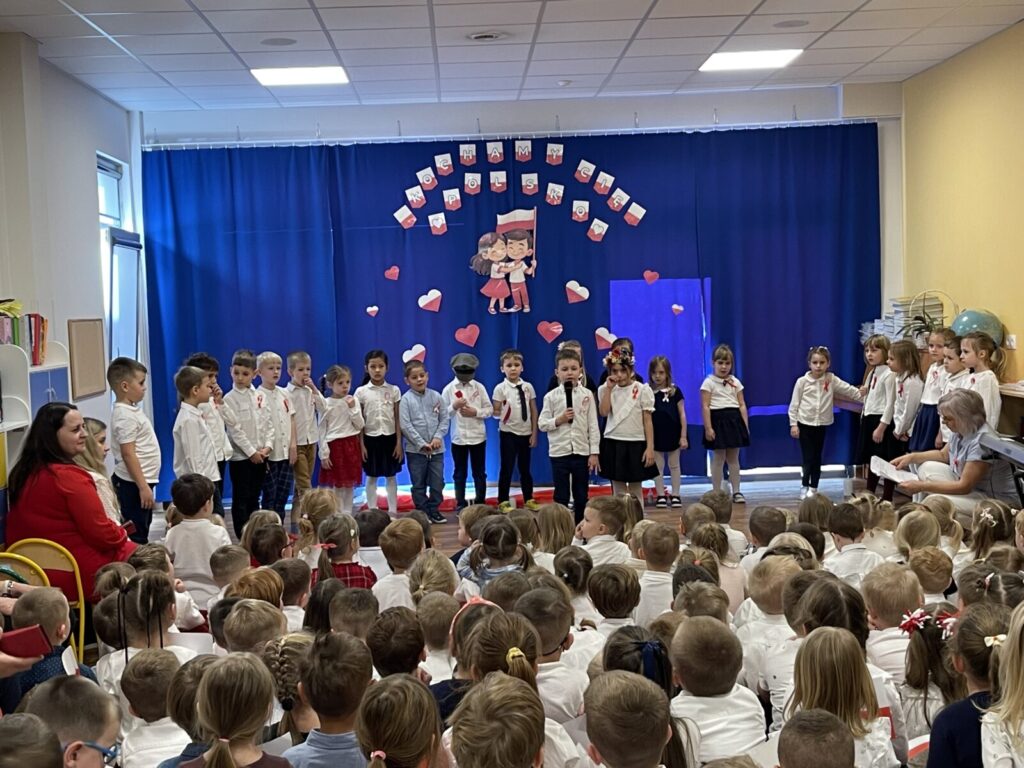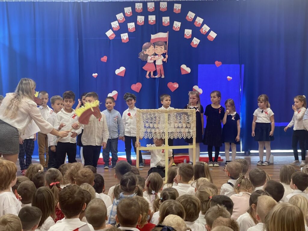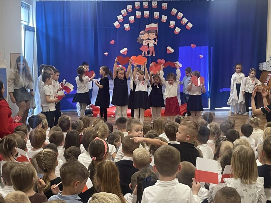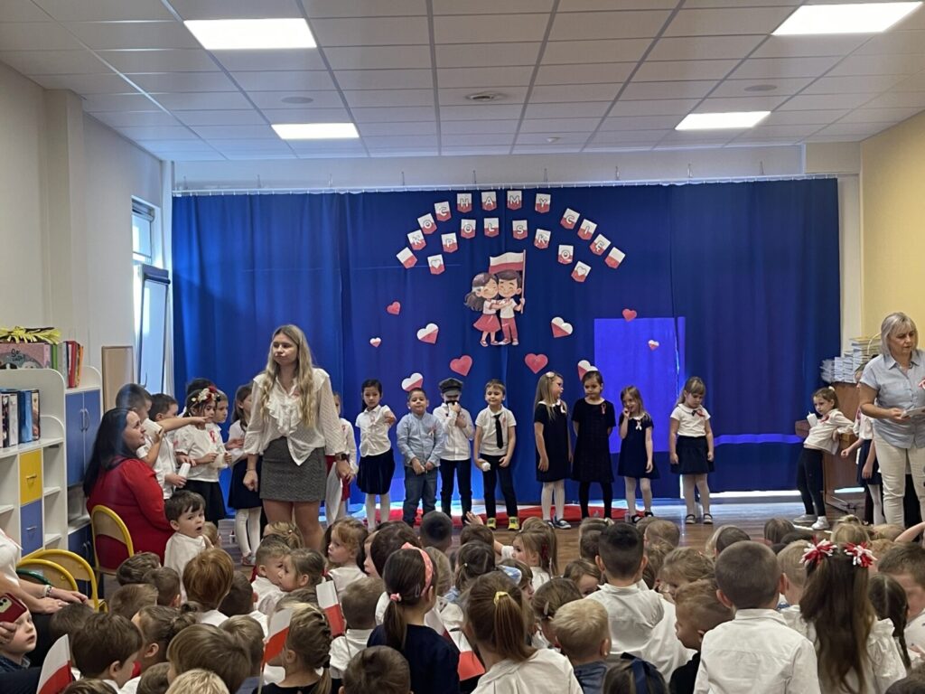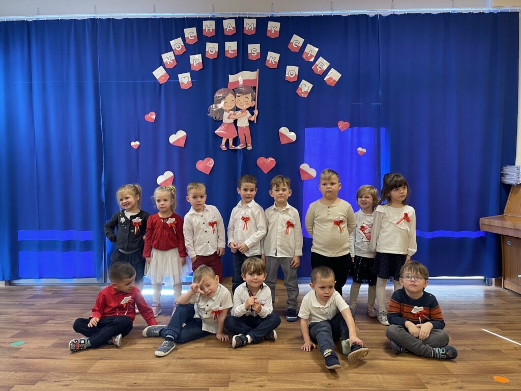 Narodowe Święto Odzyskania Niepodległości 19 listopada 2025 przez przedszkole Galeria zdjęć przedstawia dzieci podczas uroczystości z okazji Święta Odzyskania Niepodległości.