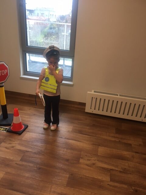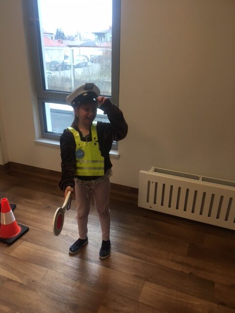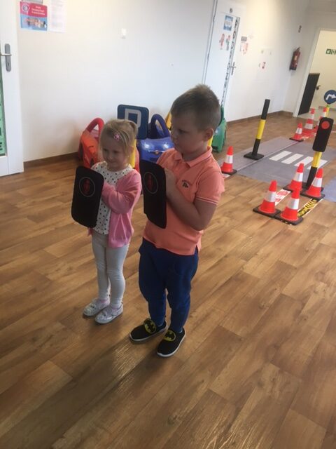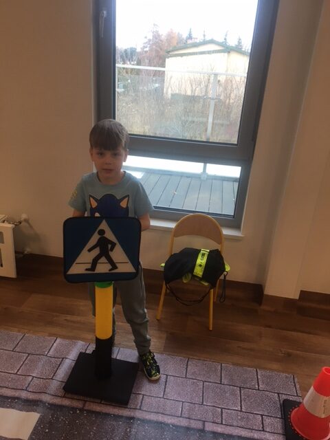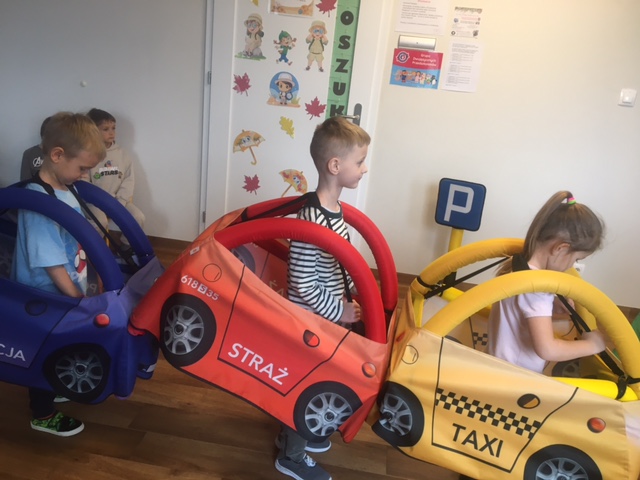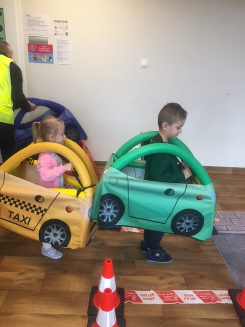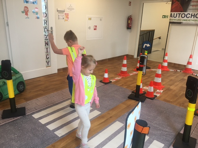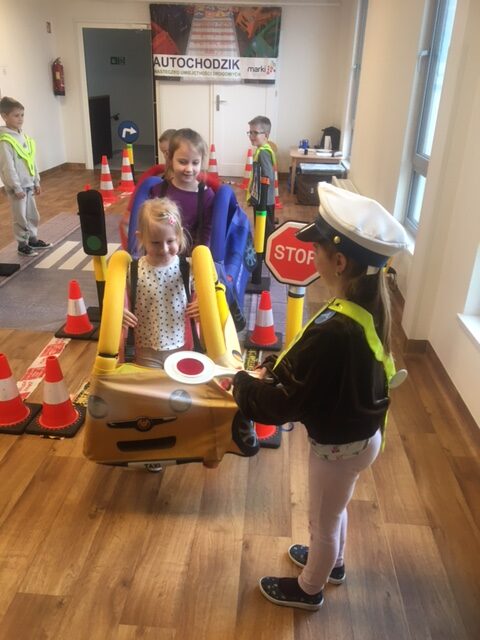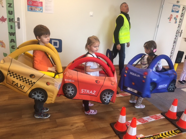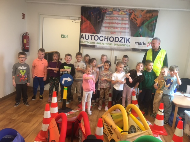 Autochodzik 20 listopada 2025 przez przedszkole Galeria zdjęć przedstawia dzieci podczas zajęć dotyczących zasad ruchu drogowego.