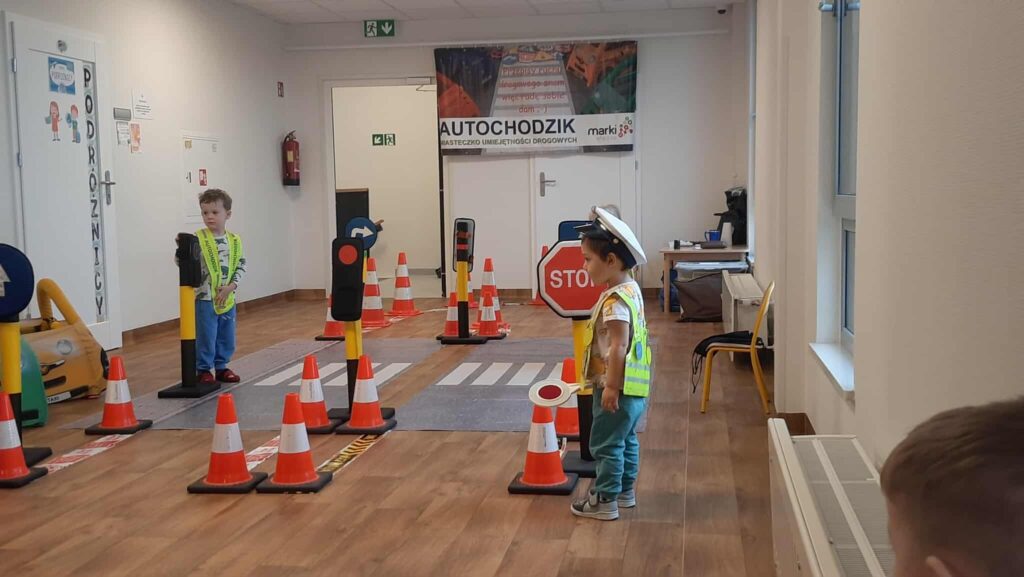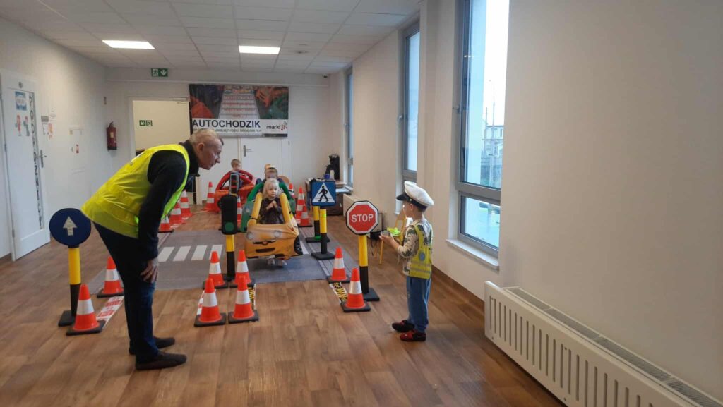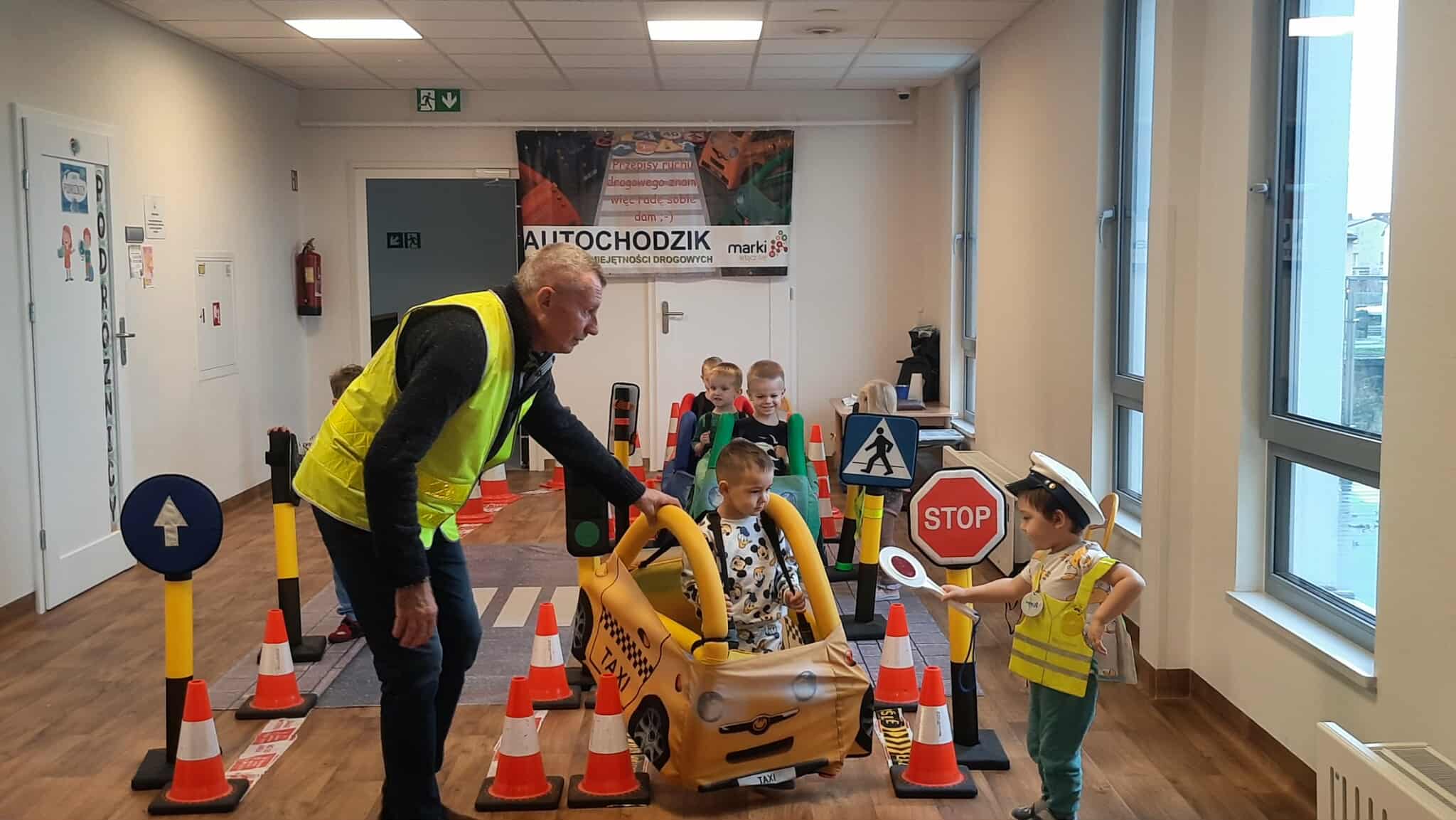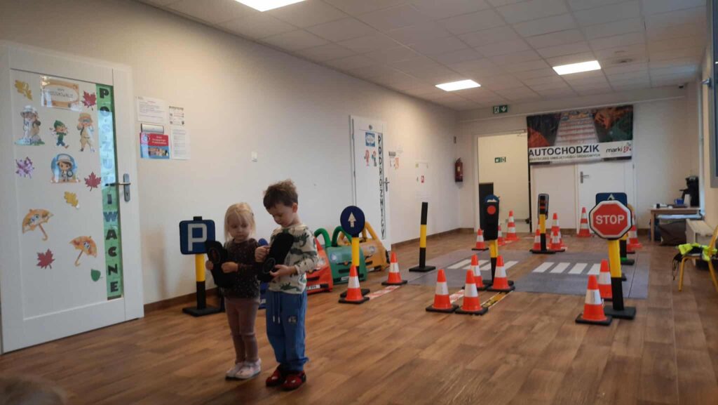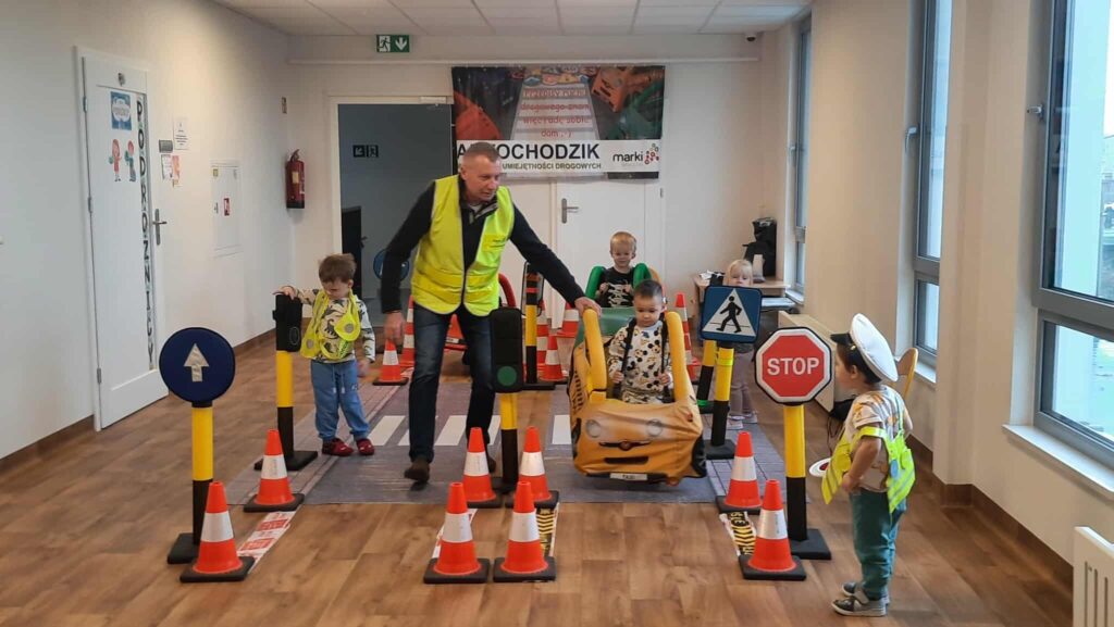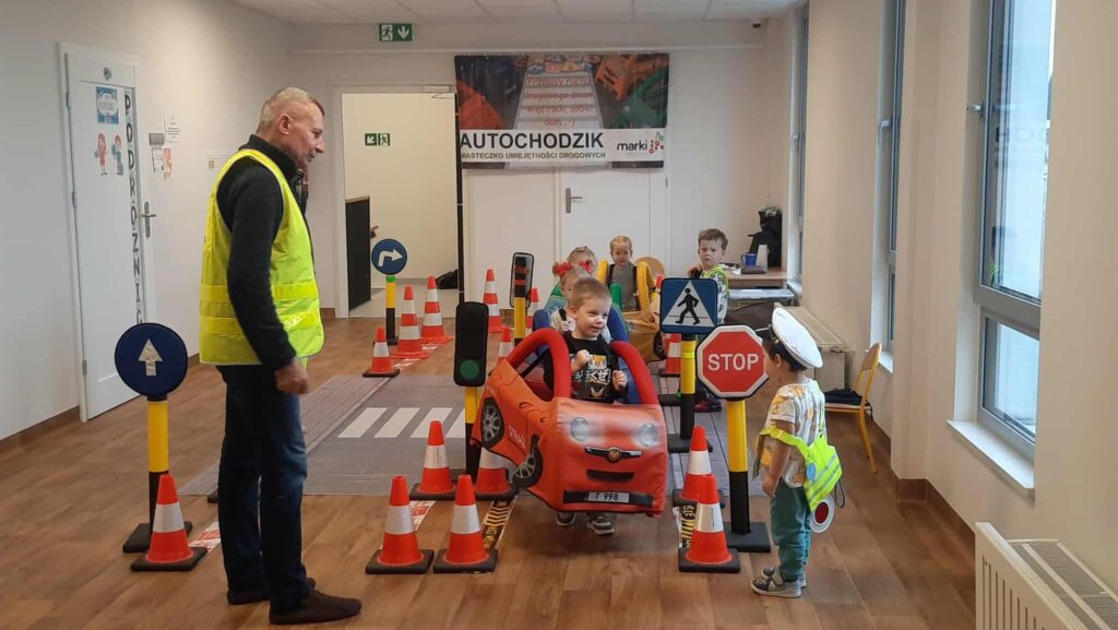„Autochodzik” – mobilne miasteczko ruchu drogowego. 20 listopada 2025 przez przedszkole Galeria zdjęć przedstawia dzieci podczas zajęć edukacyjnych na temat bezpieczeństwa na drodze.