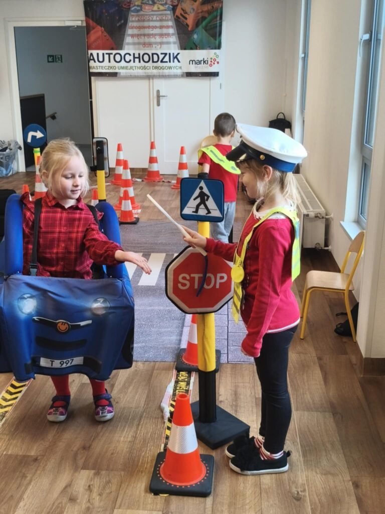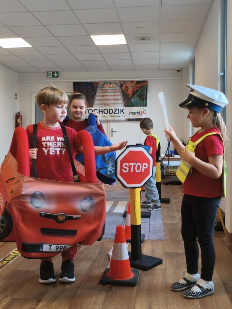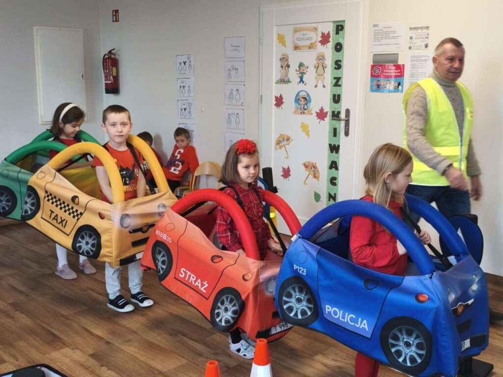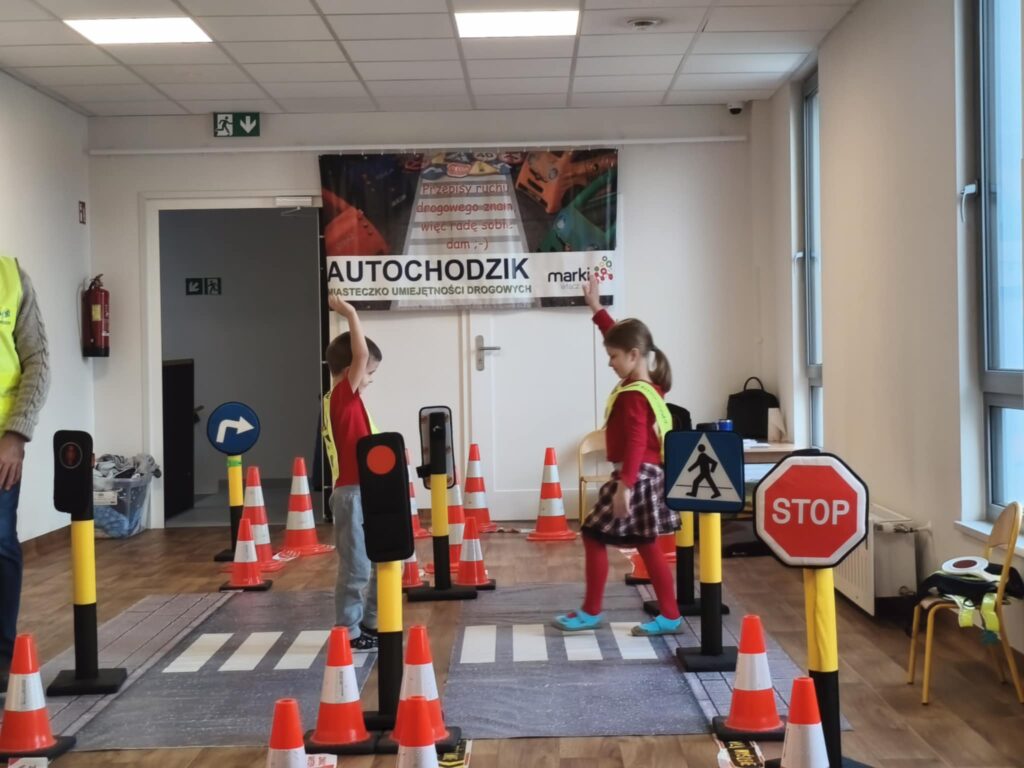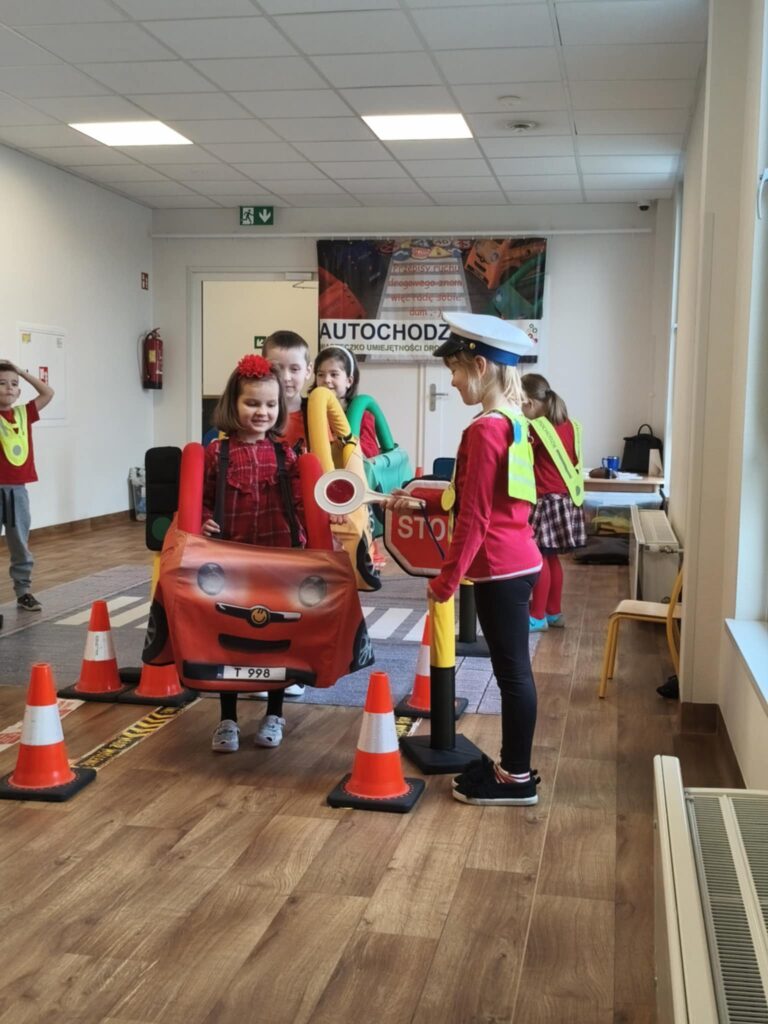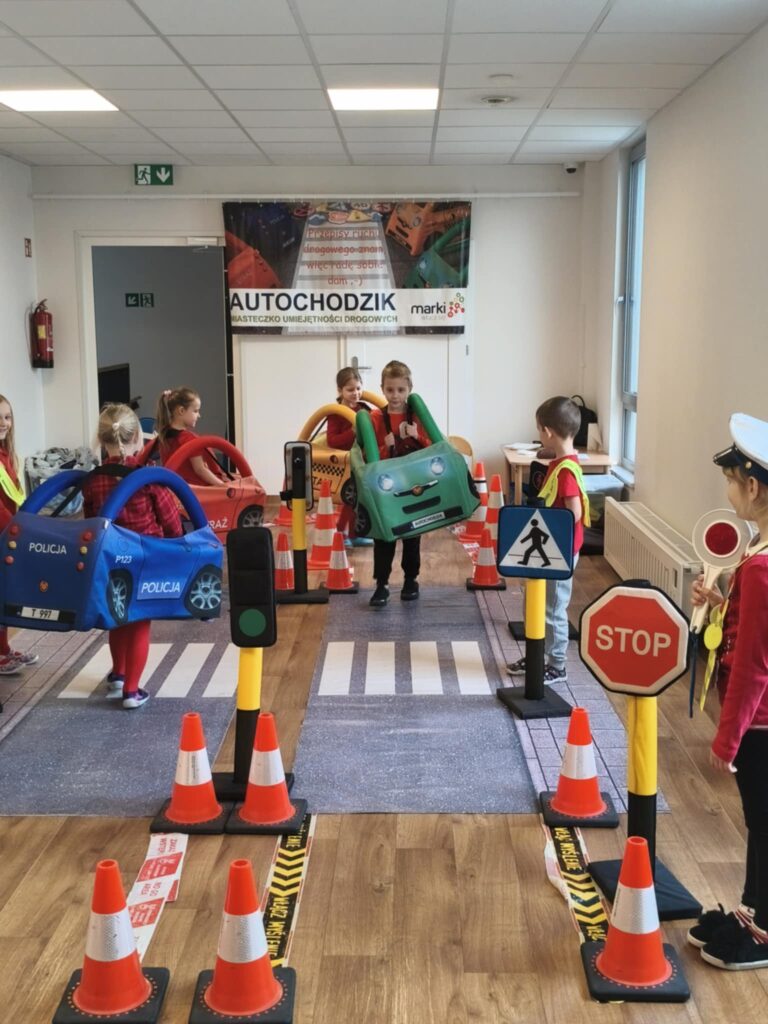 Autochodzik – mobilne miasteczko ruchu drogowego 20 listopada 2025 przez przedszkole Galeria zdjęć przedstawia dzieci podczas zajęć edukacyjnych na temat bezpieczeństwa na drodze