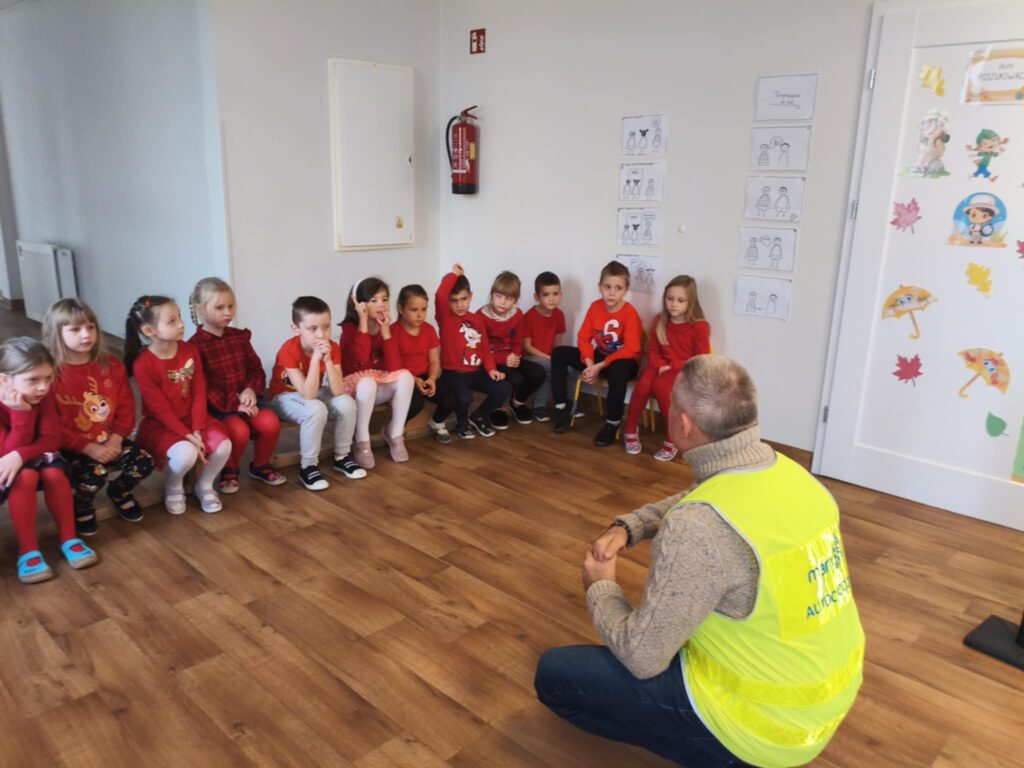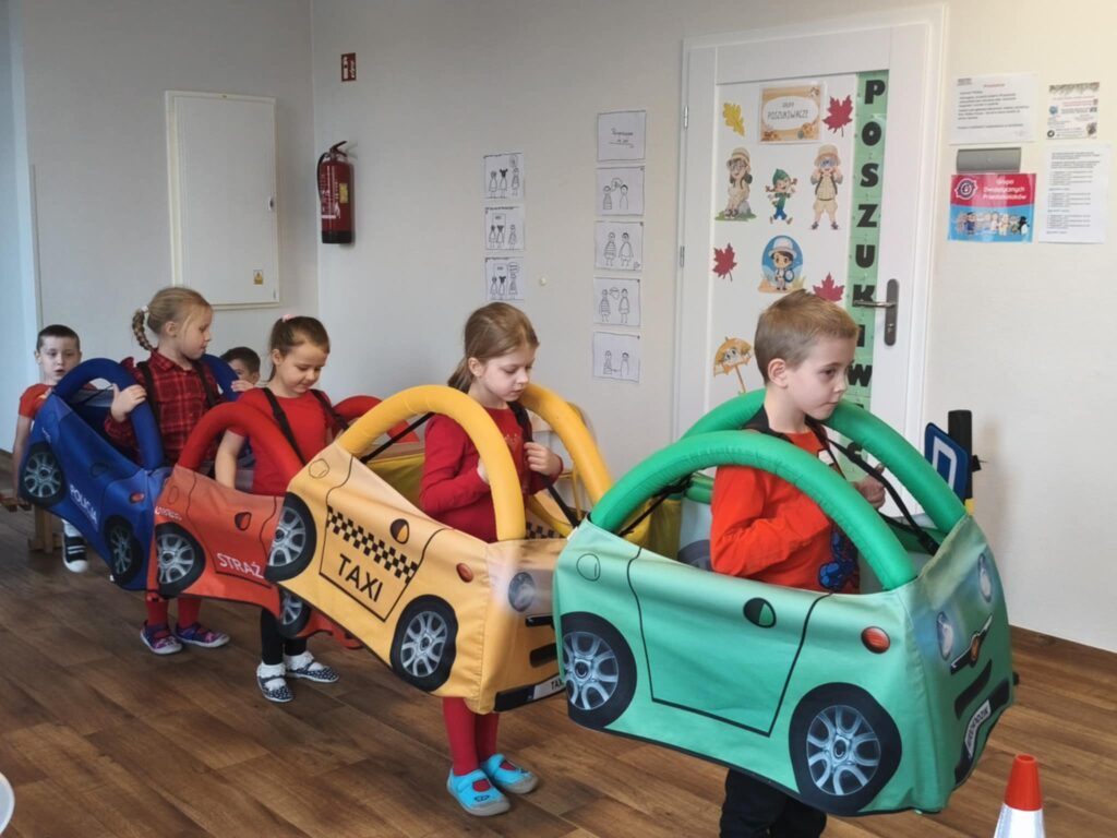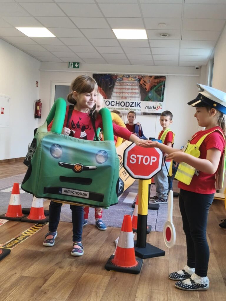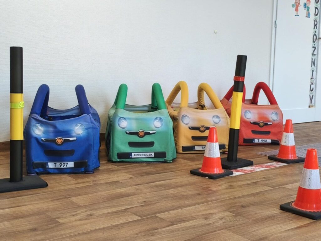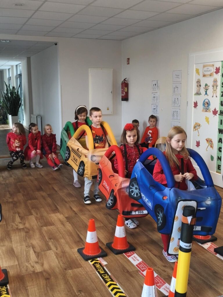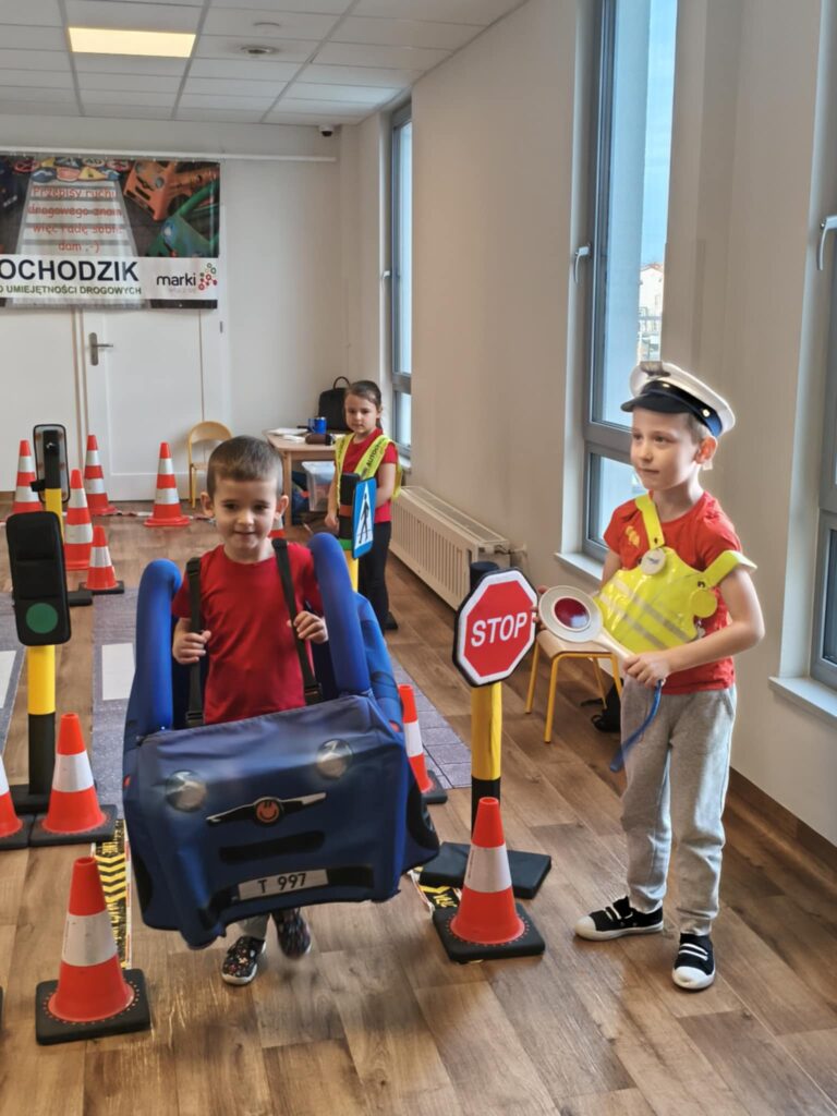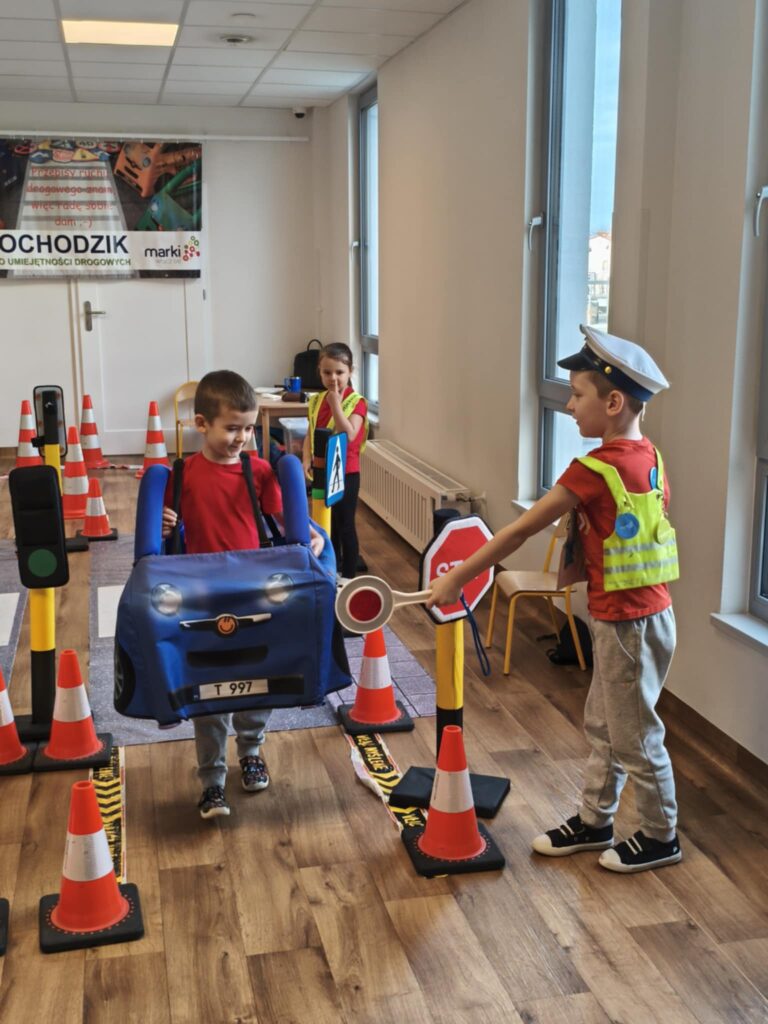Autochodzik – mobilne miasteczko ruchu drogowego 20 listopada 2025 przez przedszkole Galeria zdjęć przedstawia dzieci podczas zajęć edukacyjnych na temat bezpieczeństwa na drodze