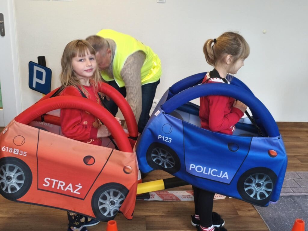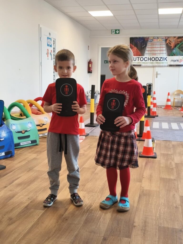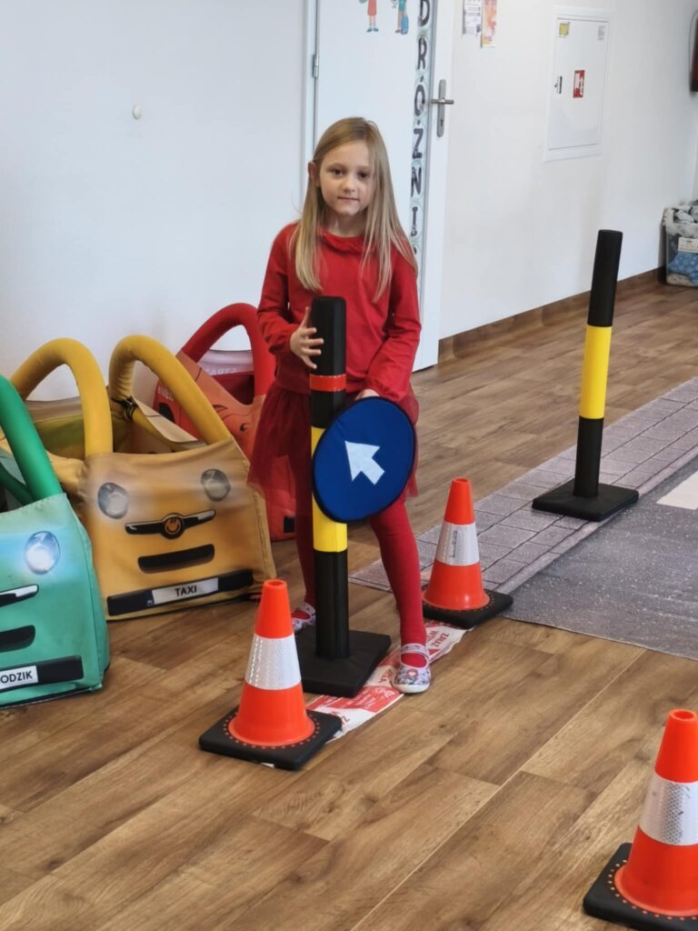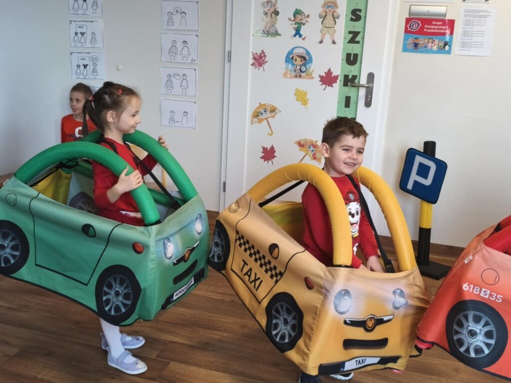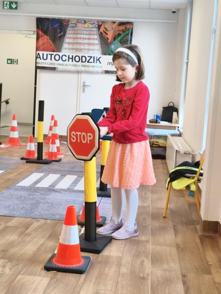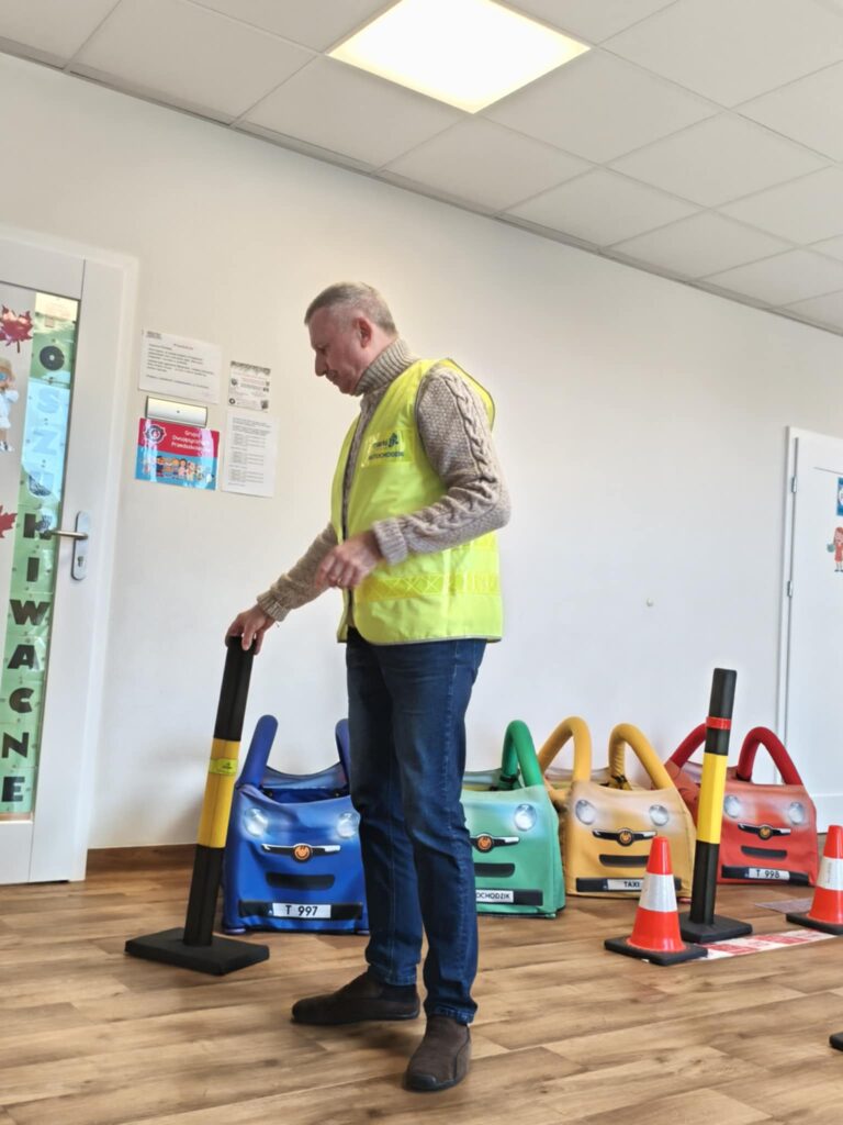 Autochodzik – mobilne miasteczko ruchu drogowego 20 listopada 2025 przez przedszkole Galeria zdjęć przedstawia dzieci podczas zajęć edukacyjnych na temat bezpieczeństwa na drodze