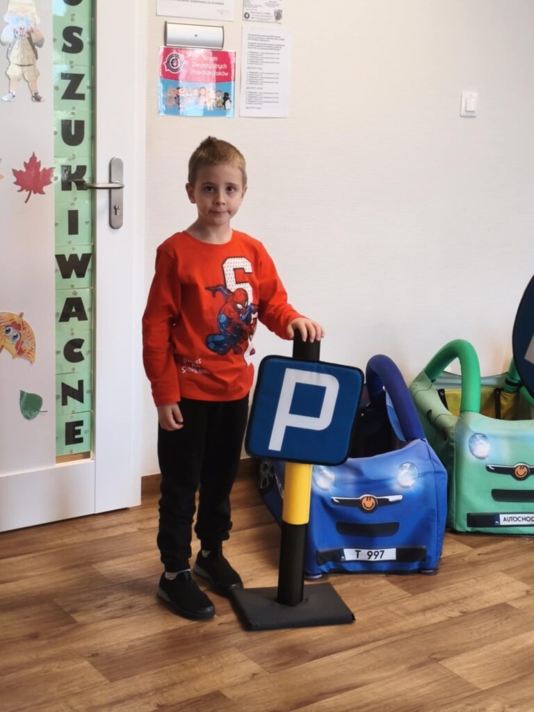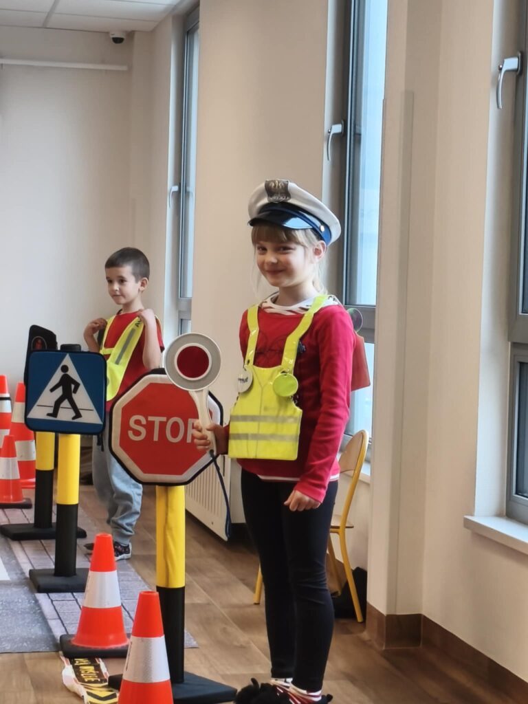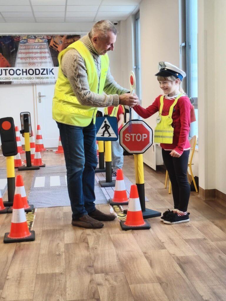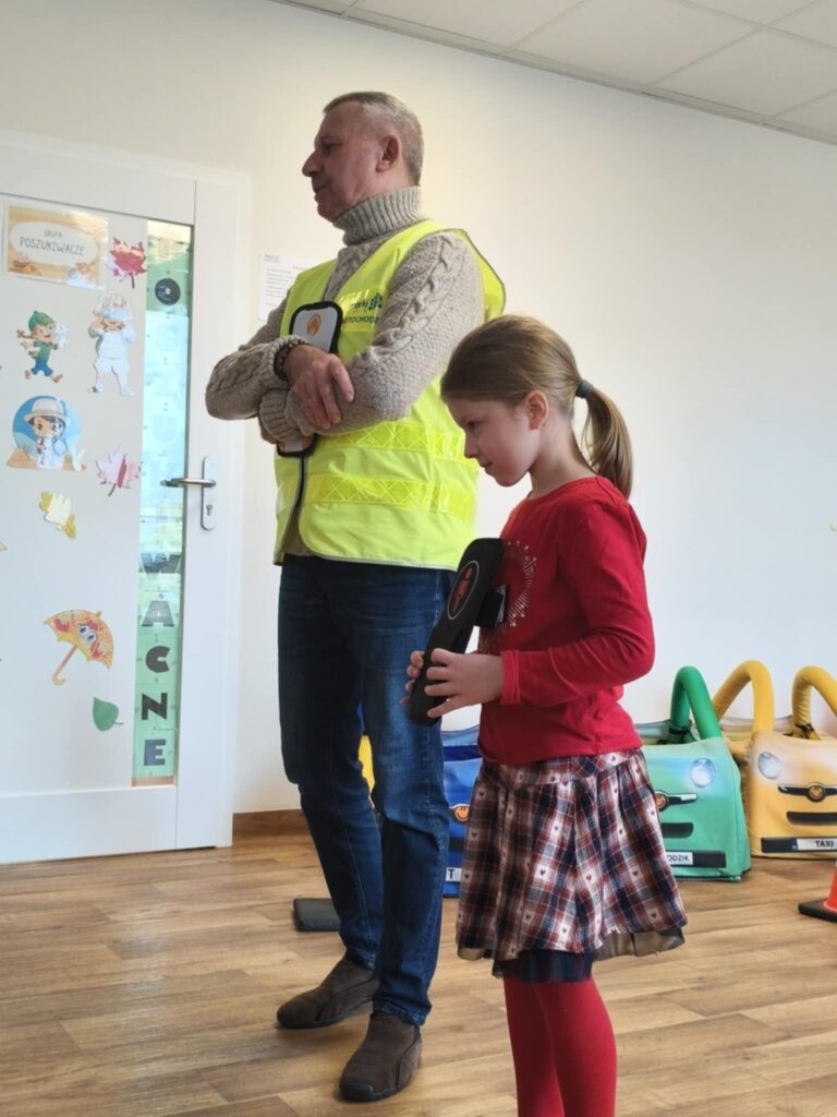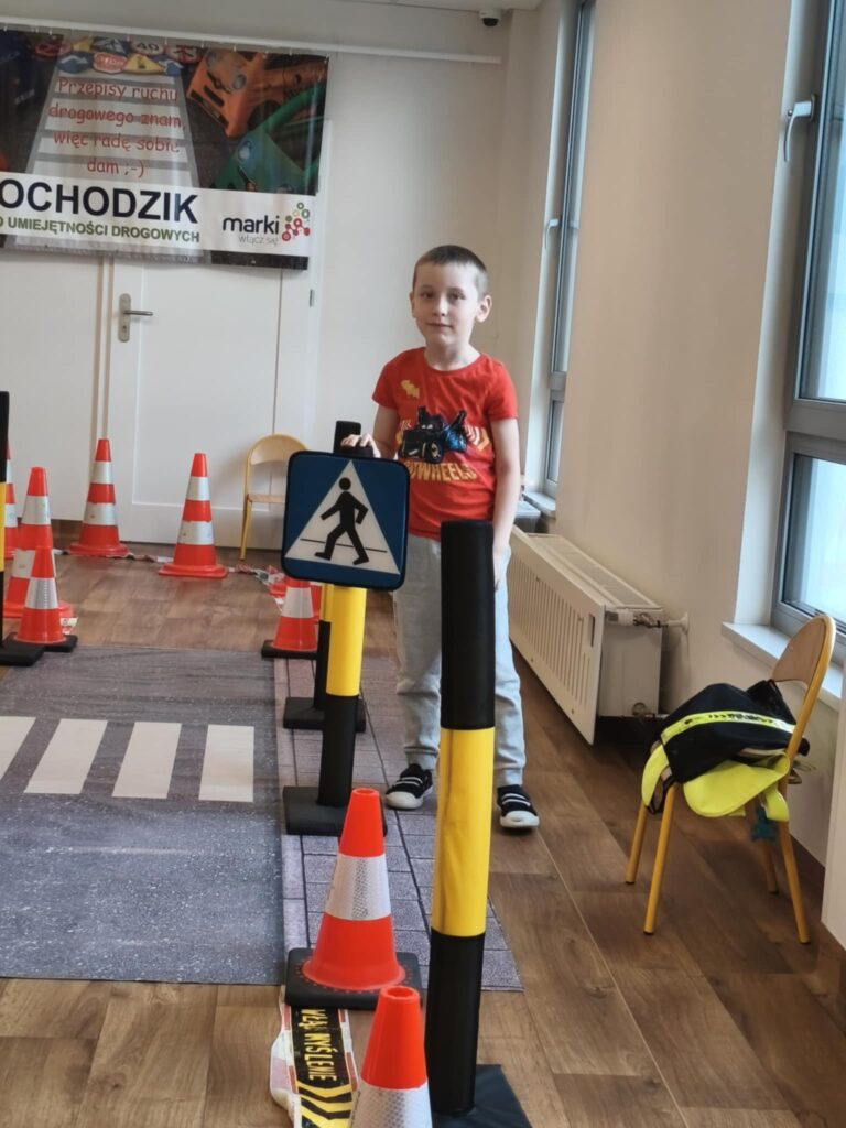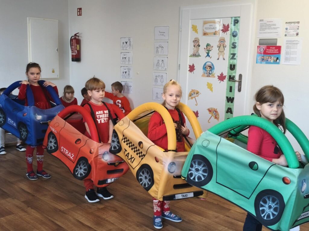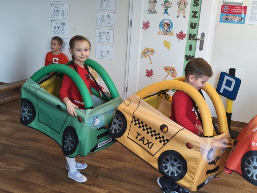 Autochodzik – mobilne miasteczko ruchu drogowego 20 listopada 2025 przez przedszkole Galeria zdjęć przedstawia dzieci podczas zajęć edukacyjnych na temat bezpieczeństwa na drodze