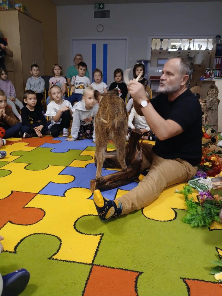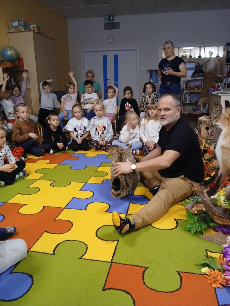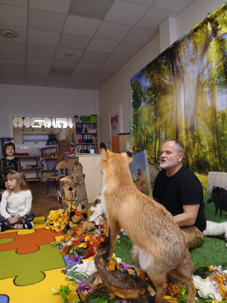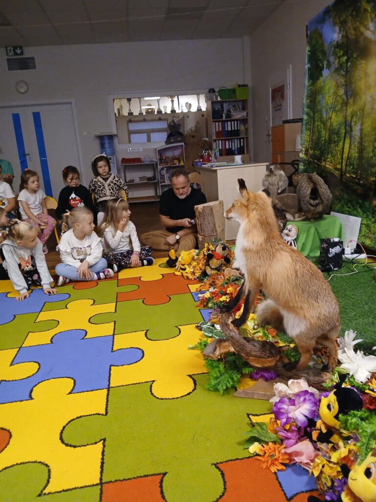 „Kto śpi zimą a kto nie” – warsztaty 20 listopada 2025 przez przedszkole Galeria zdjęć przedstawia dzieci podczas warsztatów przyrodniczych, na których dzieci poznały mieszkańców lasu.