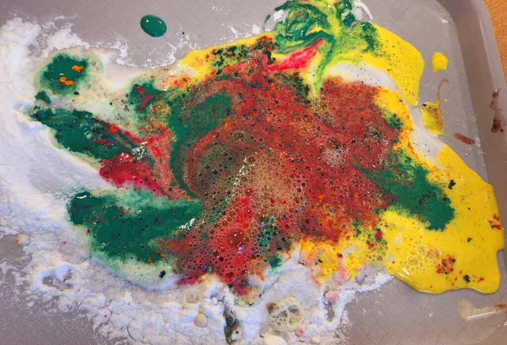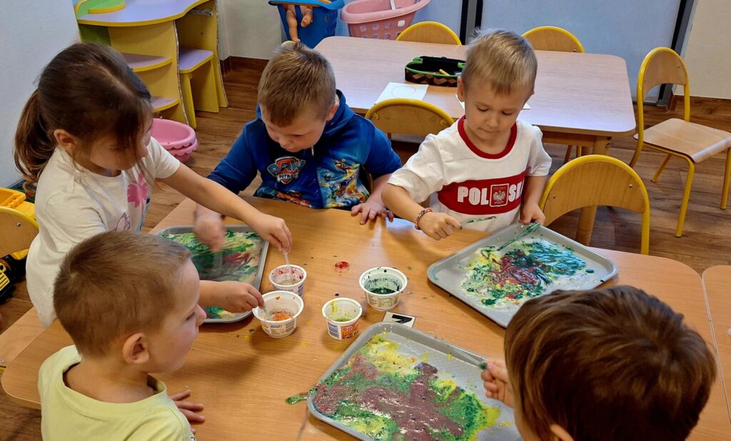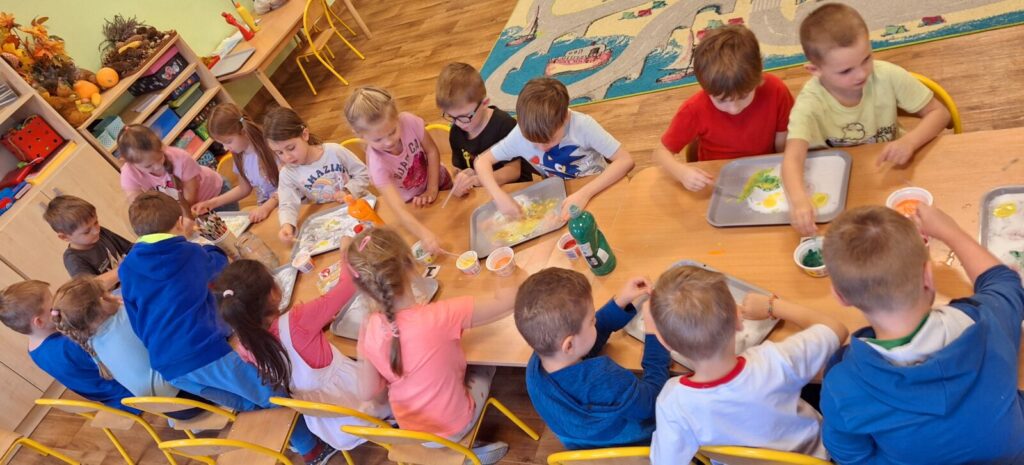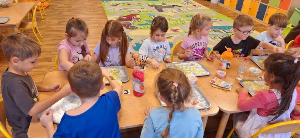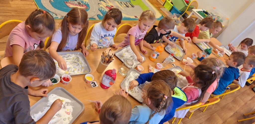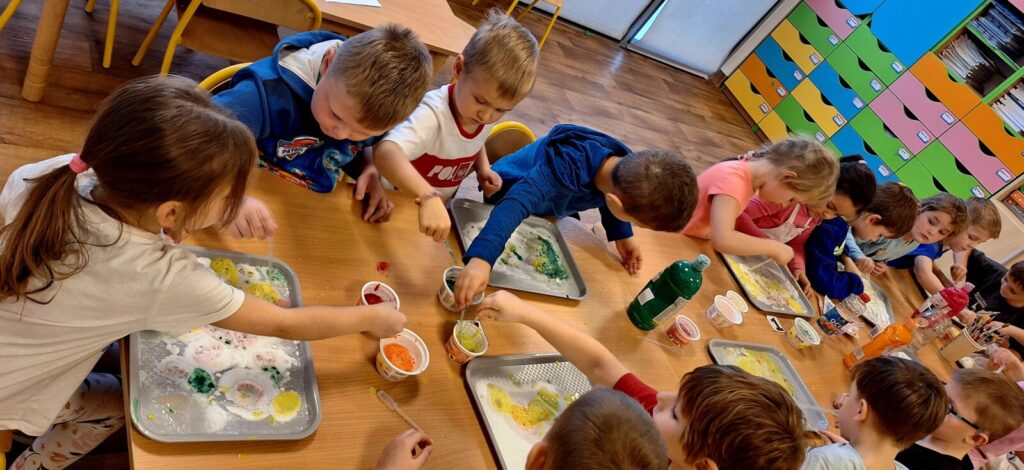 Galeria zdjęć przedstawia dzieci uczestniczące w eksperymencie, pt.: ,,Musujący obrazek”. Podczas doświadczenia przedszkolaki, na tacę z sodą za pomocą pipety nakładały kropelkami kolorową farbę z octem i patrzyły, jak obrazek ożywa. Dzięki temu eksperymentowi; rozwijały motorykę małą, stymulowały zmysły, rozbudzały ciekawość i kreatywność oraz poznawały podstawy chemii w praktyce.