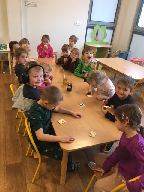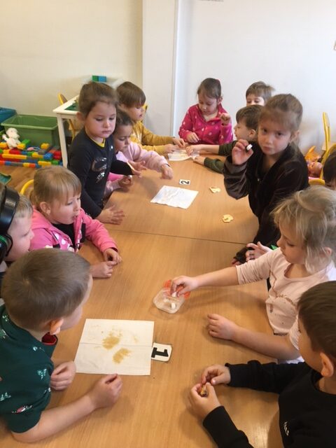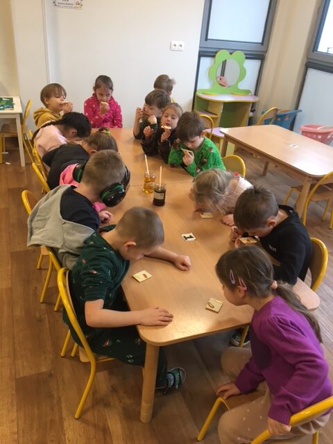 Galeria zdjęć przedstawia dzieci podczas zajęć. Przedszkolaki rozwiązały zagadkę dotyczącą miodu. Próbowały 2 rodzajów miodów – gryczanego i lipowego, opisywały ich smaki. Potem degustowały cukier w kostkach, cukier puder oraz cukier brązowy – opisywały smak, wygląd i konsystencję. Stwierdziły, że cukier jest niezdrowy i jeżeli możemy, to warto go zamienić na miód.