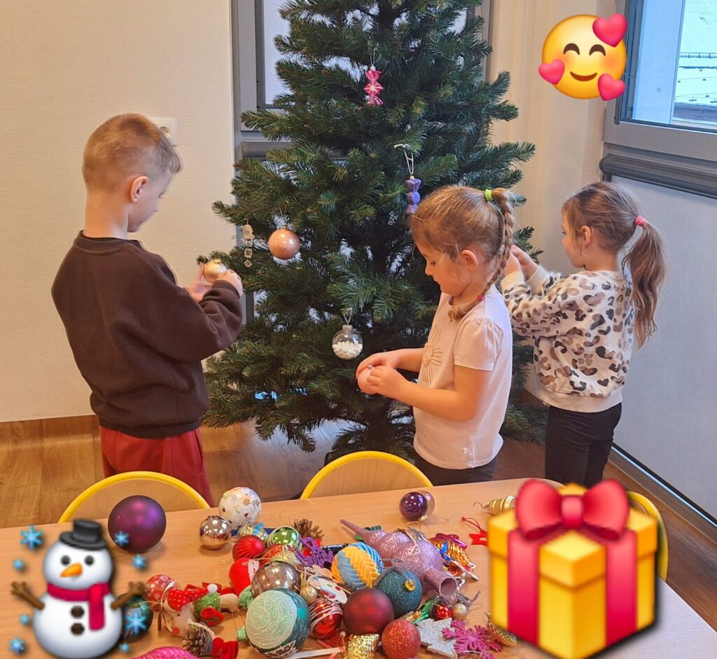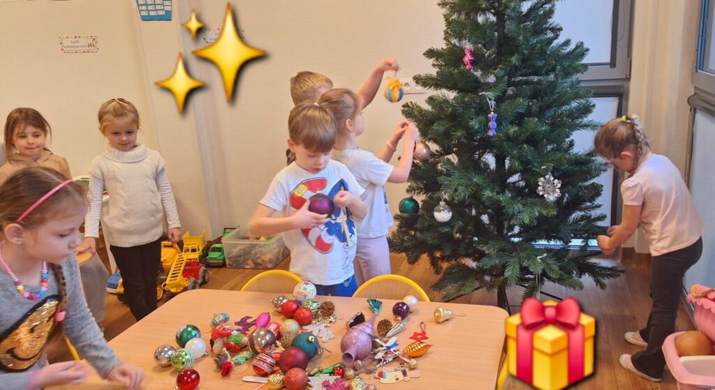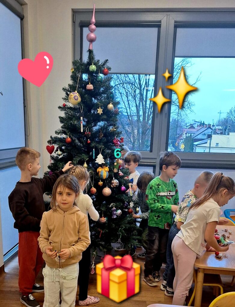 Galeria zdjęć przedstawia dzieci uczestniczące w ubieraniu świątecznego drzewka. Przedszkolaki z wielkim zaangażowaniem wieszały ozdoby na choinkę, słuchając świątecznych utworów. Gdy drzewko jest, już ubrane wszyscy wiedzą, że niedługo odwiedzi nas Św. Mikołaj, a Święta Bożego Narodzenia są tuż, tuż.