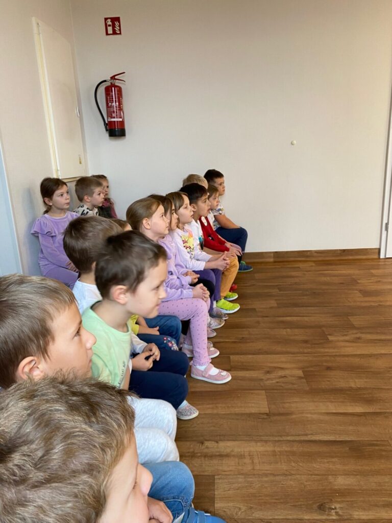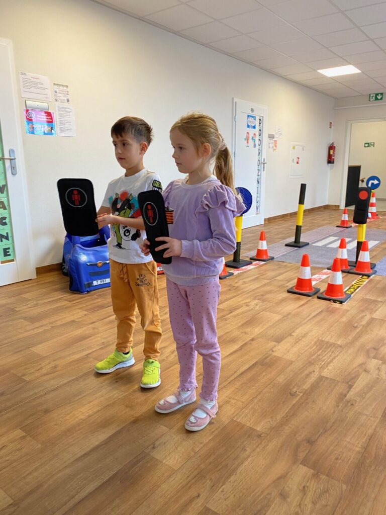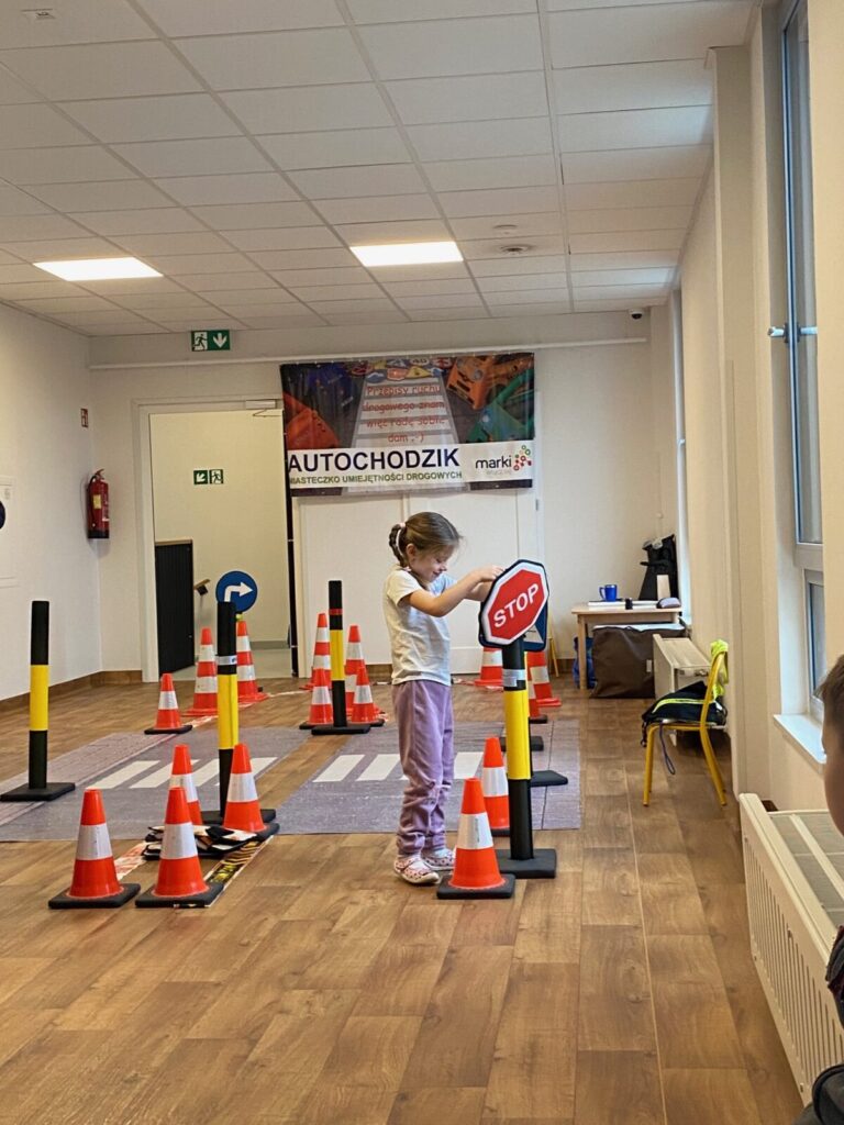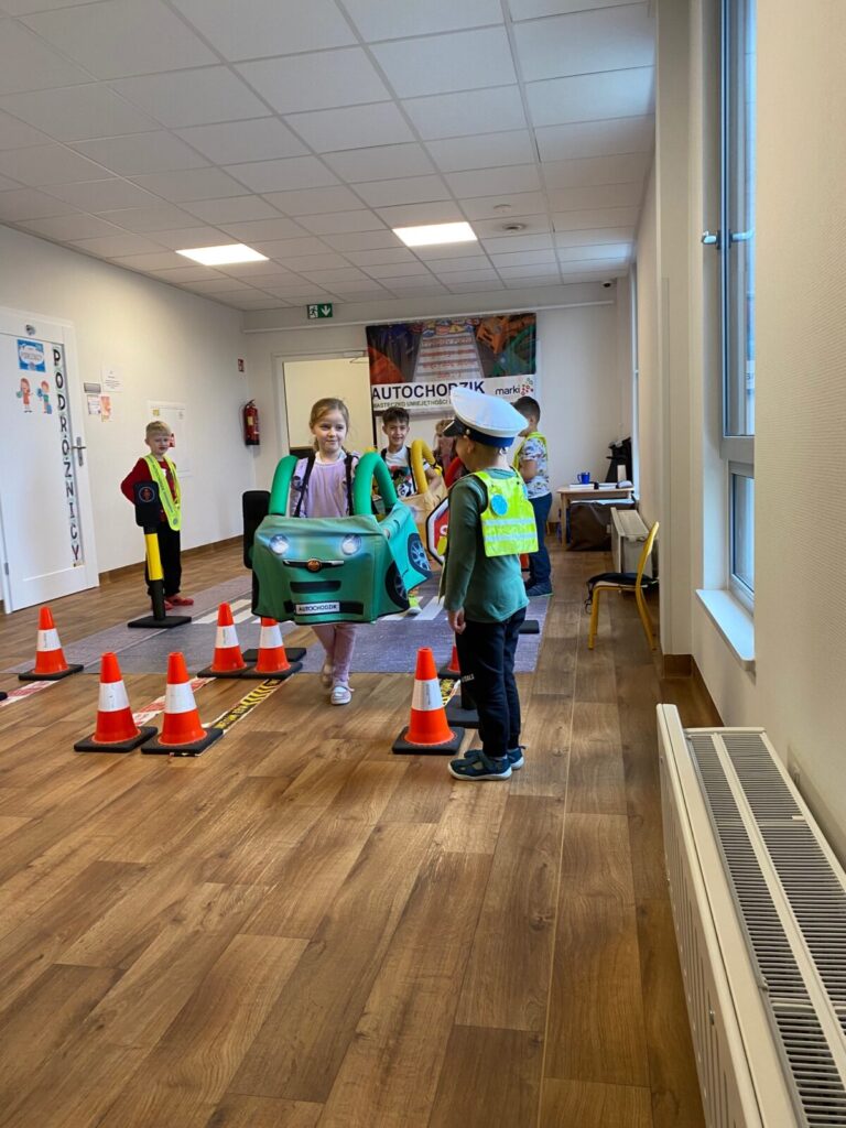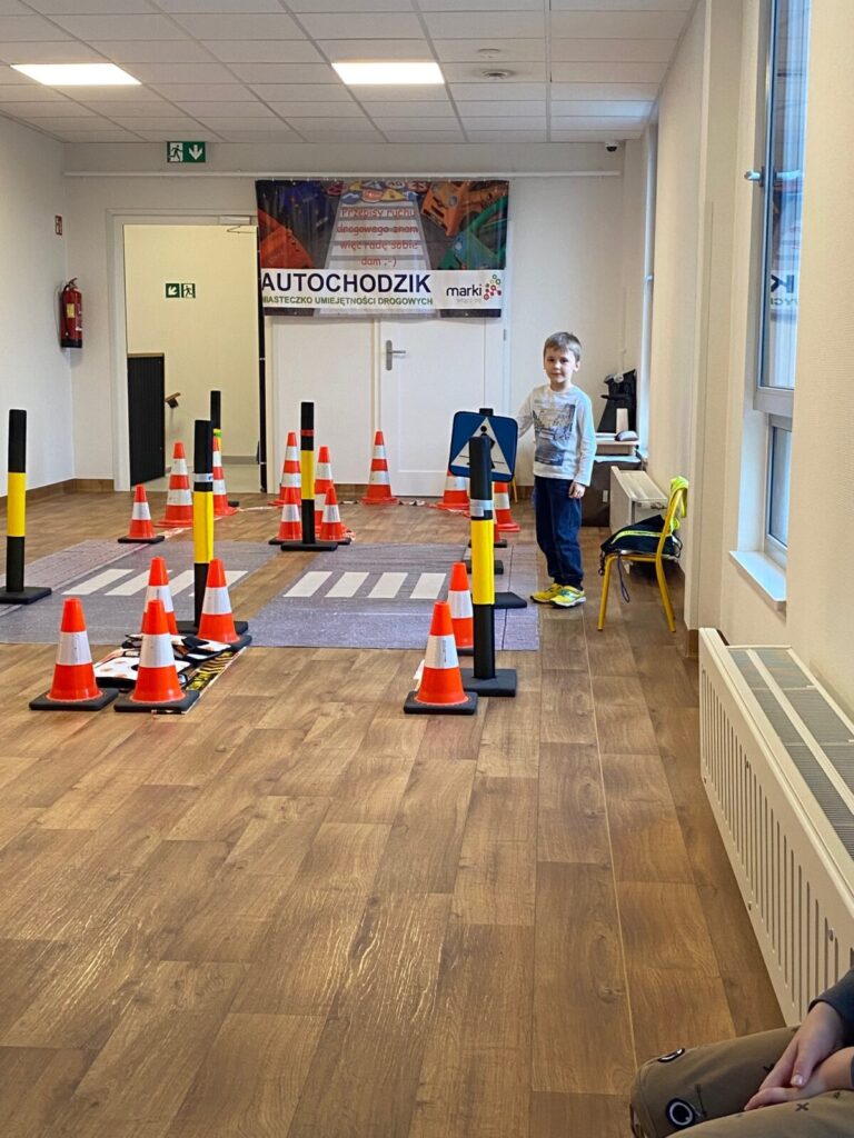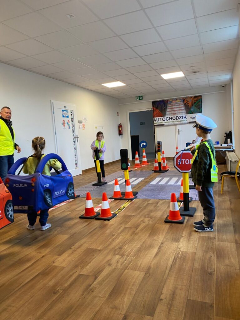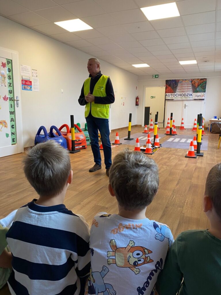 Autochodzik – mobilne miasteczko ruchu drogowego 30 listopada 2025 przez przedszkole Zdjęcia przedstawiają dzieci podczas zajęć z Panem Pawłem Paczkiem o bezpieczeństwie na drodze.