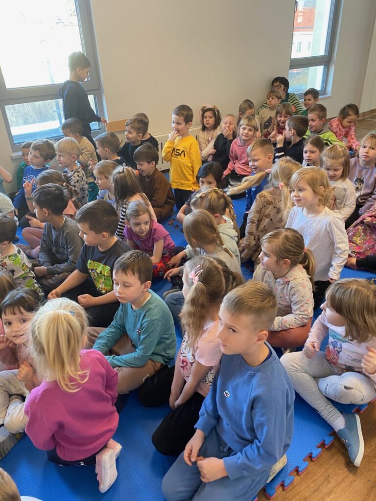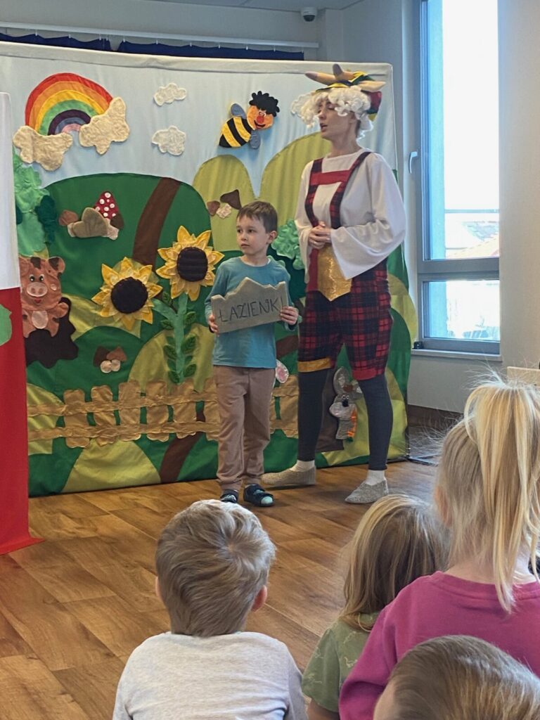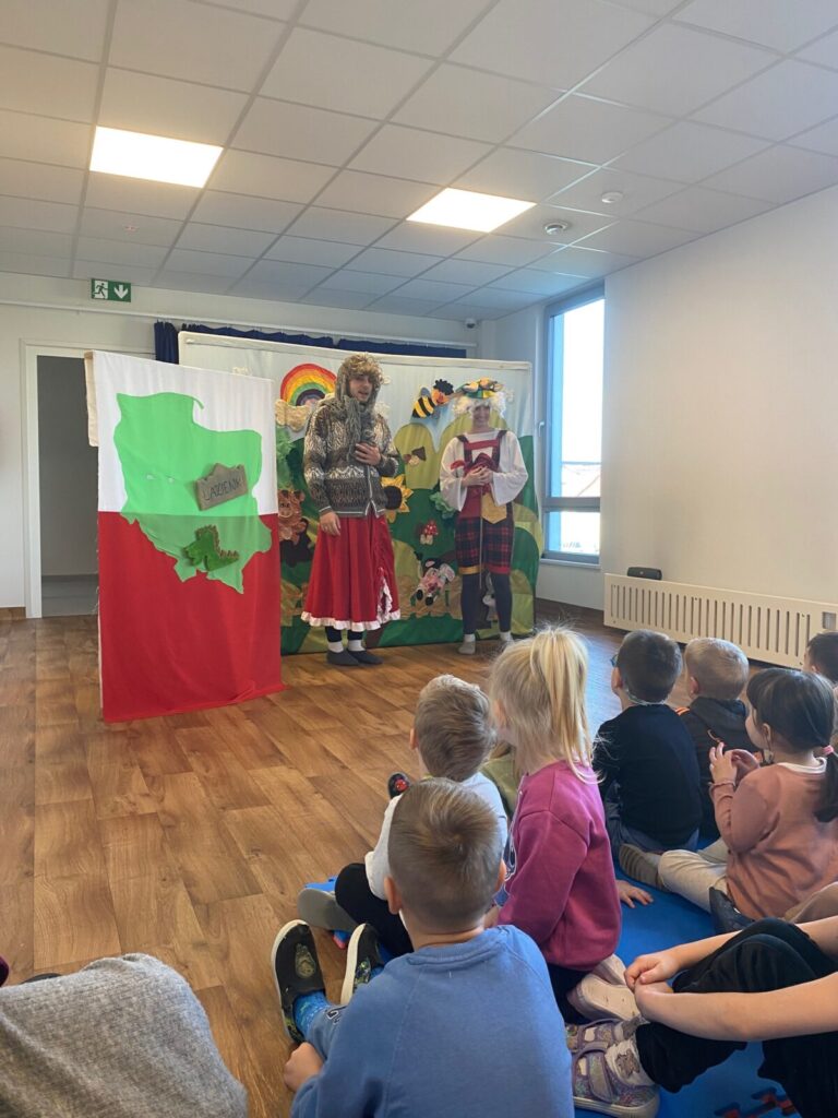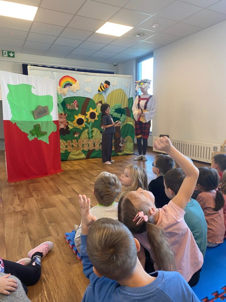 „Jak Koziołek Matołek odkrył co to jest patriotyzm”-teatrzyk 30 listopada 2025 przez przedszkole Zdjęcia przedstawiają dzieci podczas oglądanie teatrzyku.