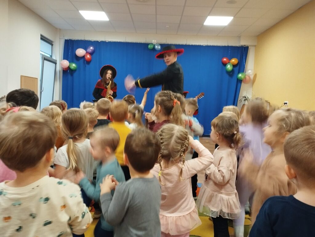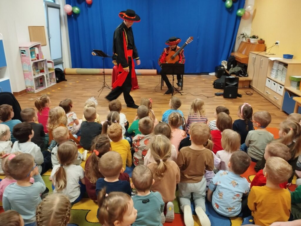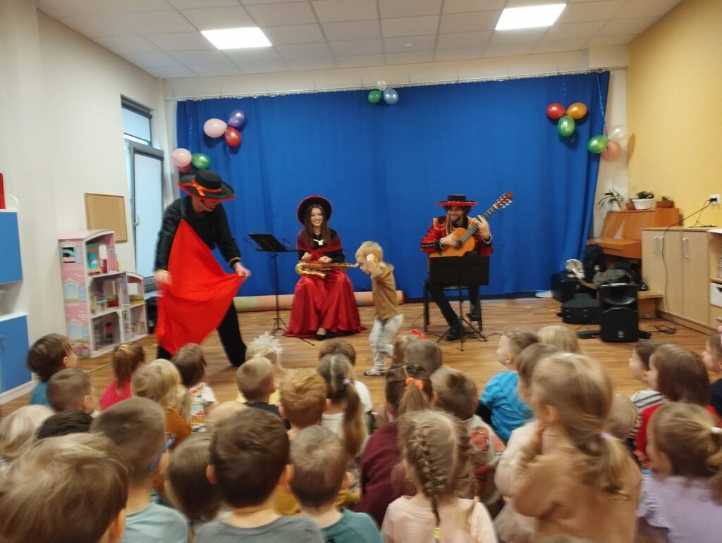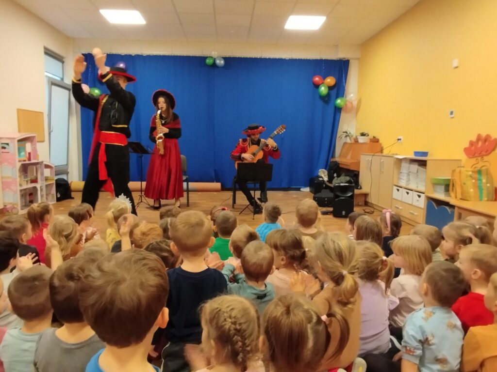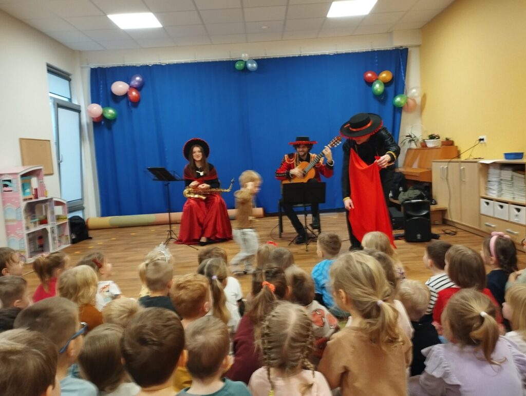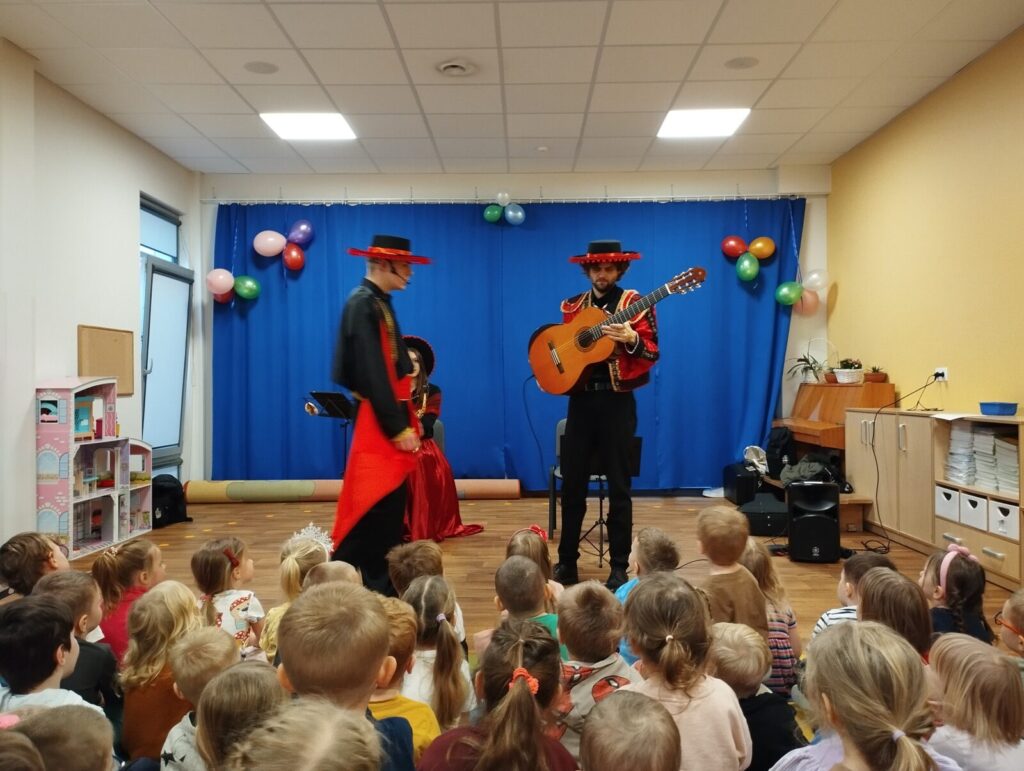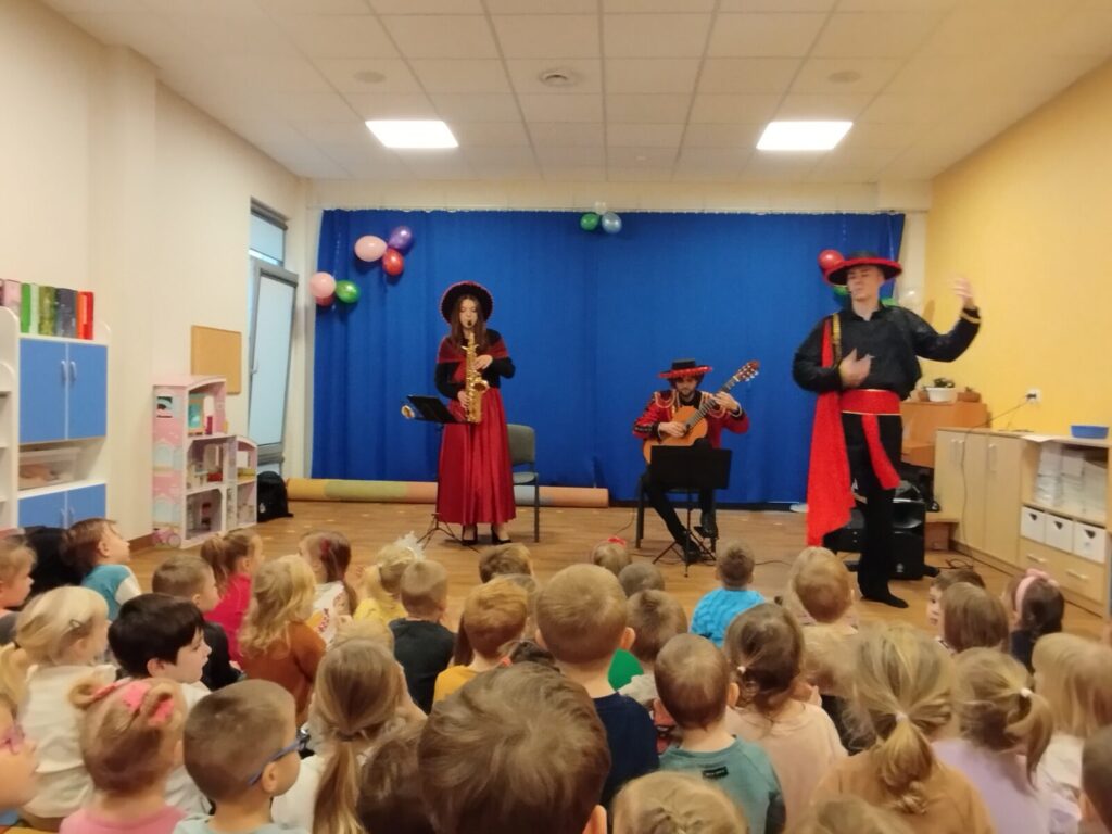 Galeria zdjęć przedstawia dzieci obecne w tym dniu. Przedszkolaki poznały muzykę hiszpańską oraz wysłuchały bajkę muzyczną, pt. „Jak zostałem królem Hiszpanii”. Dzieci zostały też zapoznane z brzmieniem saksofonu i gitary klasycznej oraz poznały ich budowę.
