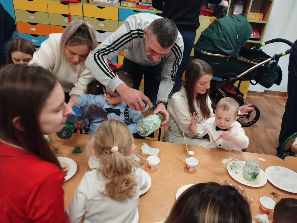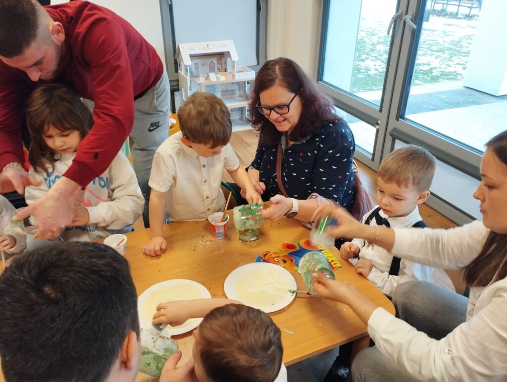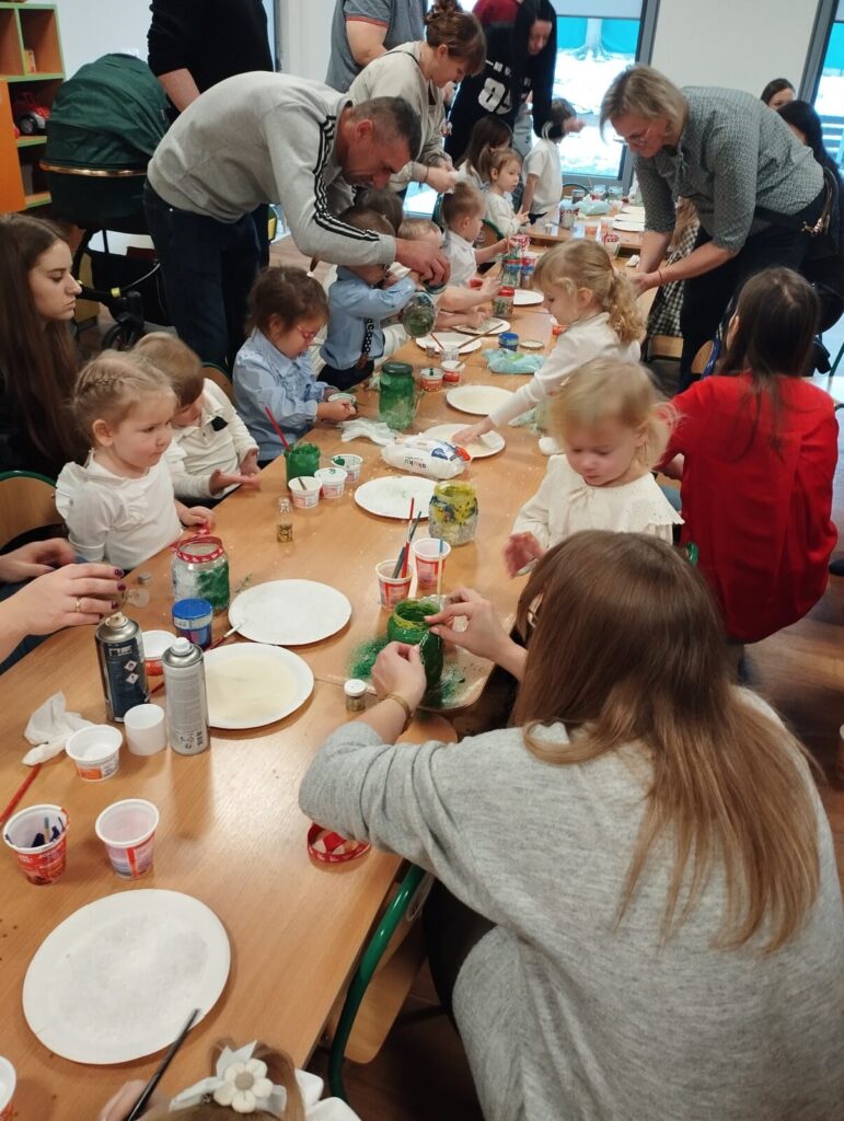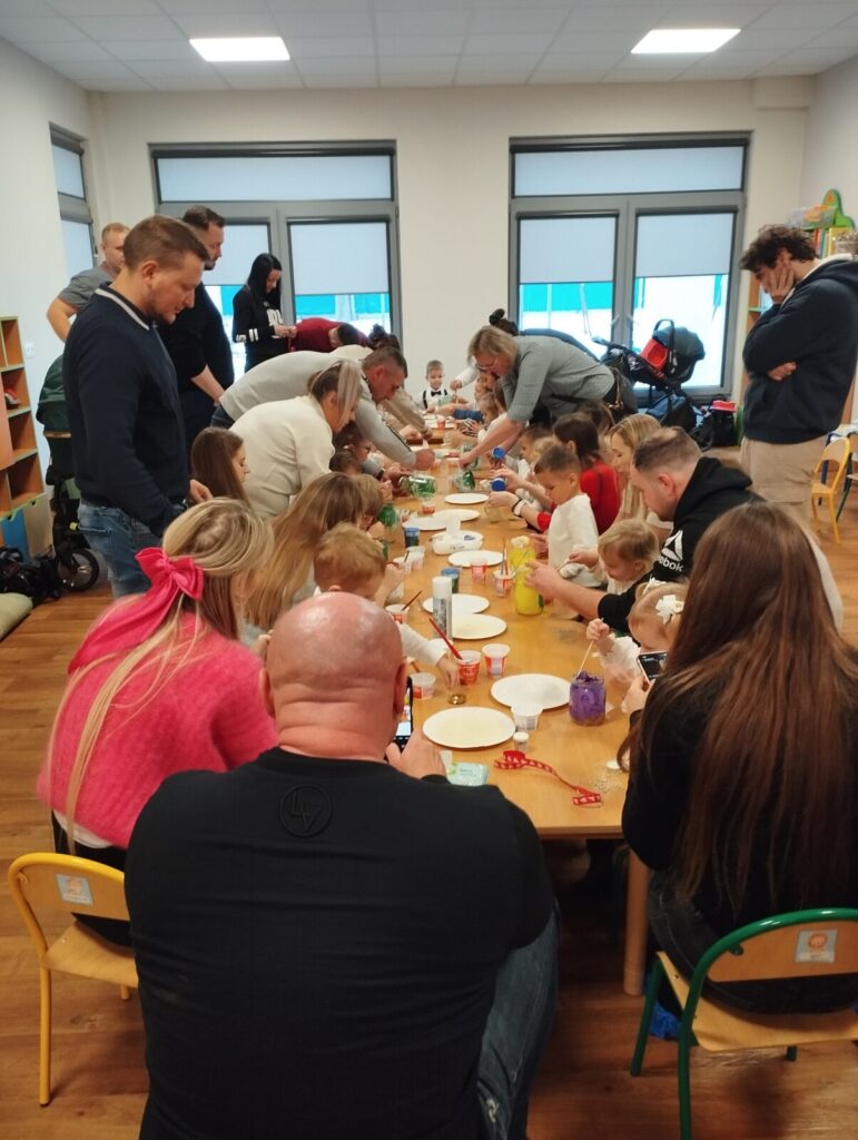Warsztaty świąteczne z Rodzicami 30 listopada 2025 przez przedszkole Galeria zdjęć przedstawia dzieci wykonujące razem z rodzicami lampiony.