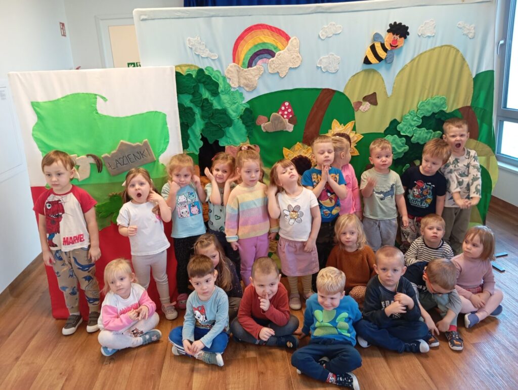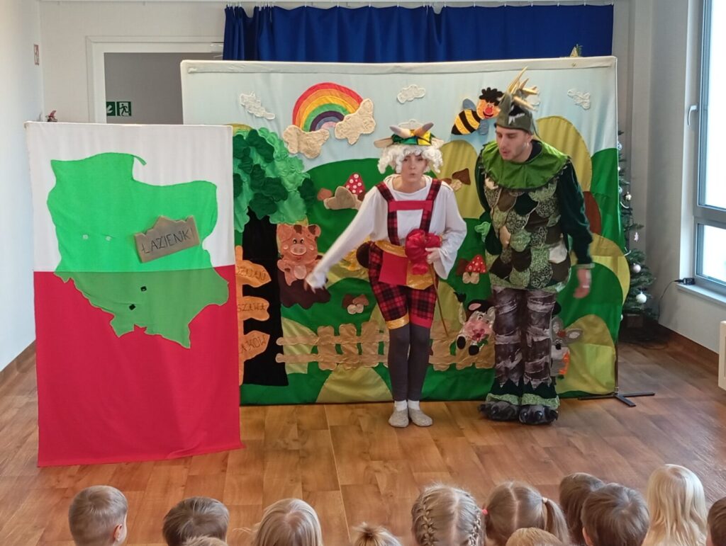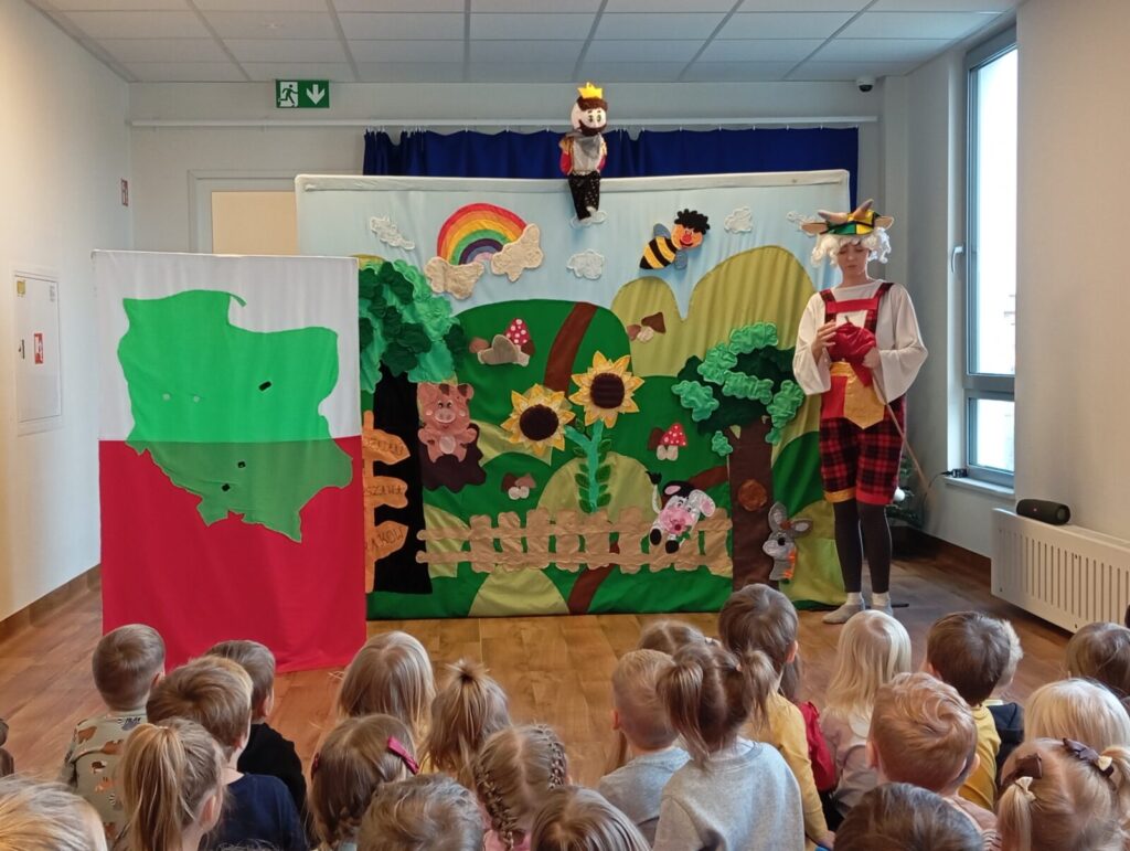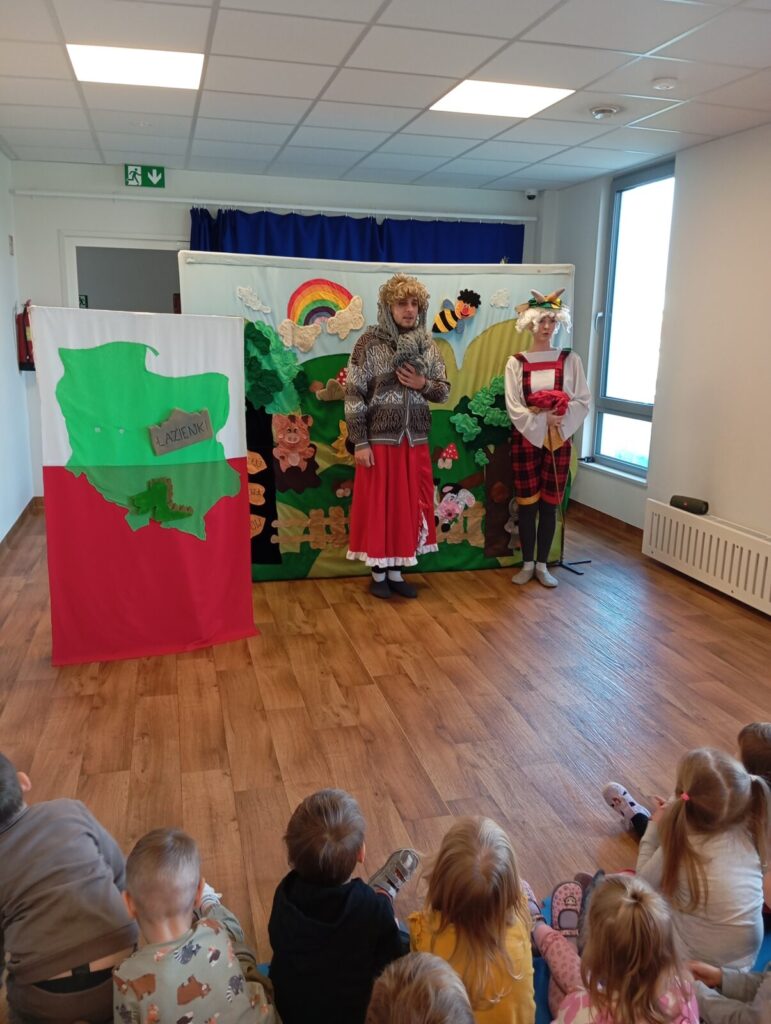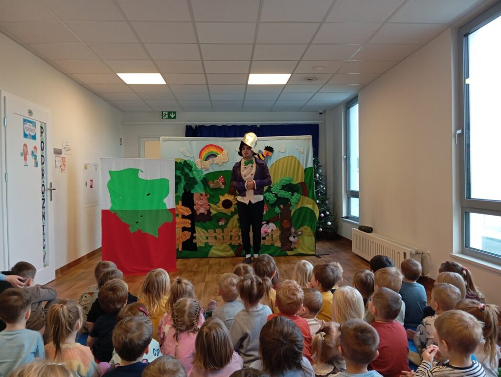„Jak Koziołek Matołek odkrył co to jest patriotyzm” – teatrzyk 2 grudnia 2025 przez przedszkole Zdjęcia przedstawiają dzieci podczas oglądania przestawienia teatralnego.