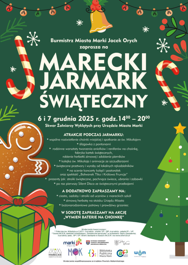 Jeśli zgłodniejecie możecie kupić świąteczne pyszności od lokalnych dostawców i ciasta od uczniów z mareckich szkół oraz rozgrzać się zimową herbatką serwowaną przez pracowników Urzędu Miasta Marki. Nie zabraknie też prawdziwego Mikołaja, konkursów, grzańca i słodyczy!
