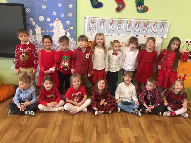 Wizyta Mikołaja 8 grudnia 2025 przez przedszkole Galeria zdjęć przedstawia przedszkolaki podczas wizyty Świętego Mikołaja.