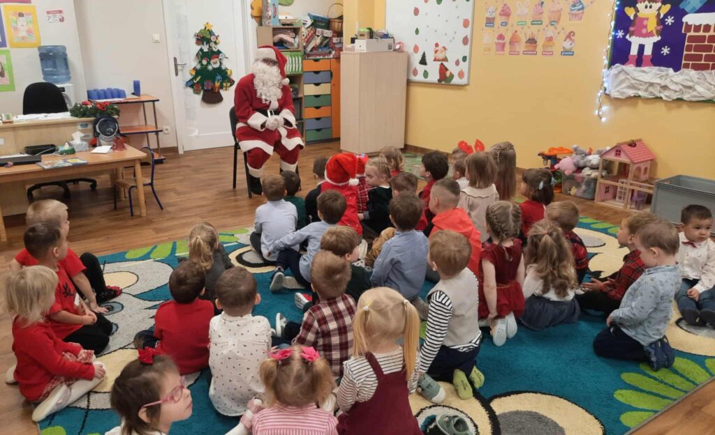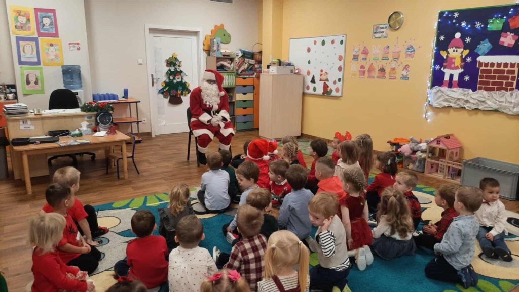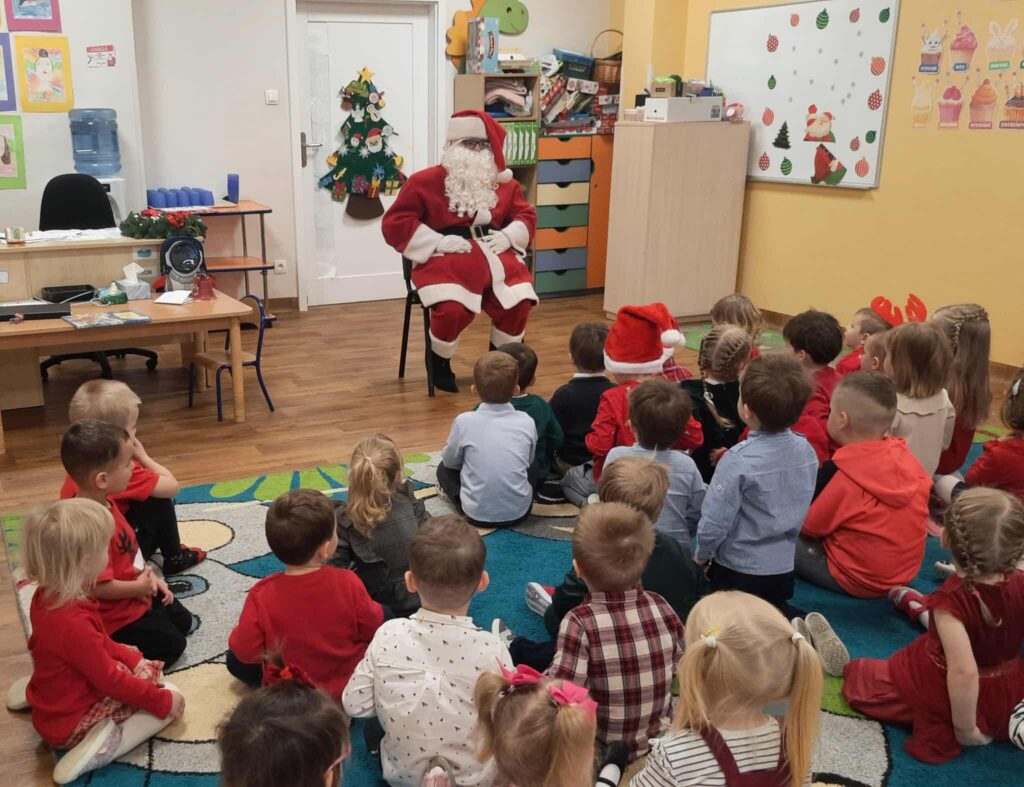Wizyta Świętego Mikołaja 10 grudnia 2025 przez przedszkole Galeria zdjęć przedstawia dzieci podczas odwiedzin Świętego Mikołaja w przedszkolu.