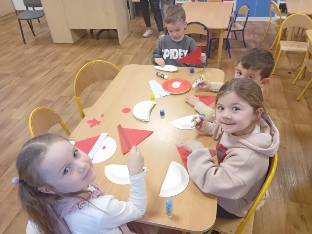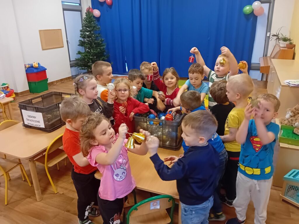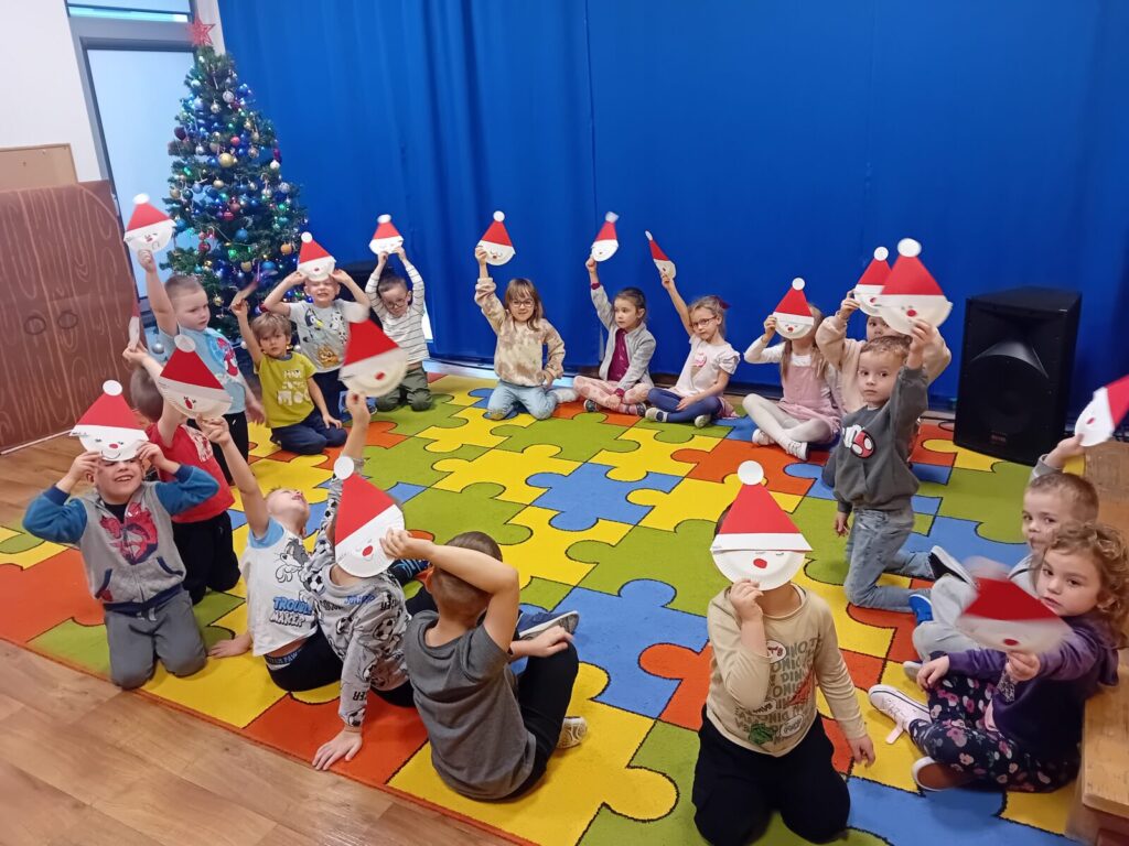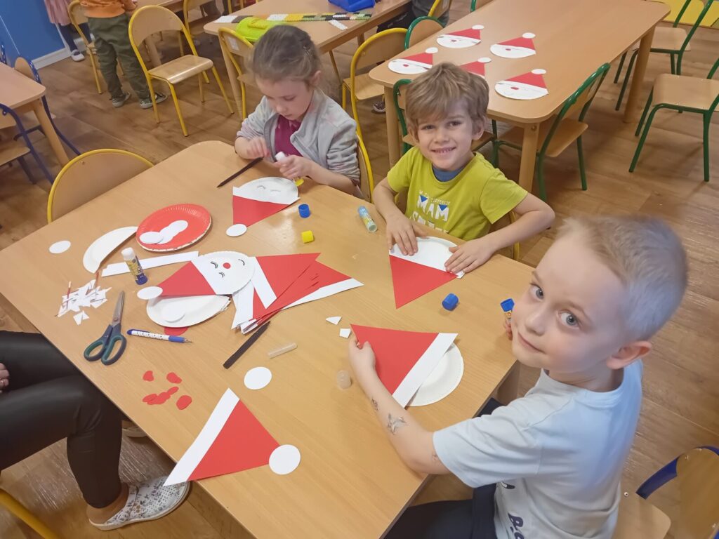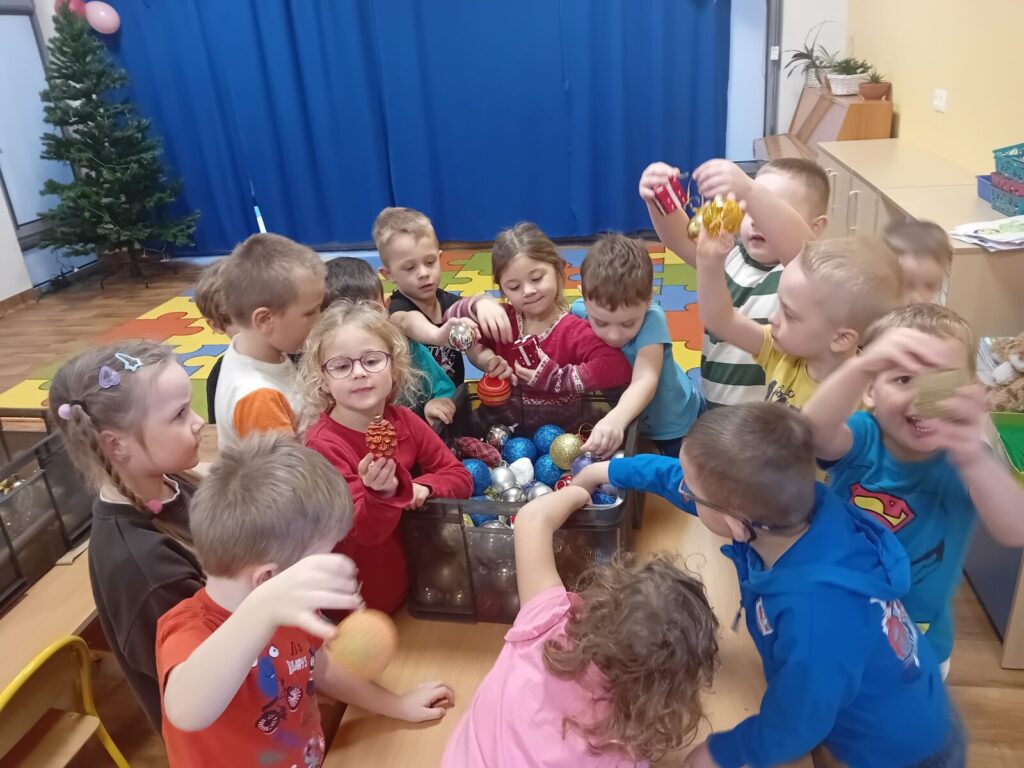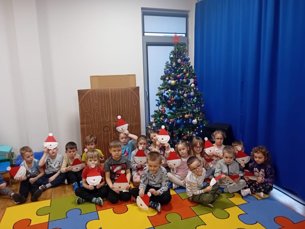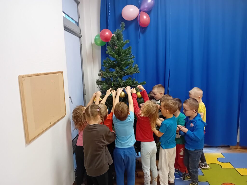 Galeria zdjęć przedstawia dzieci podczas przygotowań do spotkania z Mikołajem. Przedszkolaki samodzielnie ubrały choinkę oraz wykonały pracę plastyczną pt. ,,Santa Clous”, słuchając w ramach programu Dwujęzyczny Przedszkolak piosenki, ,,Christmas time”