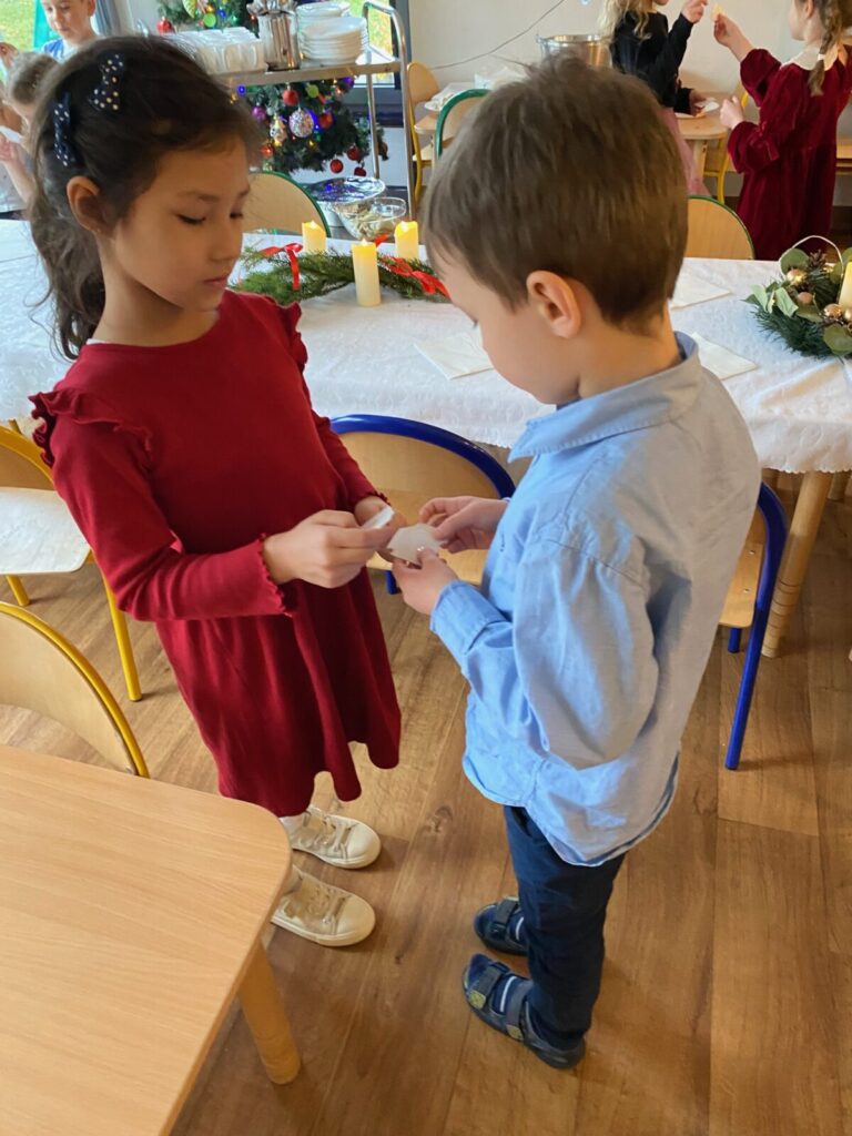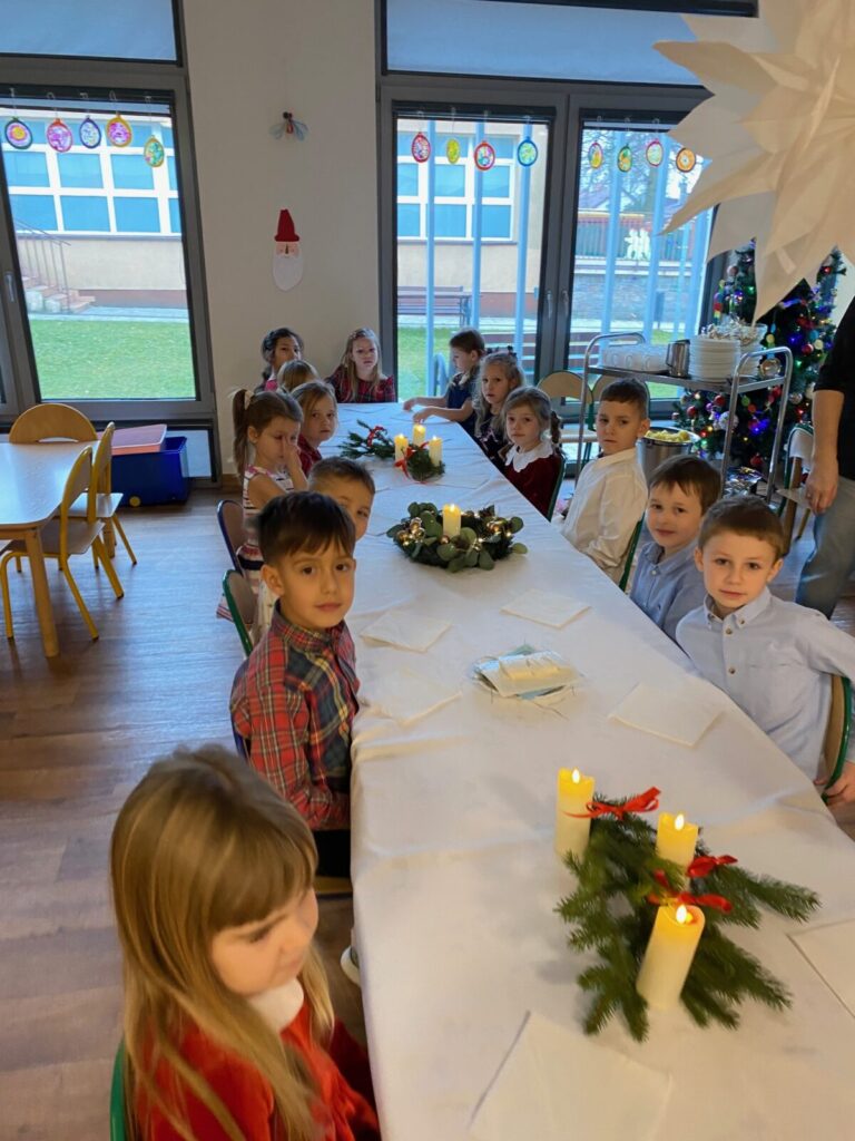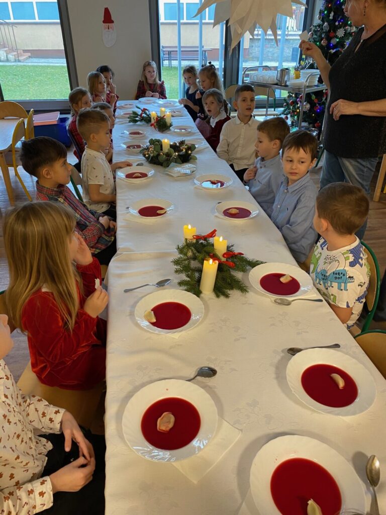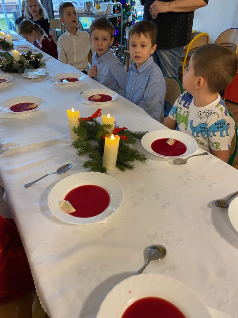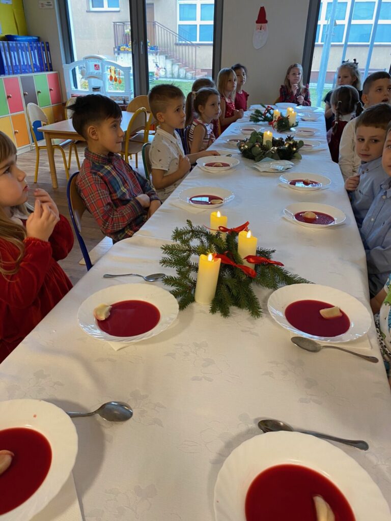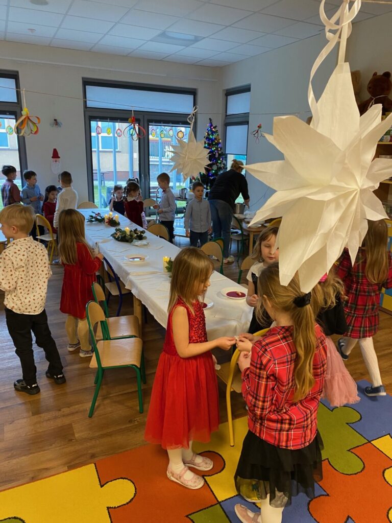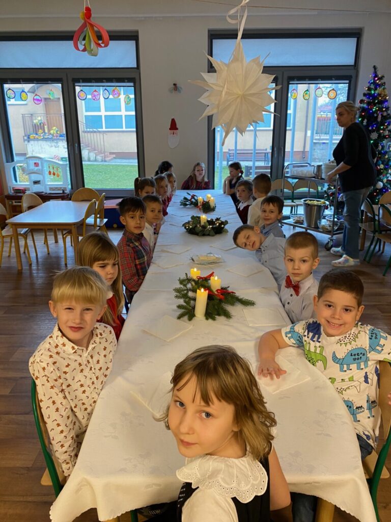 Uroczysty obiad wigilijny 28 grudnia 2025 przez przedszkole Zdjęcia przedstawiają dzieci podczas obiadu wigilijnego