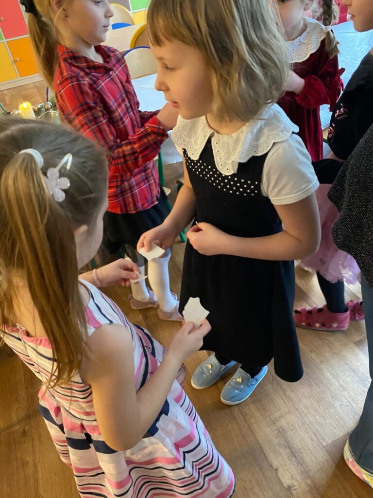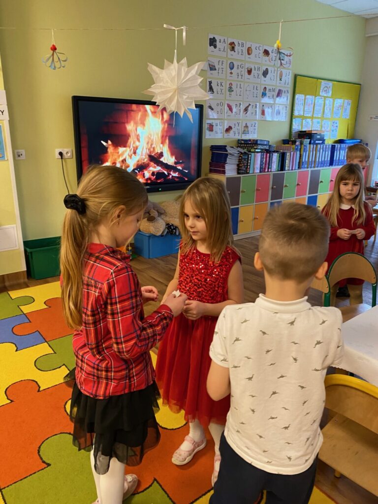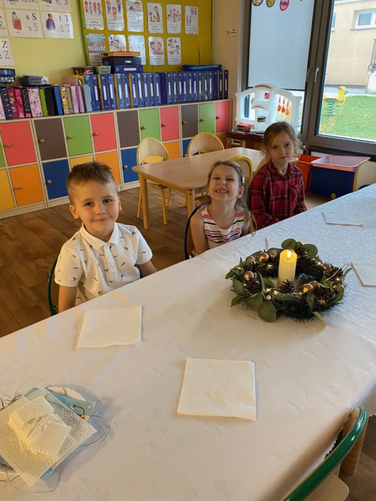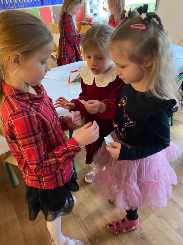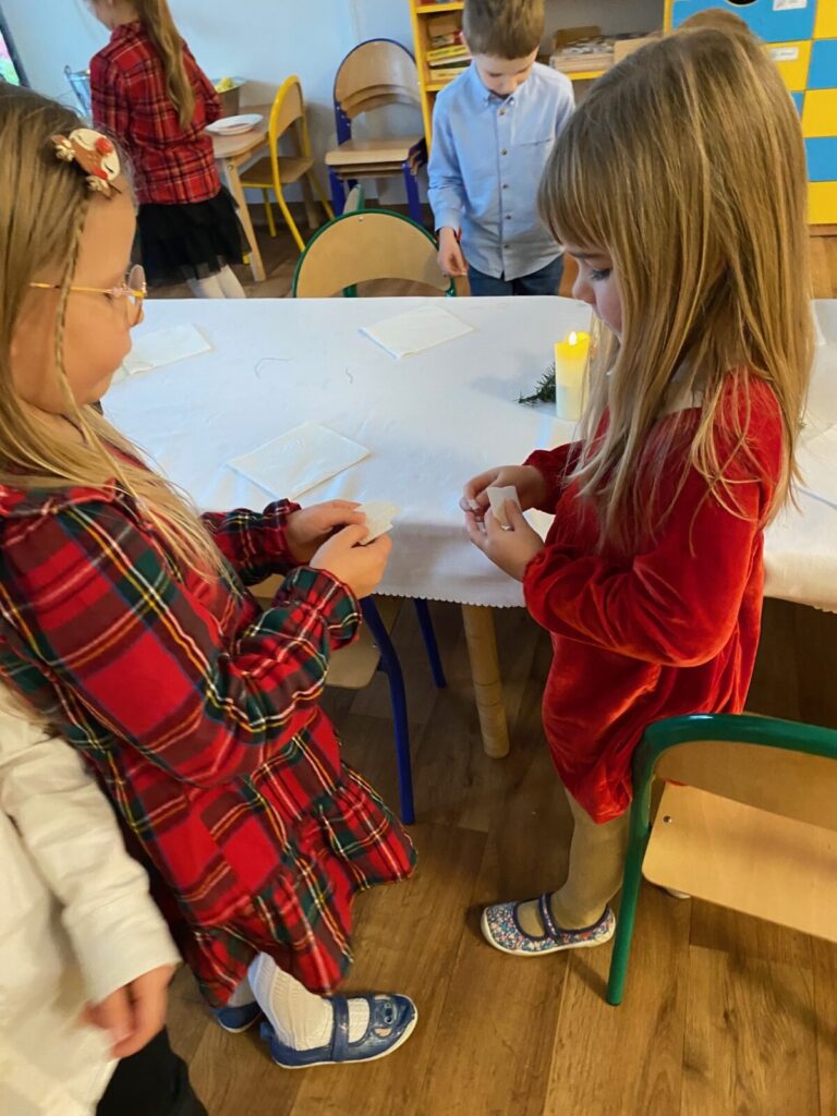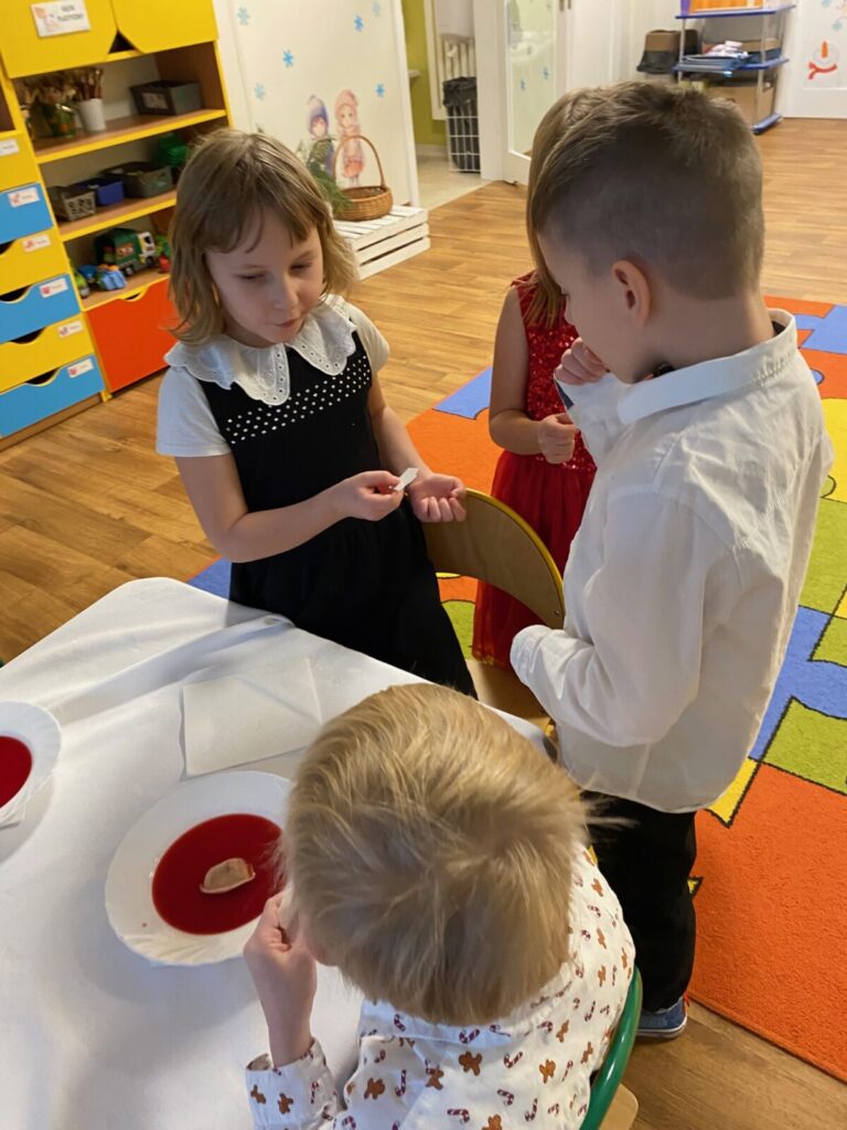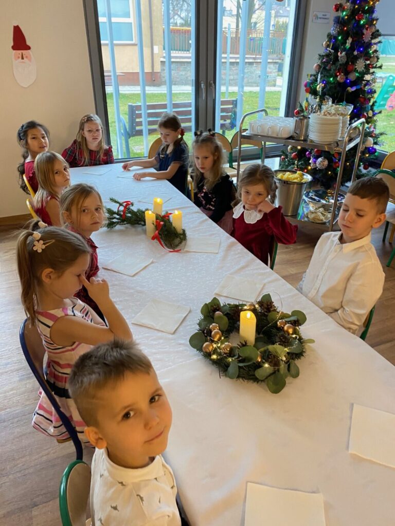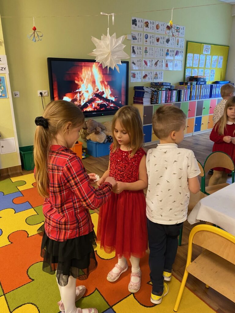 Uroczysty obiad wigilijny 28 grudnia 2025 przez przedszkole Zdjęcia przedstawiają dzieci podczas obiadu wigilijnego