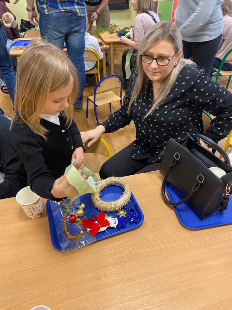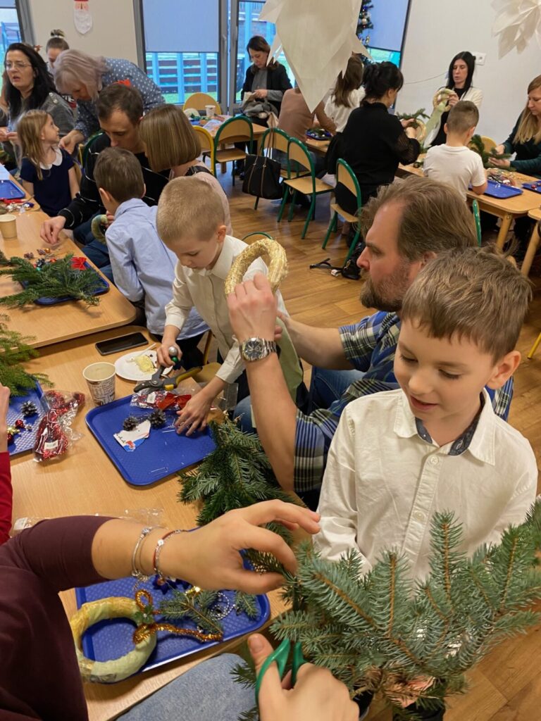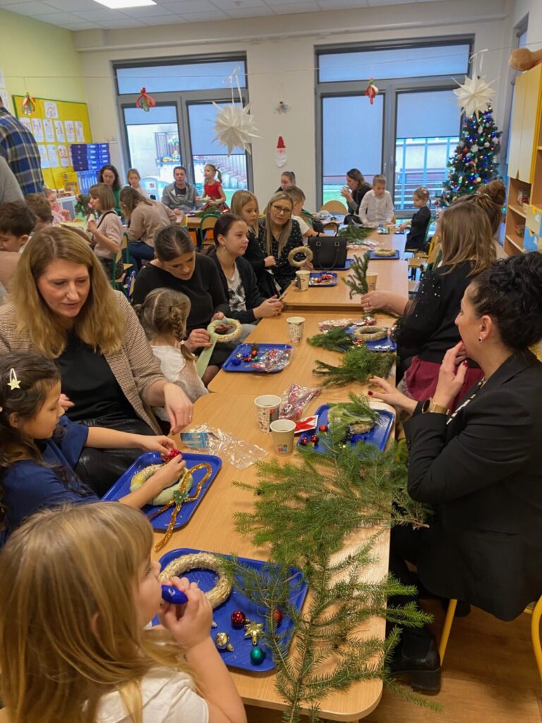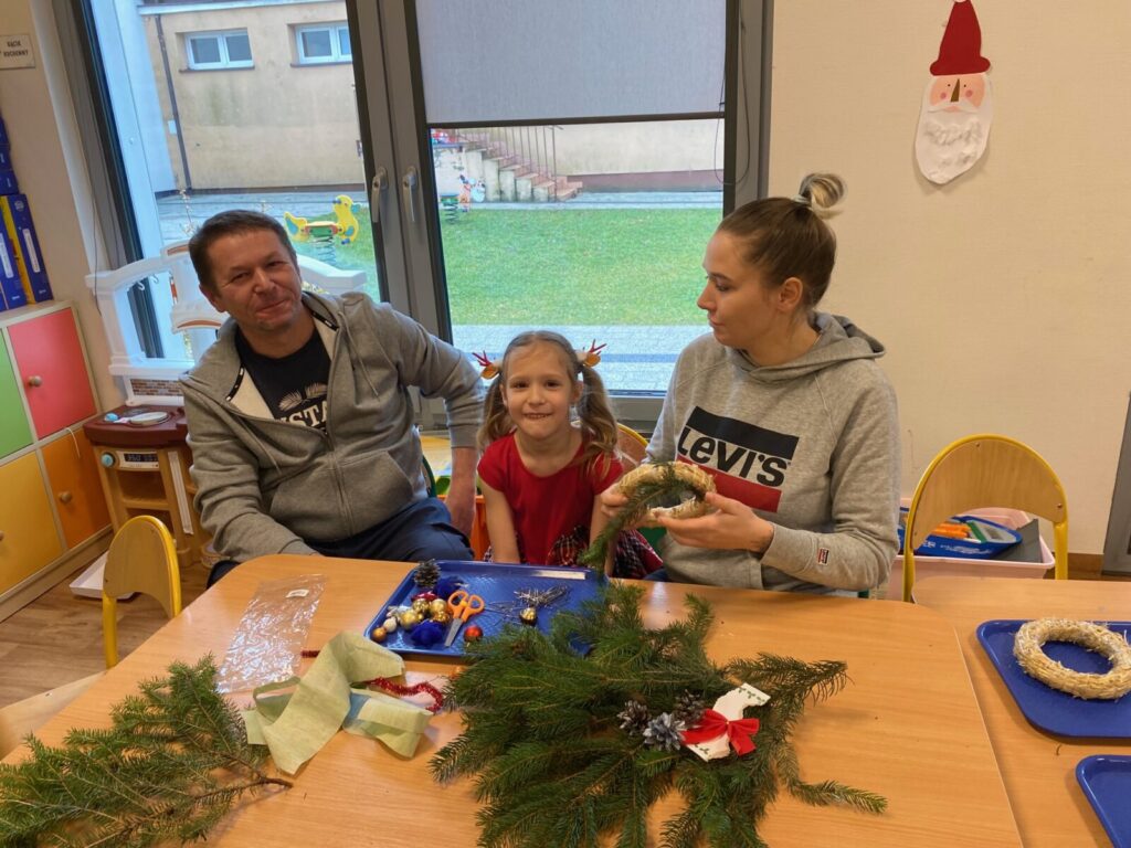 Warsztaty świąteczne z rodzicami 28 grudnia 2025 przez przedszkole Zdjęcia przedstawiają dzieci i rodziców podczas wspólnego wykonania wieńca świątecznego