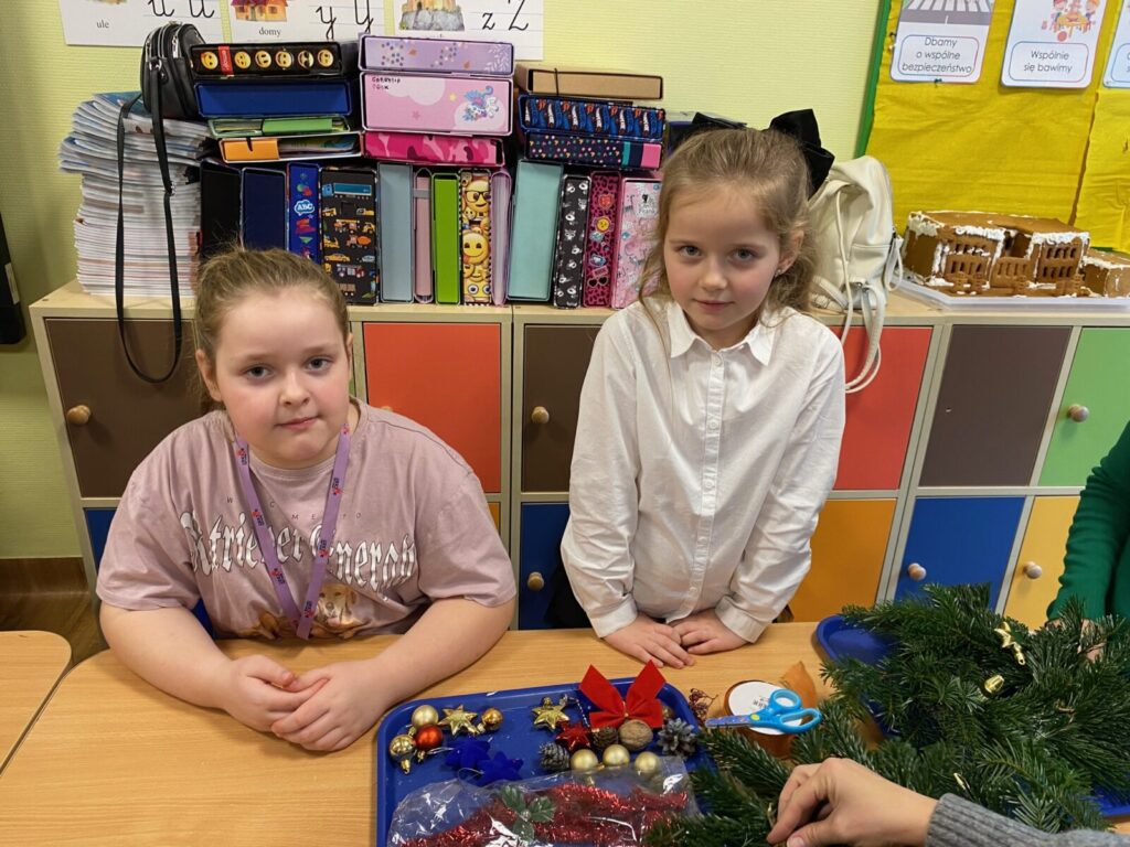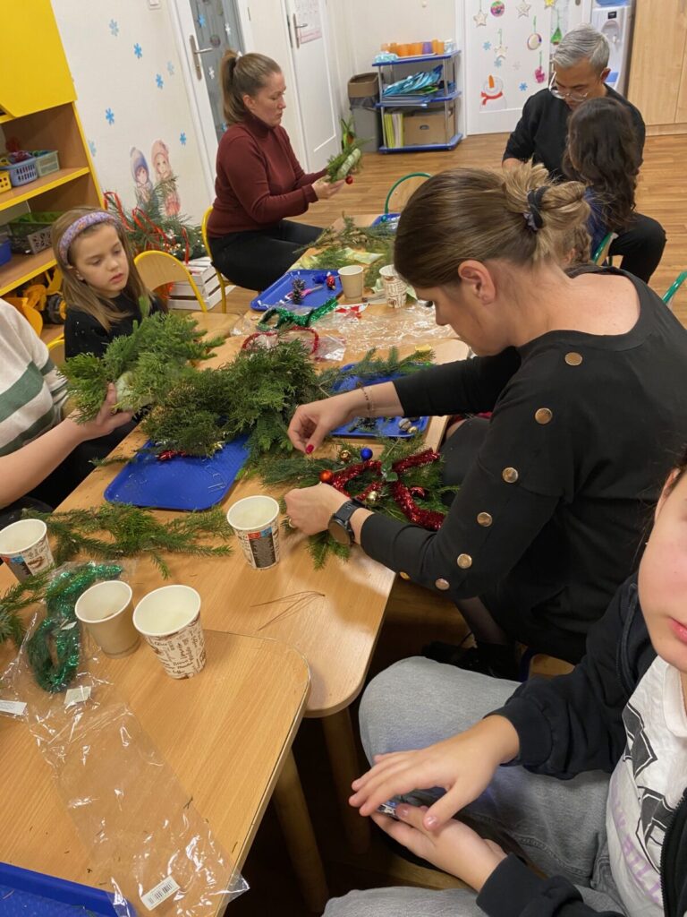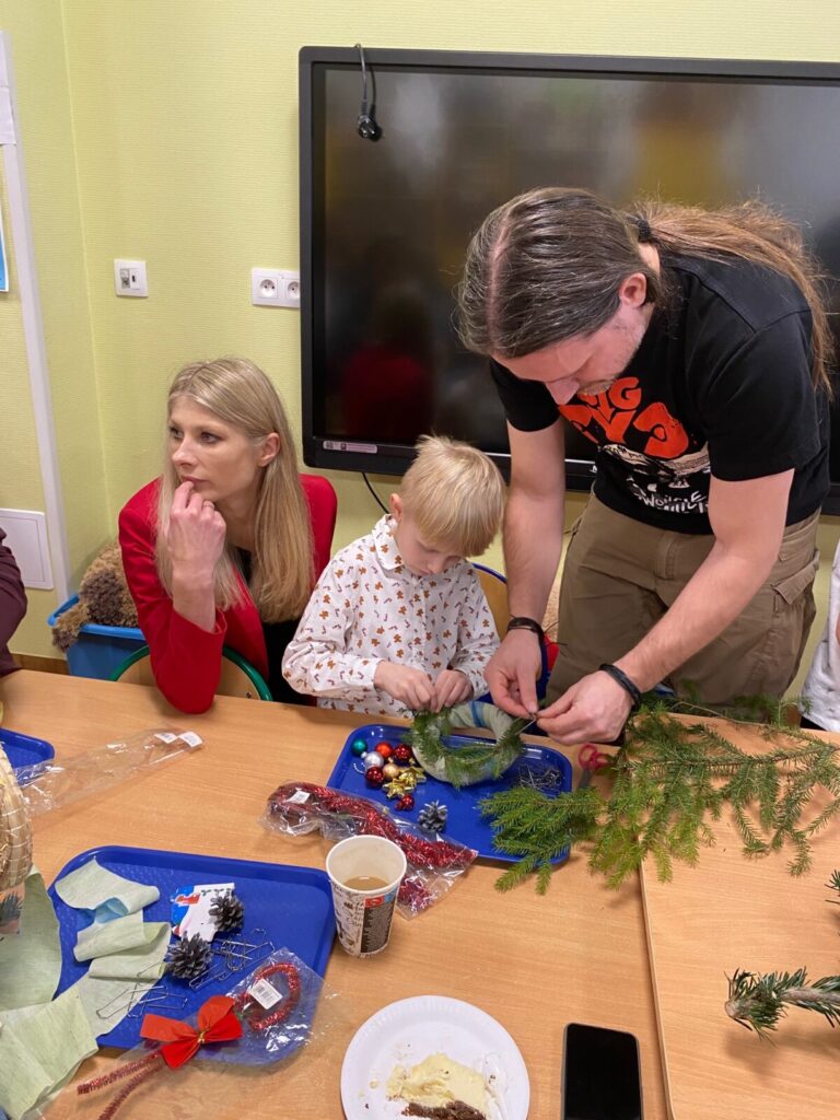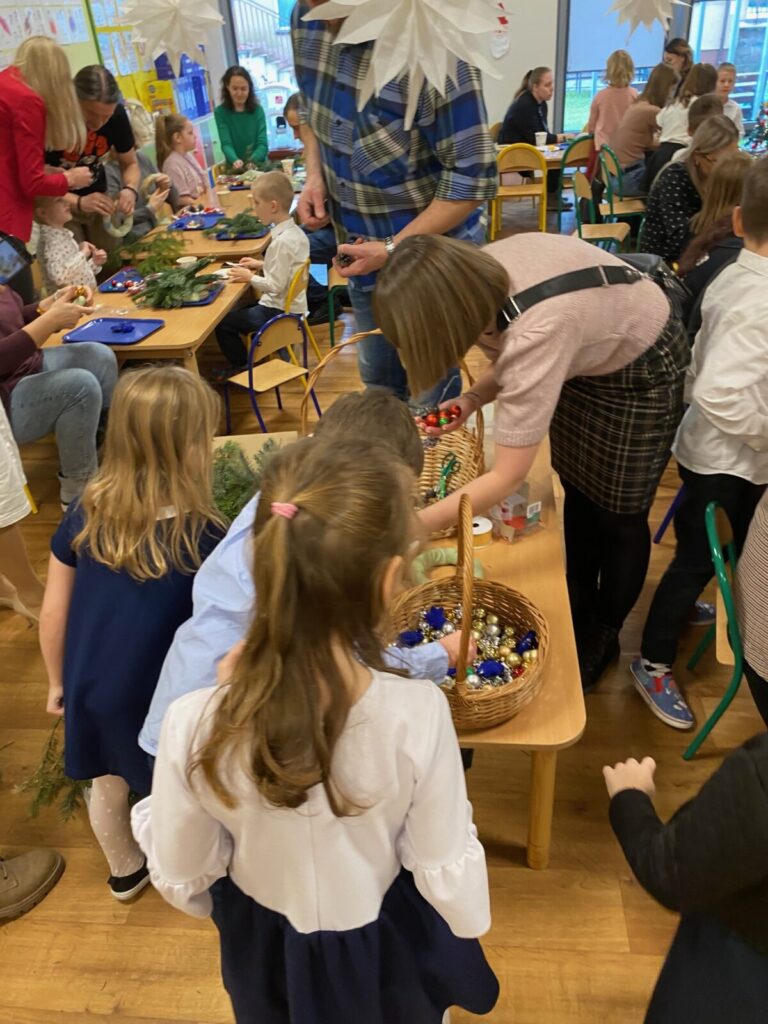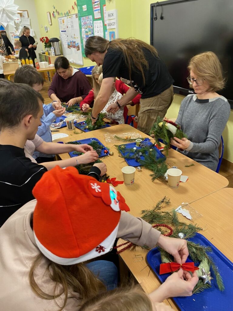 Warsztaty świąteczne z rodzicami 28 grudnia 2025 przez przedszkole Zdjęcia przedstawiają dzieci i rodziców podczas wspólnego wykonania wieńca świątecznego