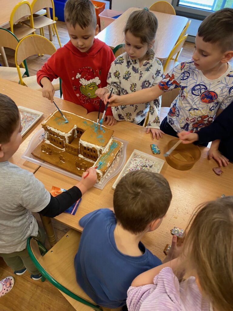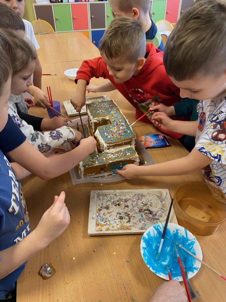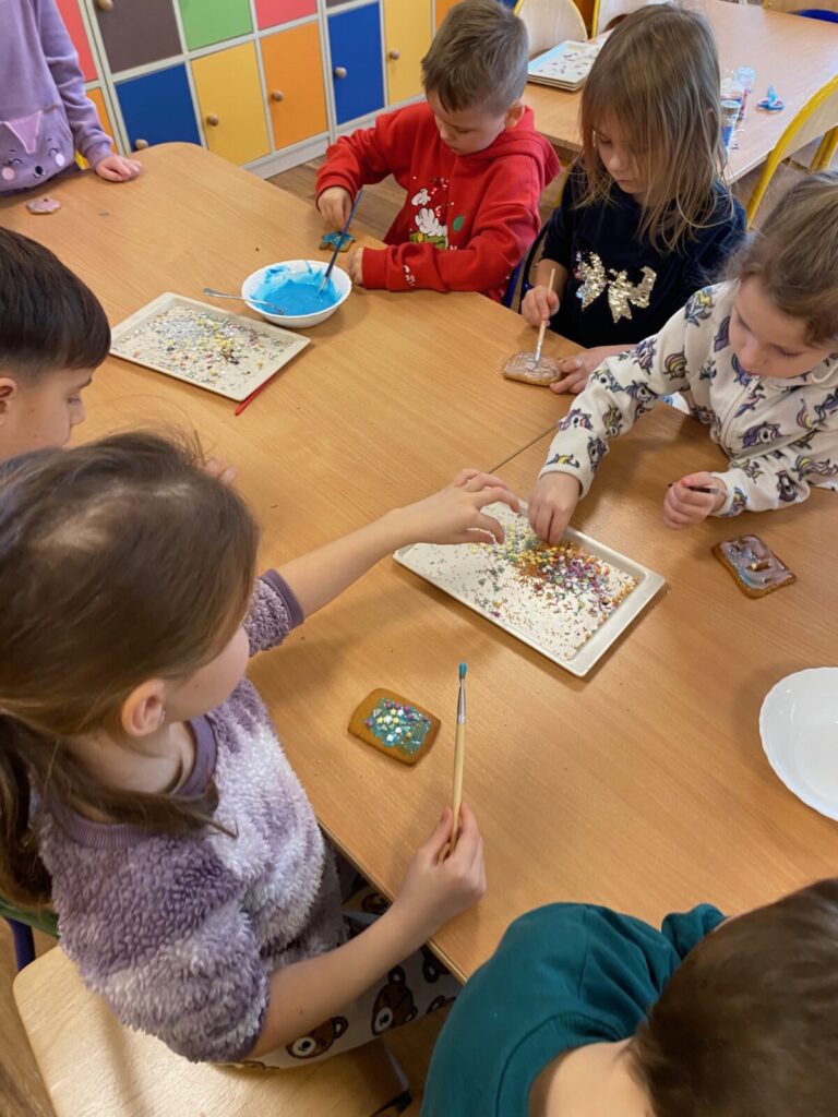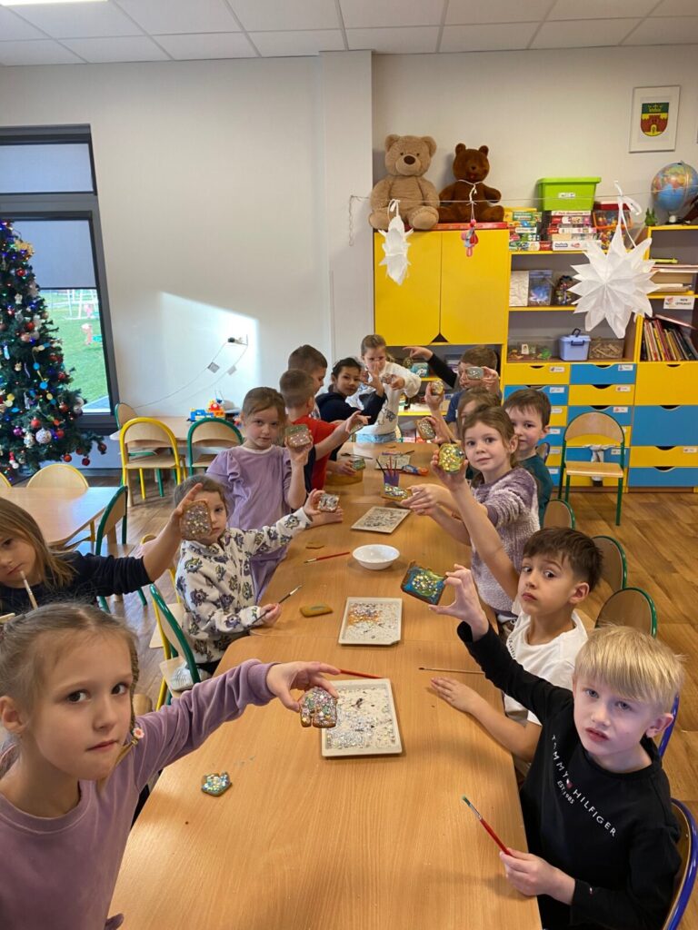 Wspólne piernikowanie 28 grudnia 2025 przez przedszkole Zdjęcia przedstawiają dzieci podczas dekorowania pierniczków