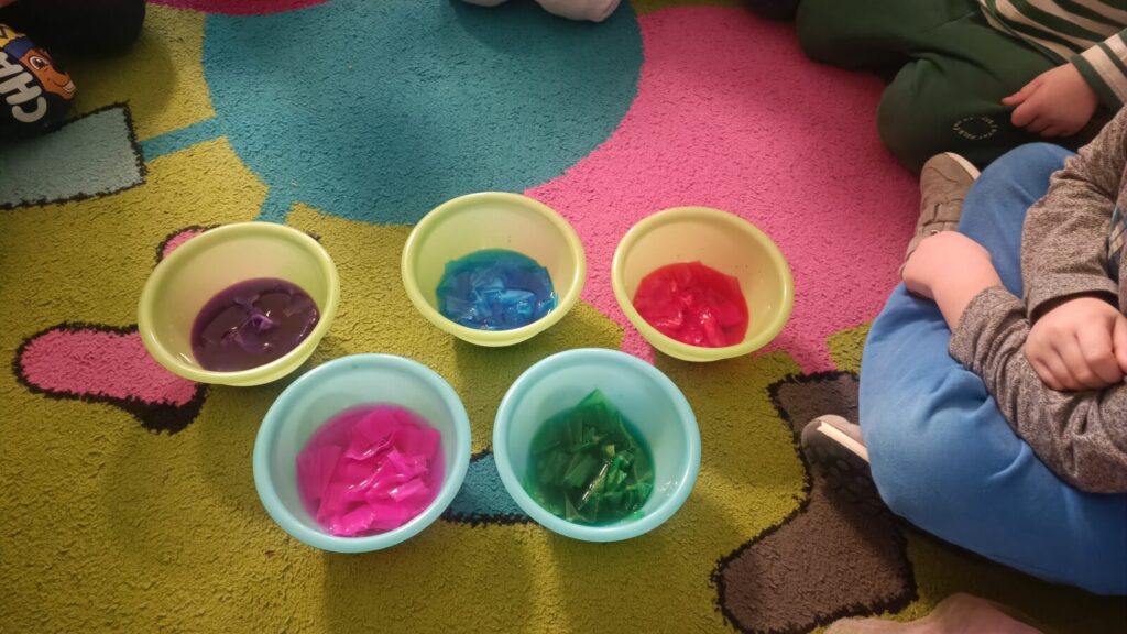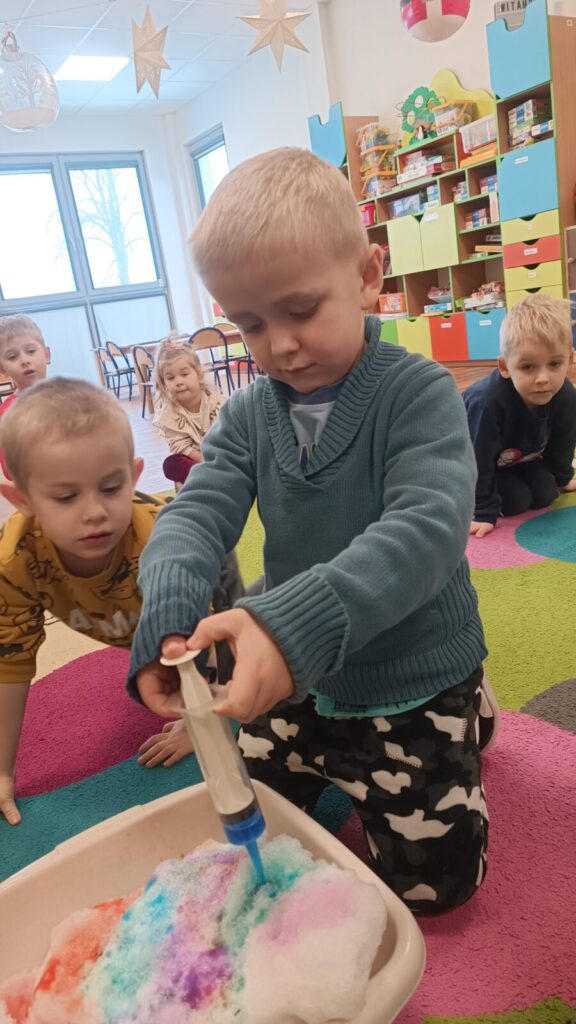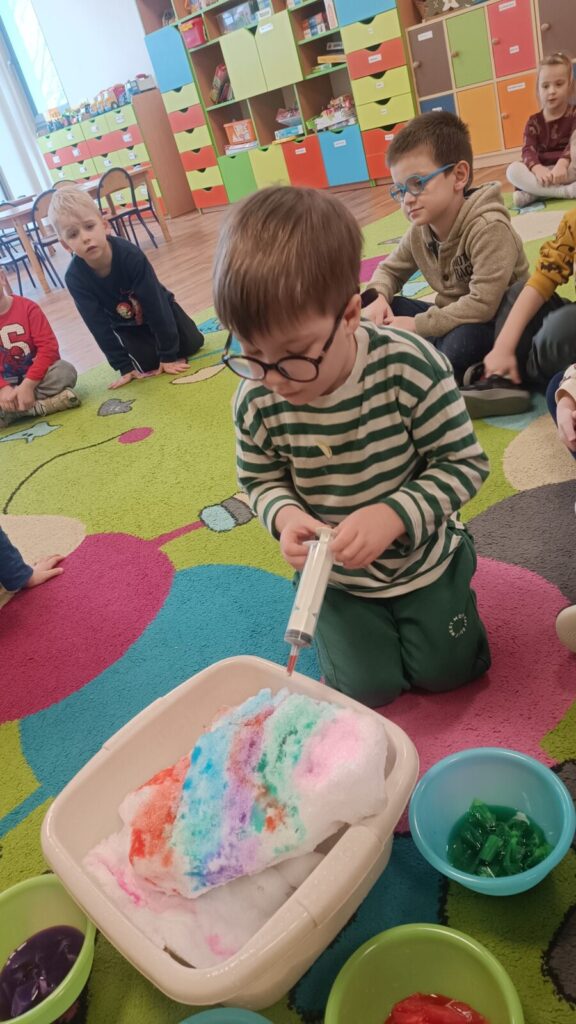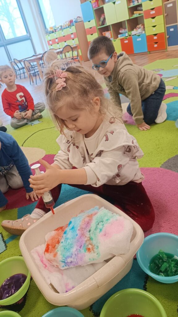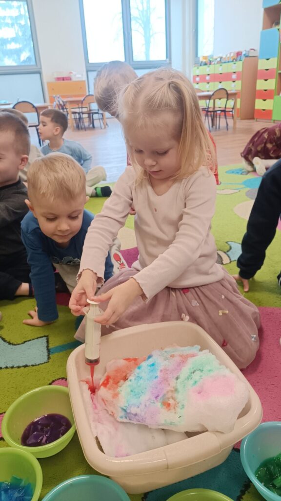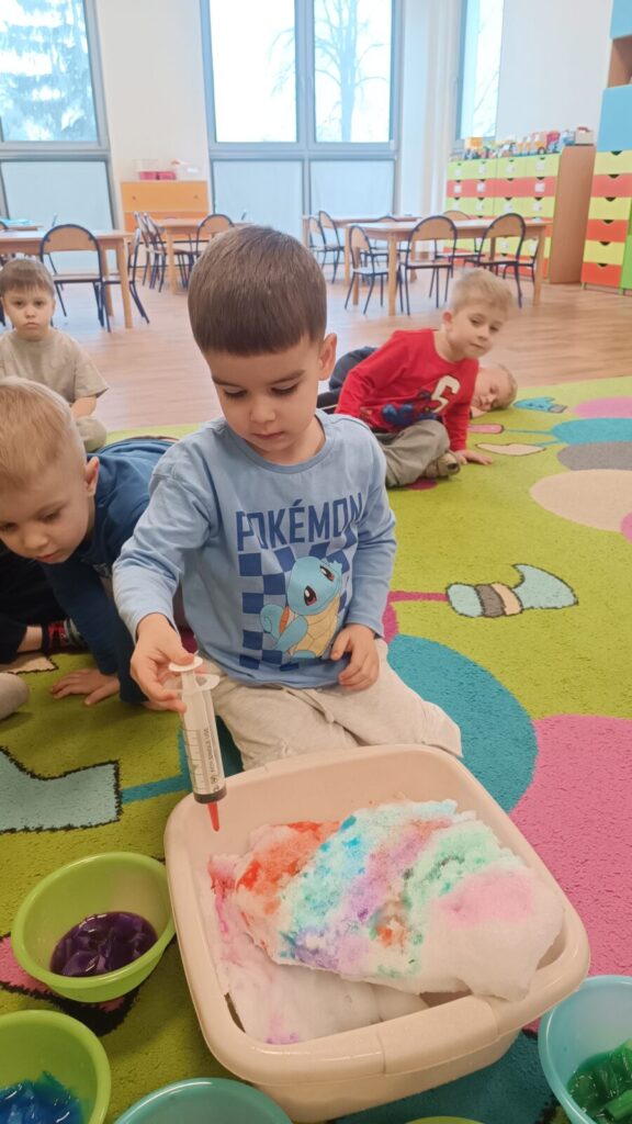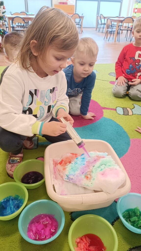 Tropiciele dzisiaj sprawdzały czy krepina zafarbuje wodę, później sprawdzaliśmy jak farbowana woda zmieni śnieg, a na koniec obserwowaliśmy roztopy śniegu.